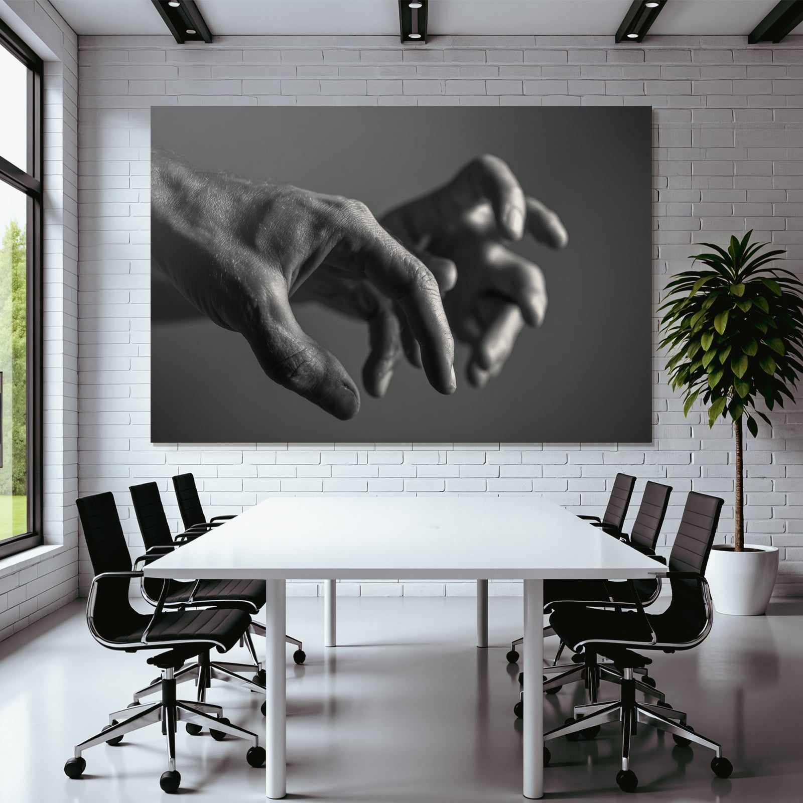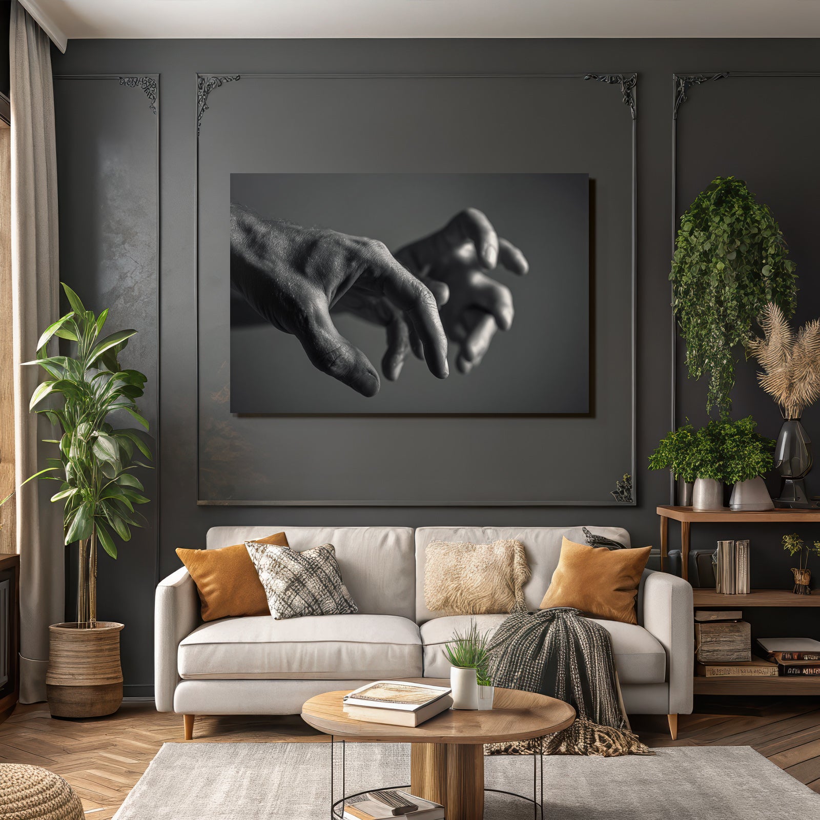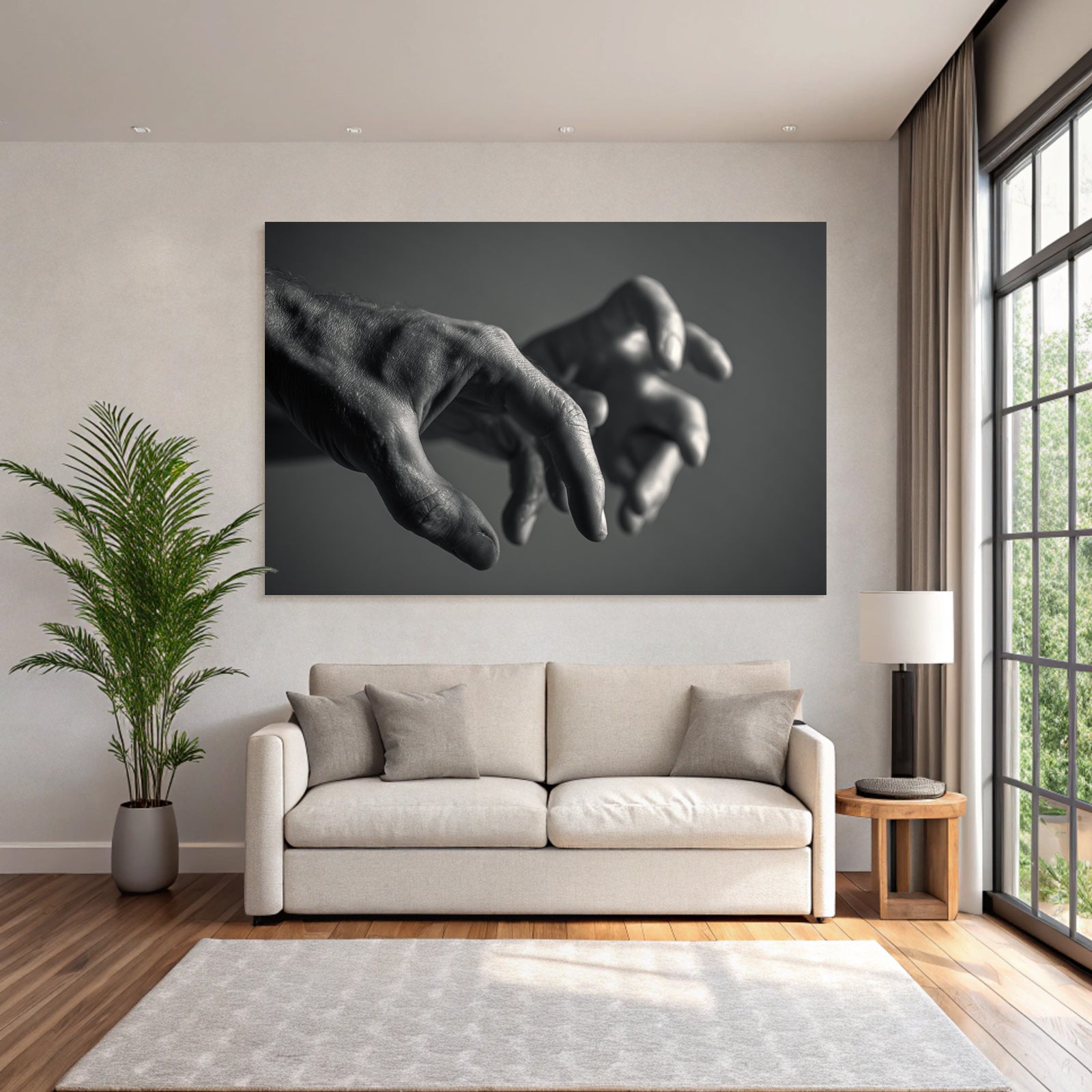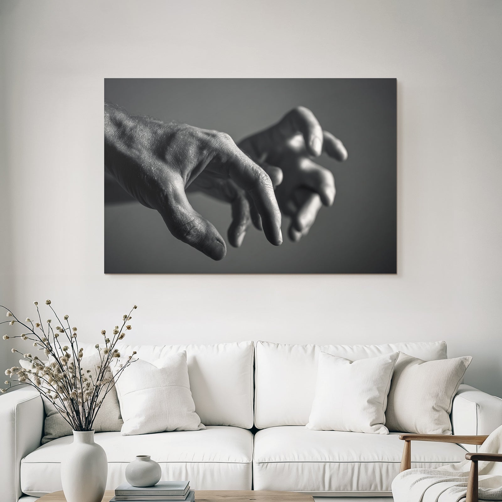 Erlebe Kunst im Stil Hände und Gestik neu: „Ausdrucksvolle Hände In Schwarz Weiss Detailaufnahme“ wird durch den eleganten FameFrame™ zum Blickfang in jedem Raum.