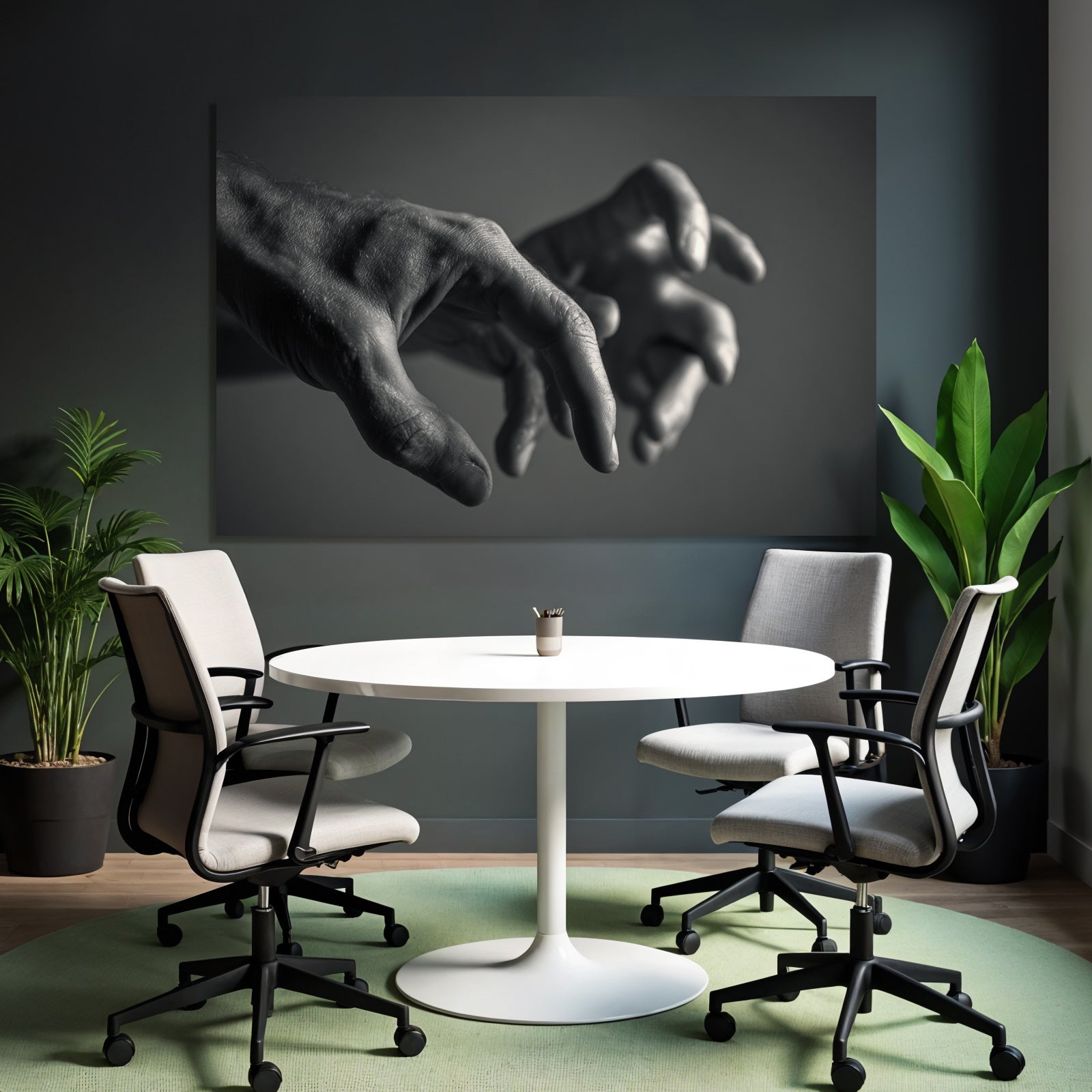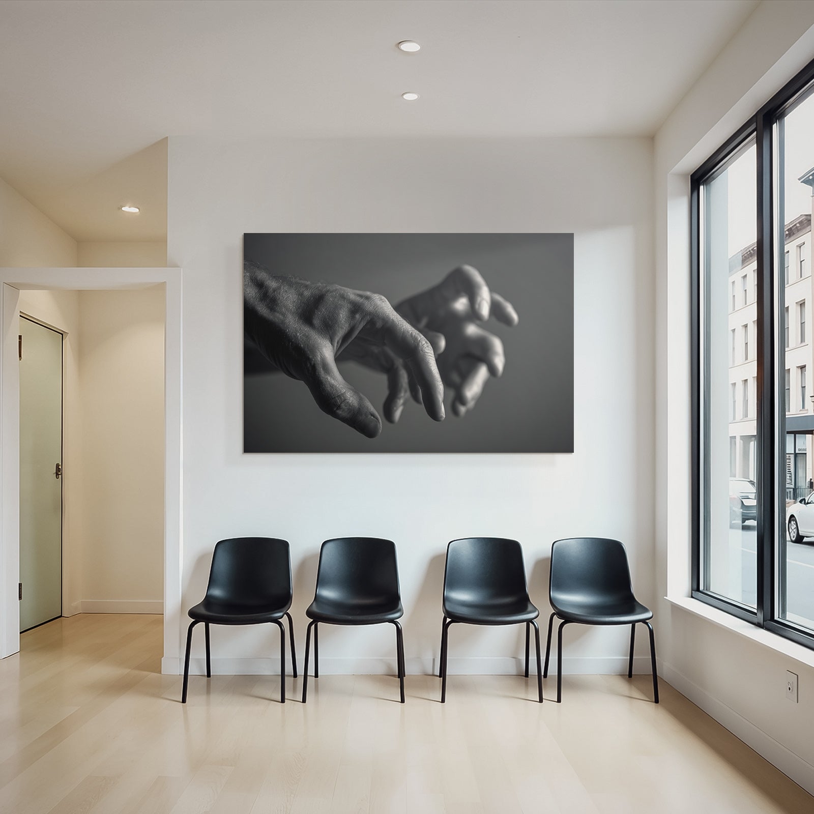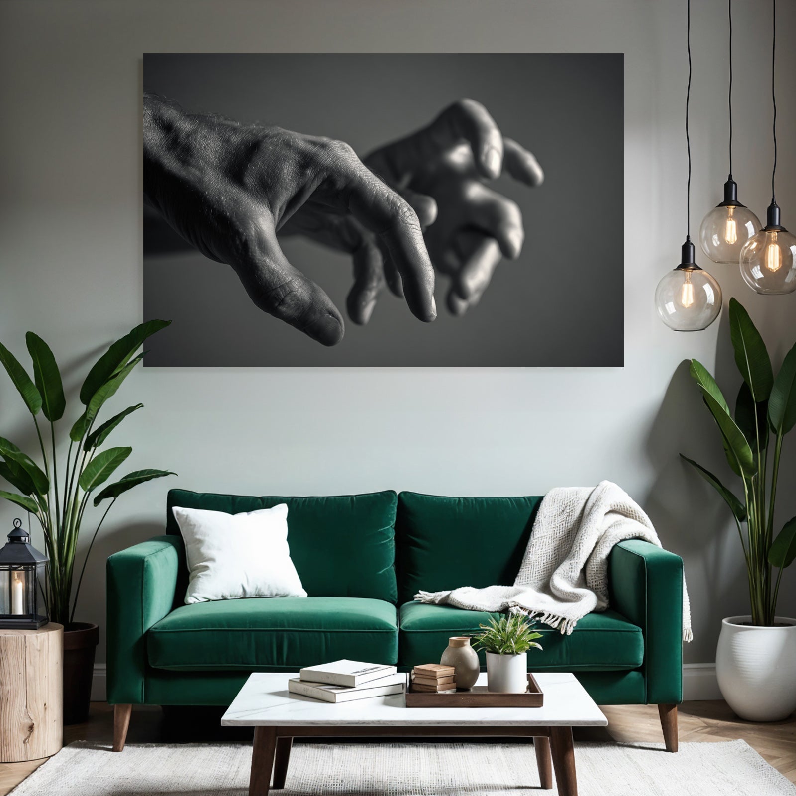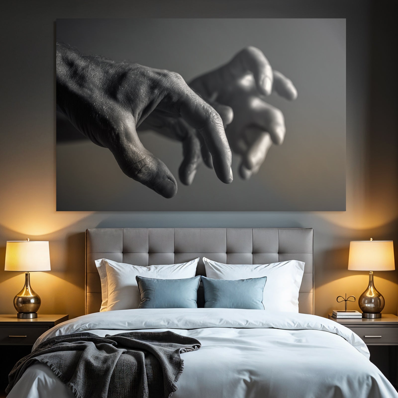 Erlebe Kunst im Stil Hände und Gestik neu: „Ausdrucksvolle Hände In Schwarz Weiss Detailaufnahme“ wird durch den eleganten FameFrame™ zum Blickfang in jedem Raum.