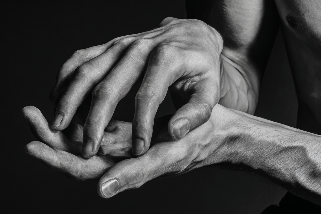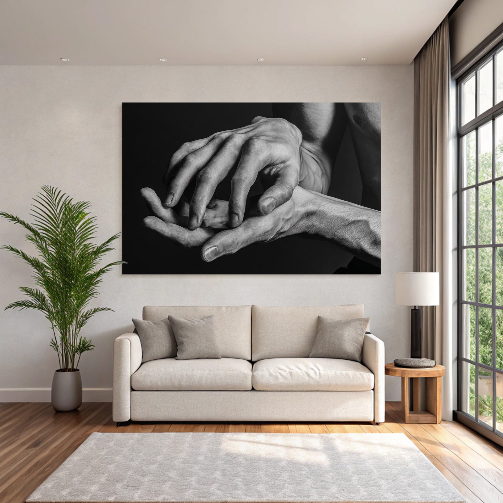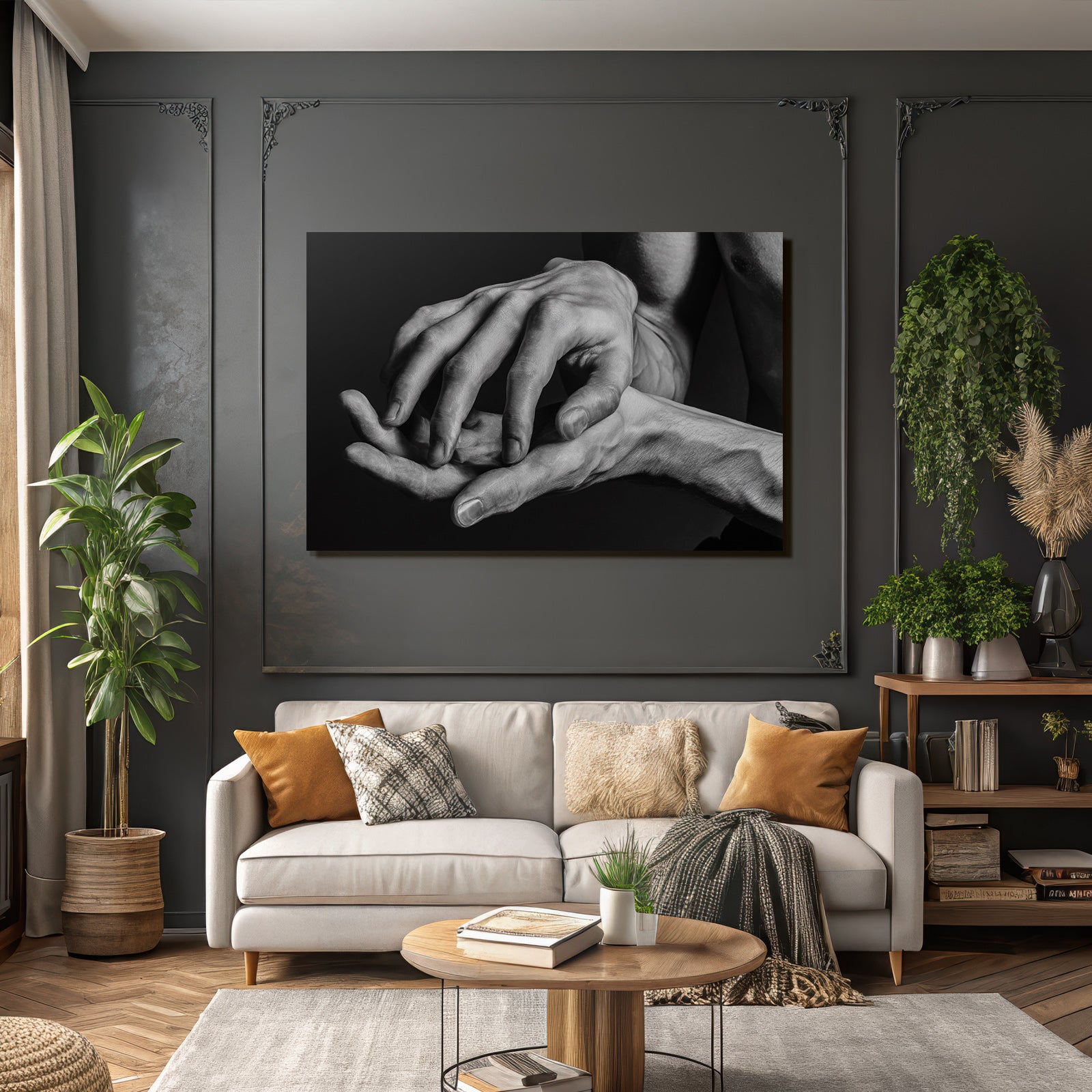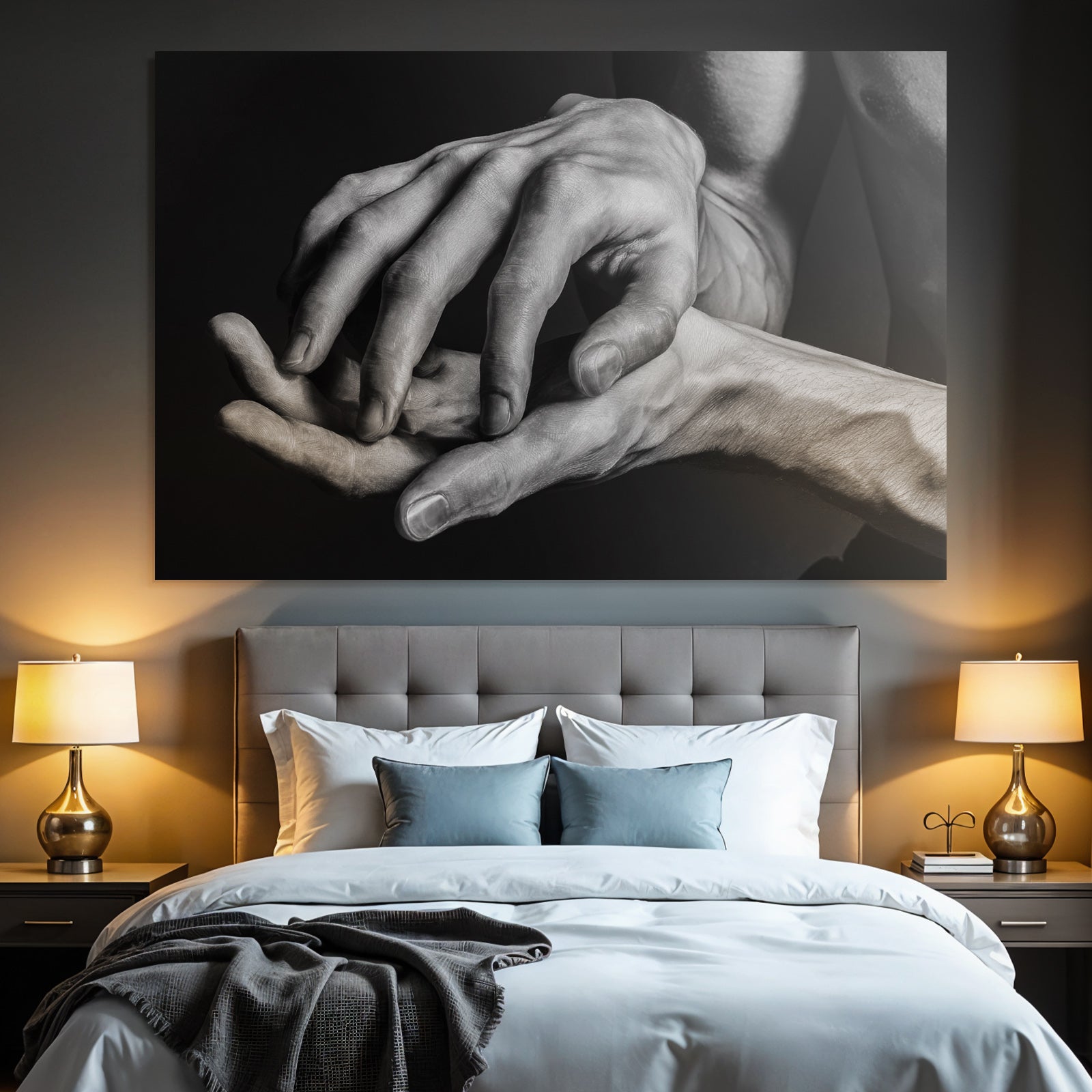 Verwandeln Sie Ihr Schlafzimmer in eine Oase der Ruhe. Das Motiv „Hände In Beziehung Sw Fotografie“ im Stil Hände und Gestik wirkt im FameFrame™ besonders harmonisch und beruhigend.