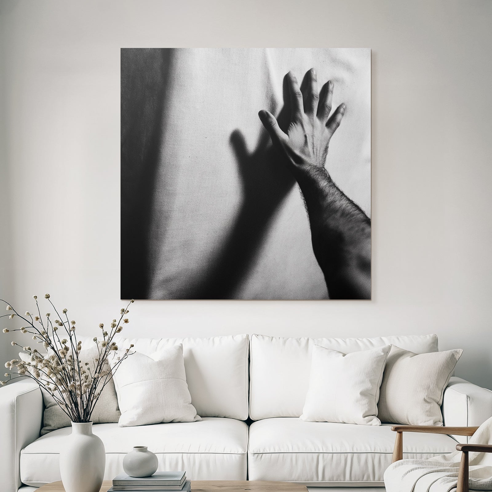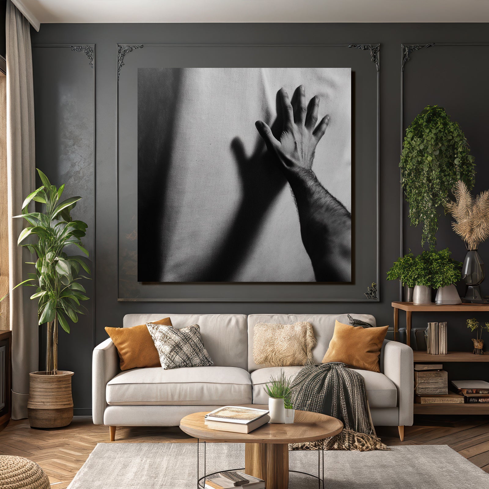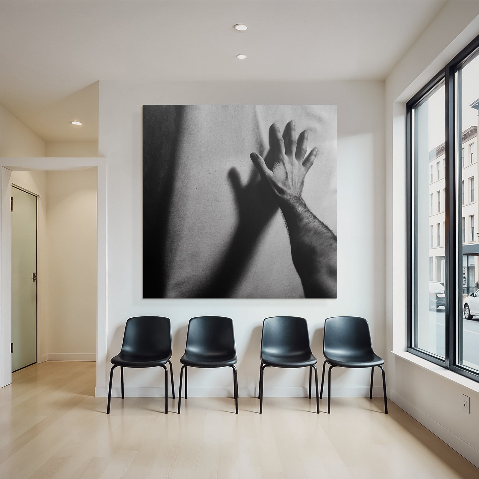 Einladend und professionell: Das Kunstwerk „Hand Die Auf Eine Oberfläche Zuführt Schatten Schwarz Und Weiss“ im Stil Hände und Gestik verleiht Ihrer Praxis oder Ihrem Wartezimmer im FameFrame™ eine exklusive Note.