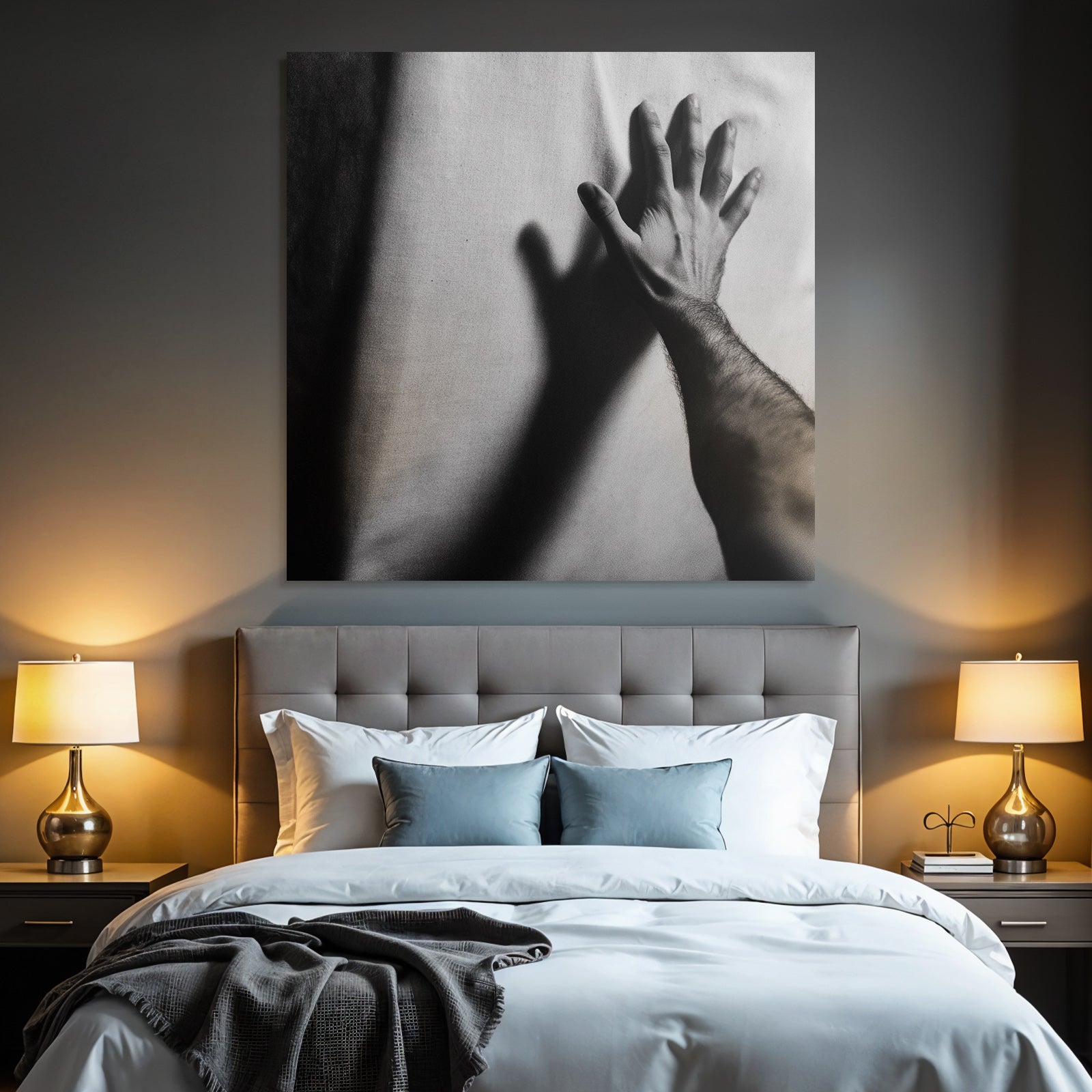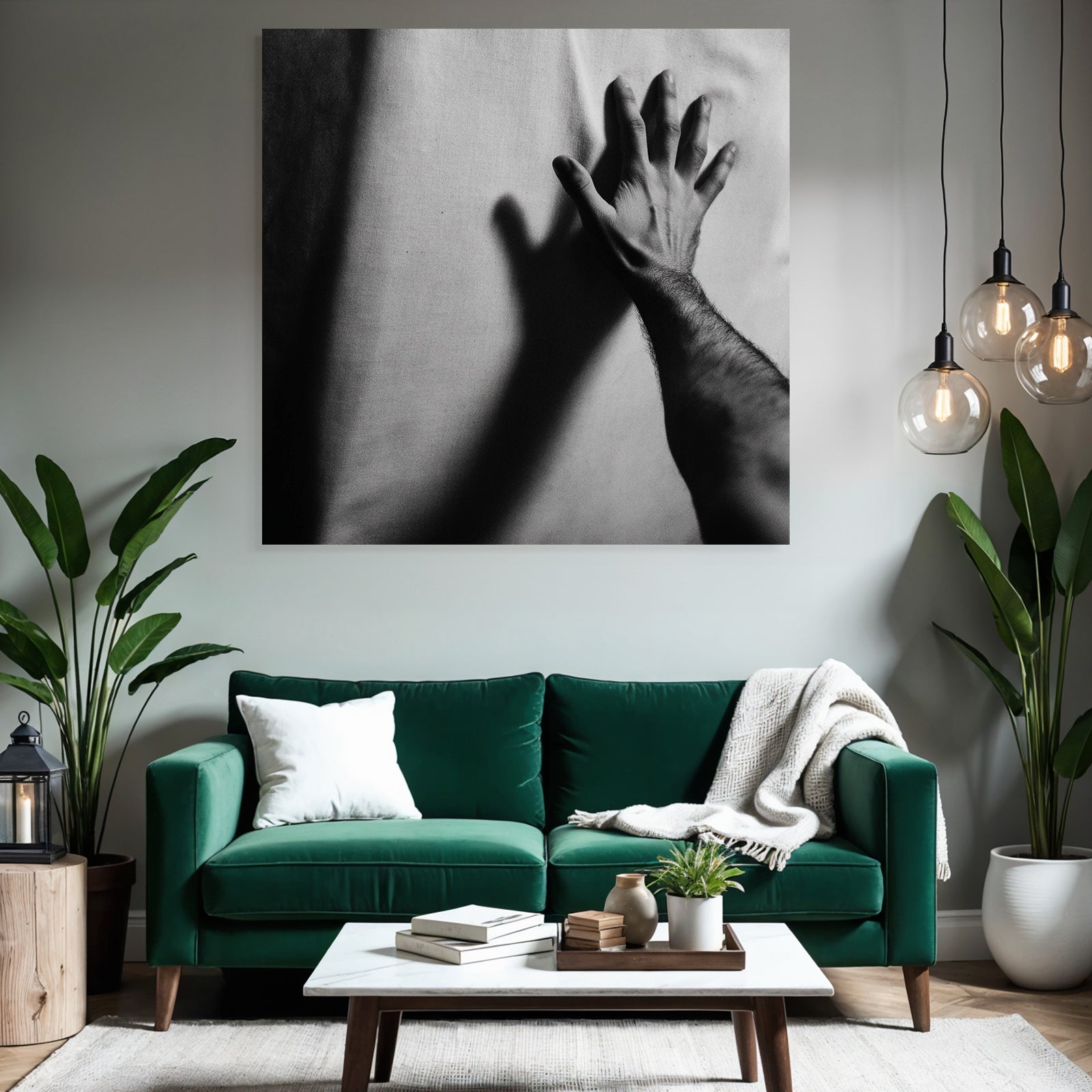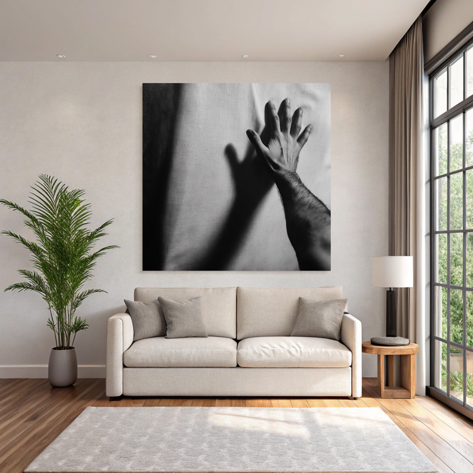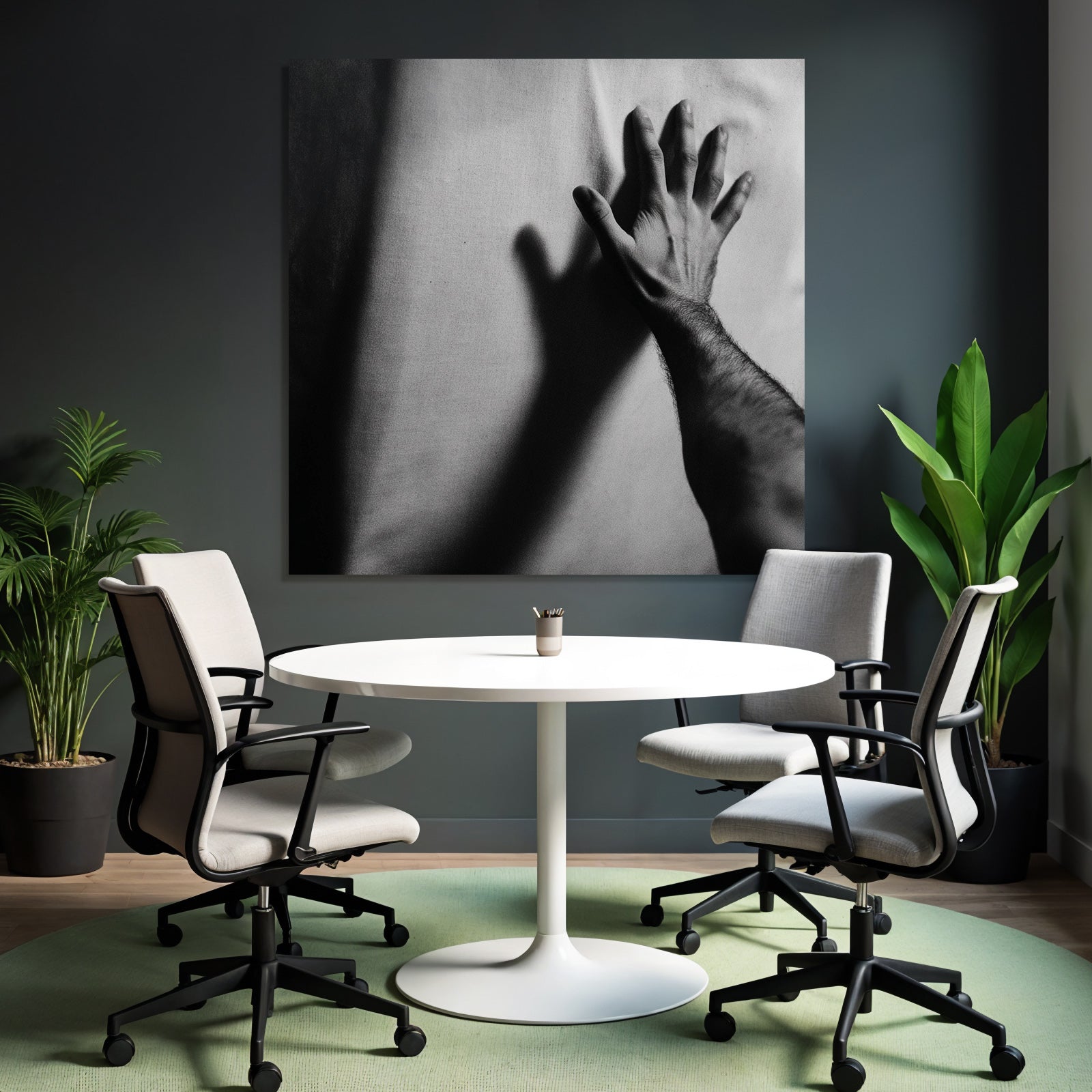 Einladend und professionell: Das Kunstwerk „Hand Die Auf Eine Oberfläche Zuführt Schatten Schwarz Und Weiss“ im Stil Hände und Gestik verleiht Ihrer Praxis oder Ihrem Wartezimmer im FameFrame™ eine exklusive Note.