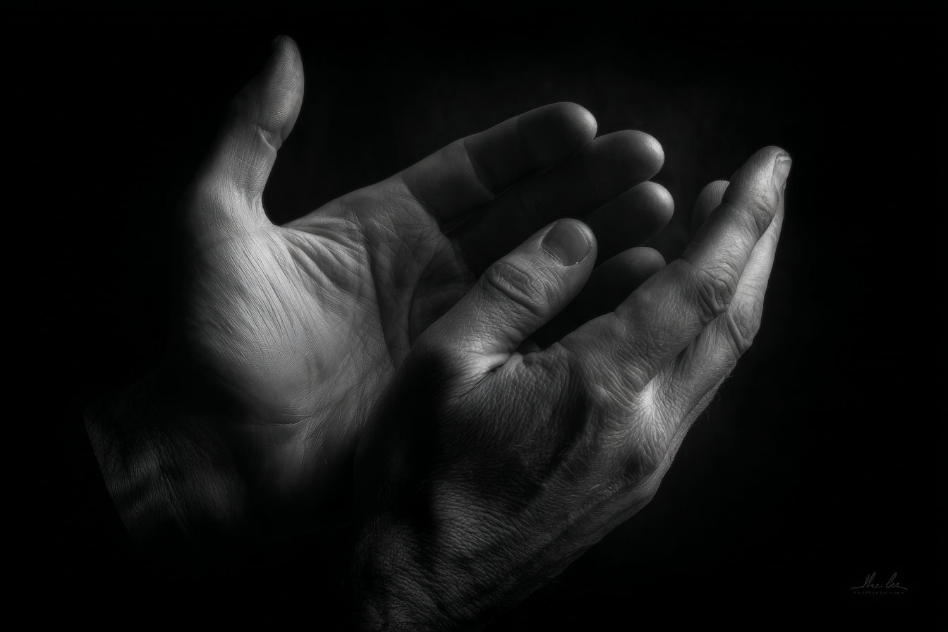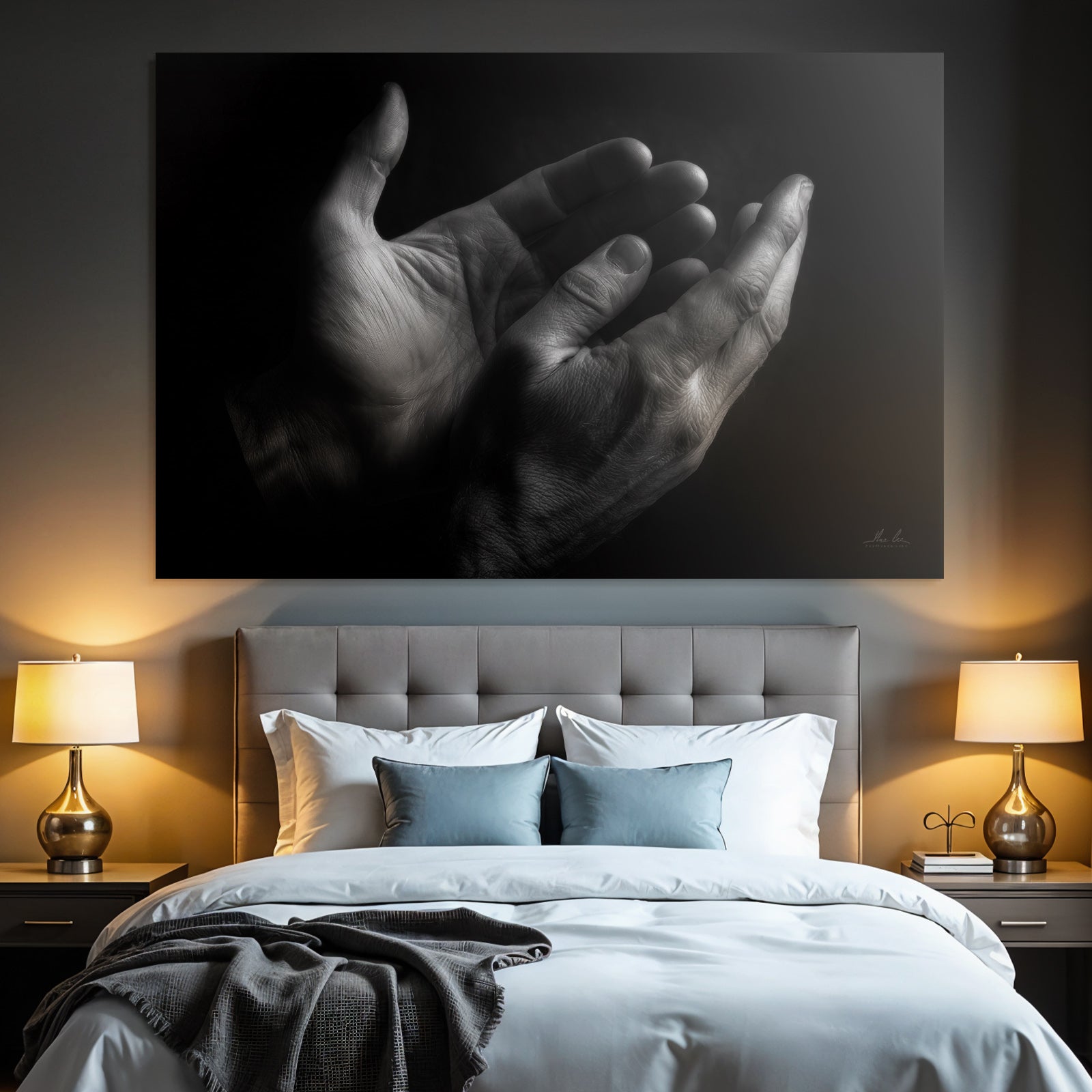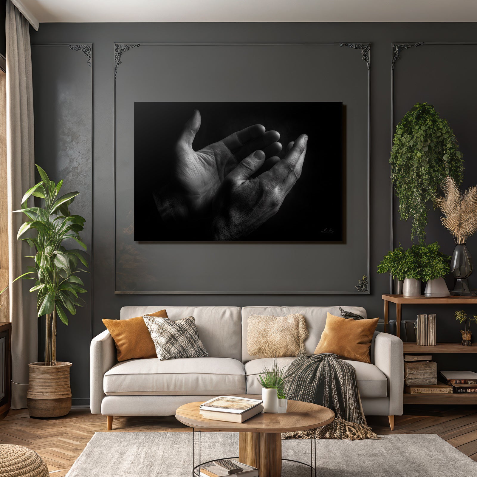 Das Kunstwerk „Offene Hände Kunstwerk Schwarz Weiss Dramatisch“ ist eine Hommage an den Stil Hände und Gestik. Im FameFrame™ kommt die Farbbrillanz und Detailtiefe des Motivs perfekt zur Geltung.