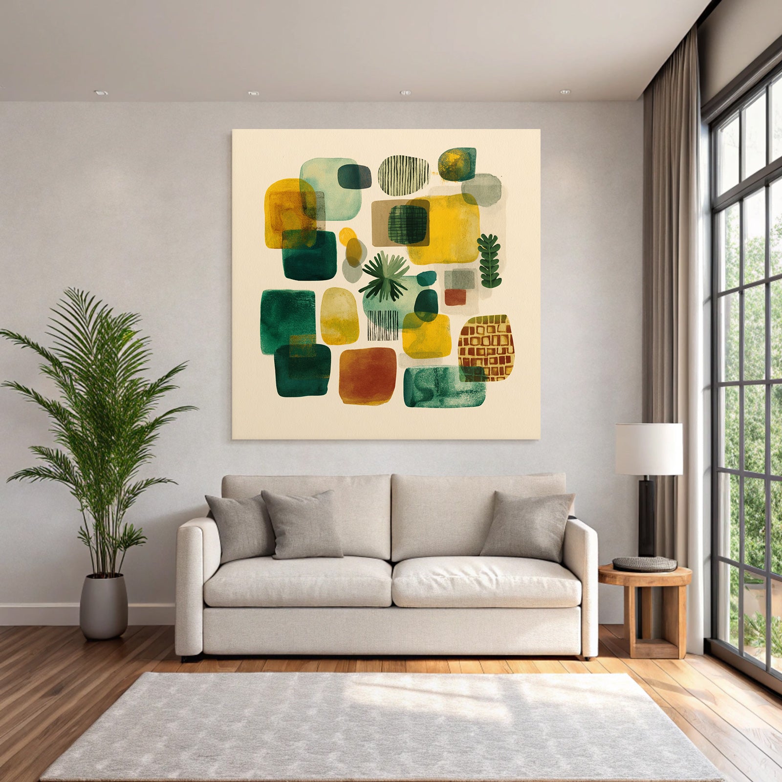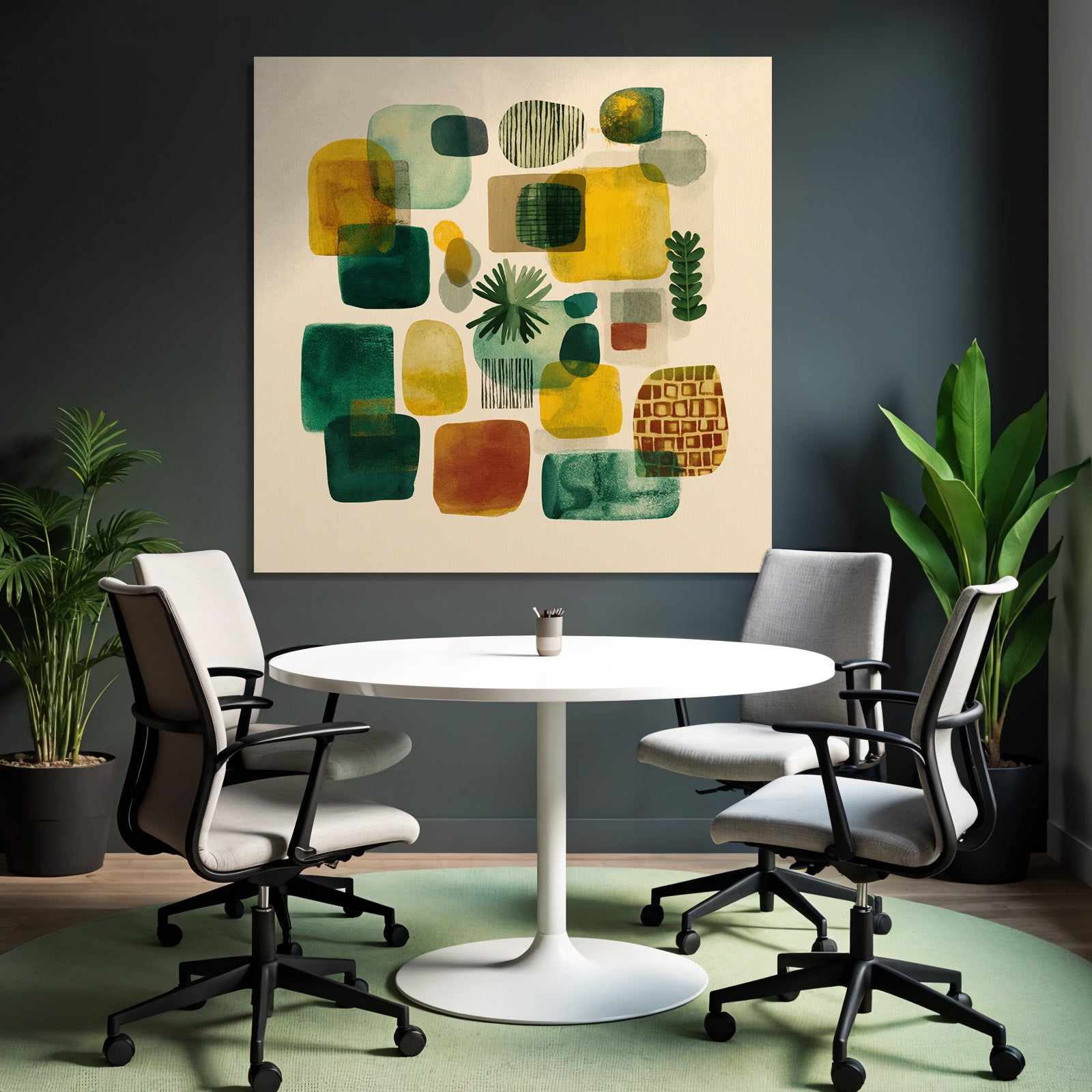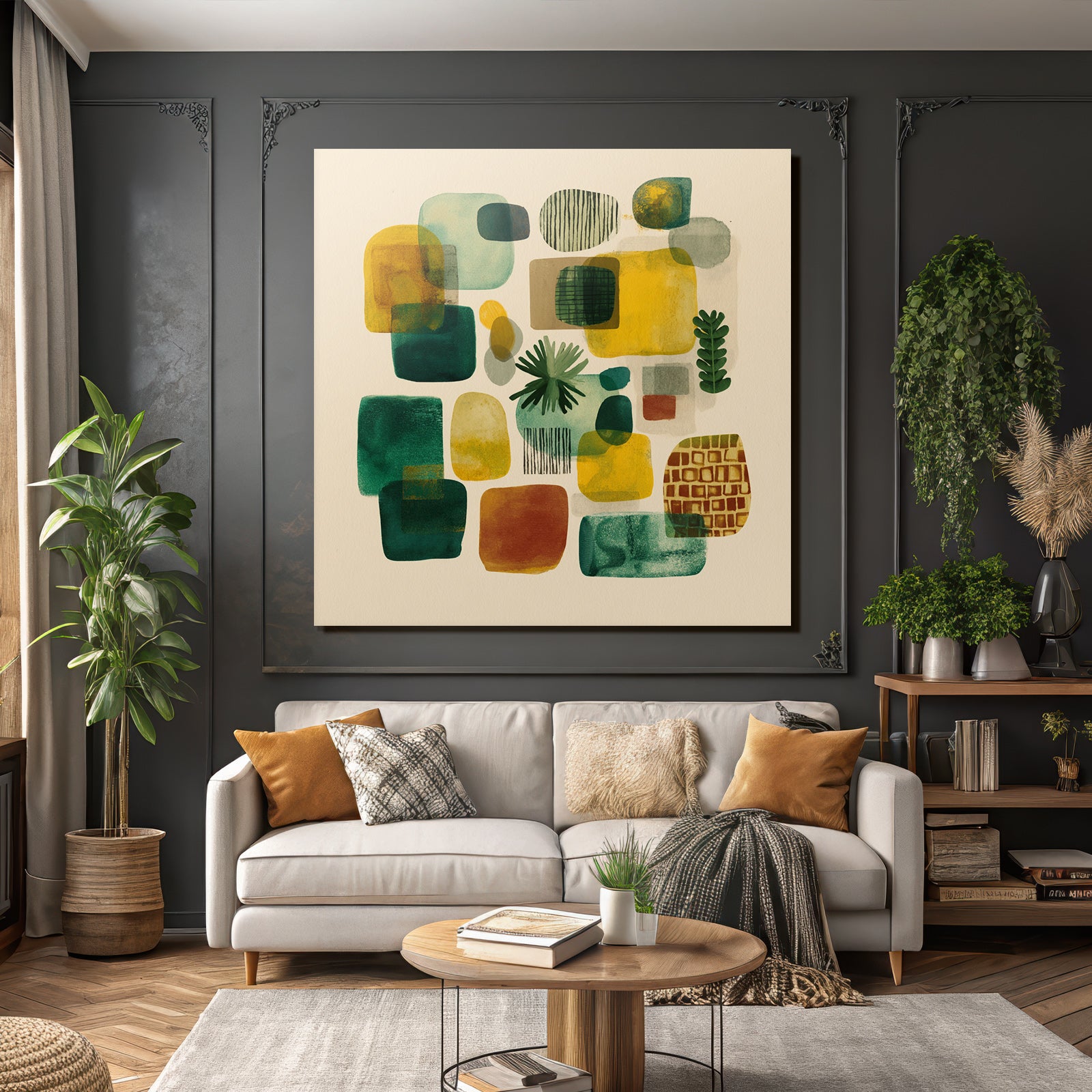 Mach mehr aus Deinem Wohnbereich oder Besprechungszimmer – „„Abstrakte Zusammensetzung Bunt““ im Stil Mid Century Modern überzeugt als eleganter Textildruck im FameFrame.