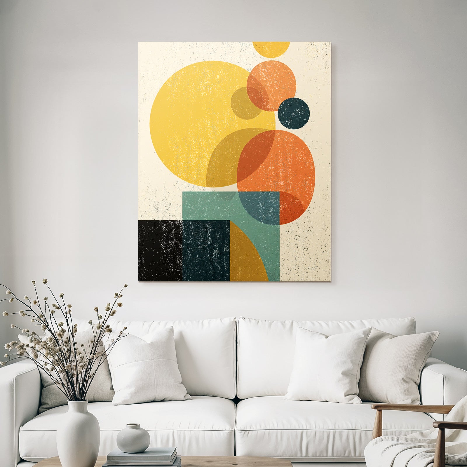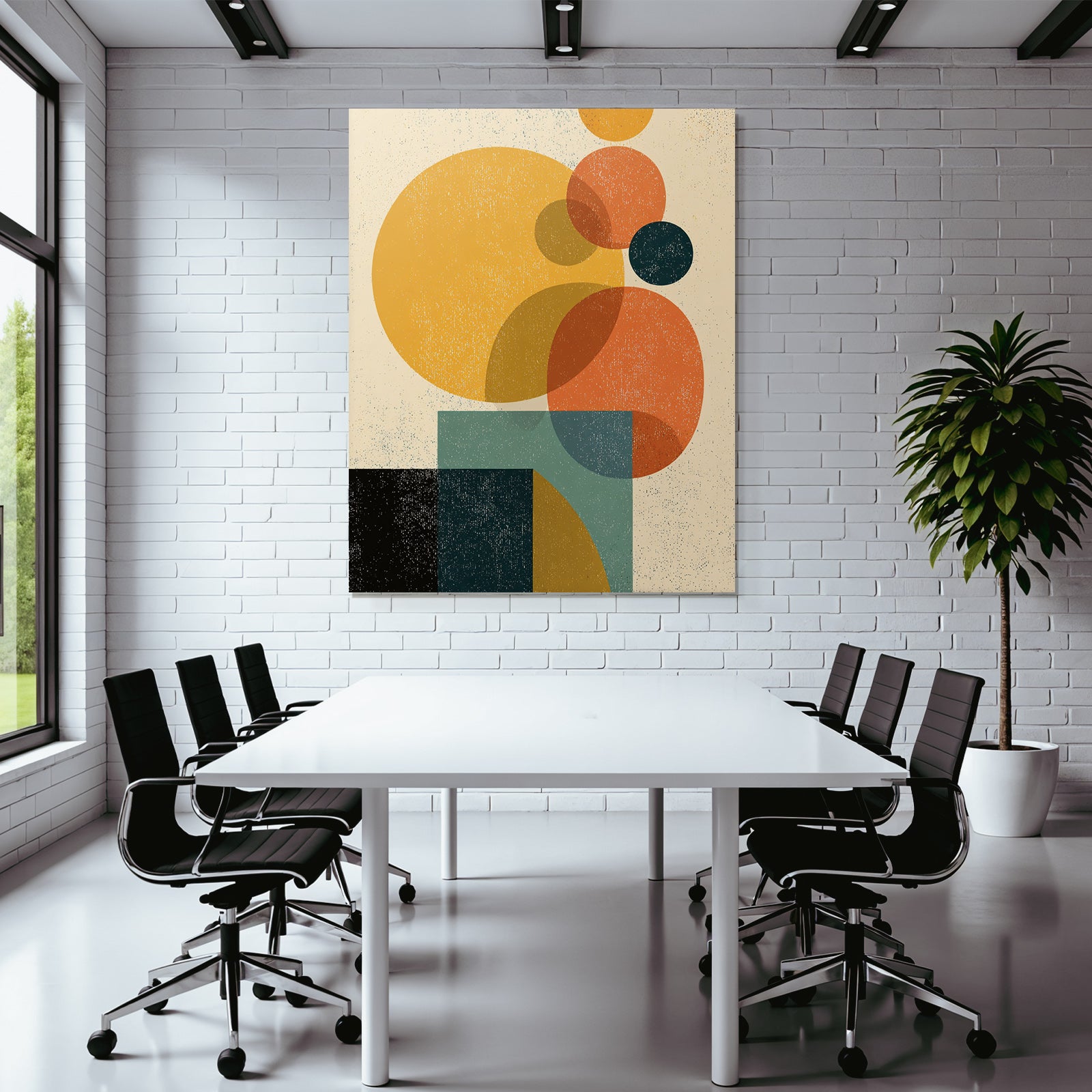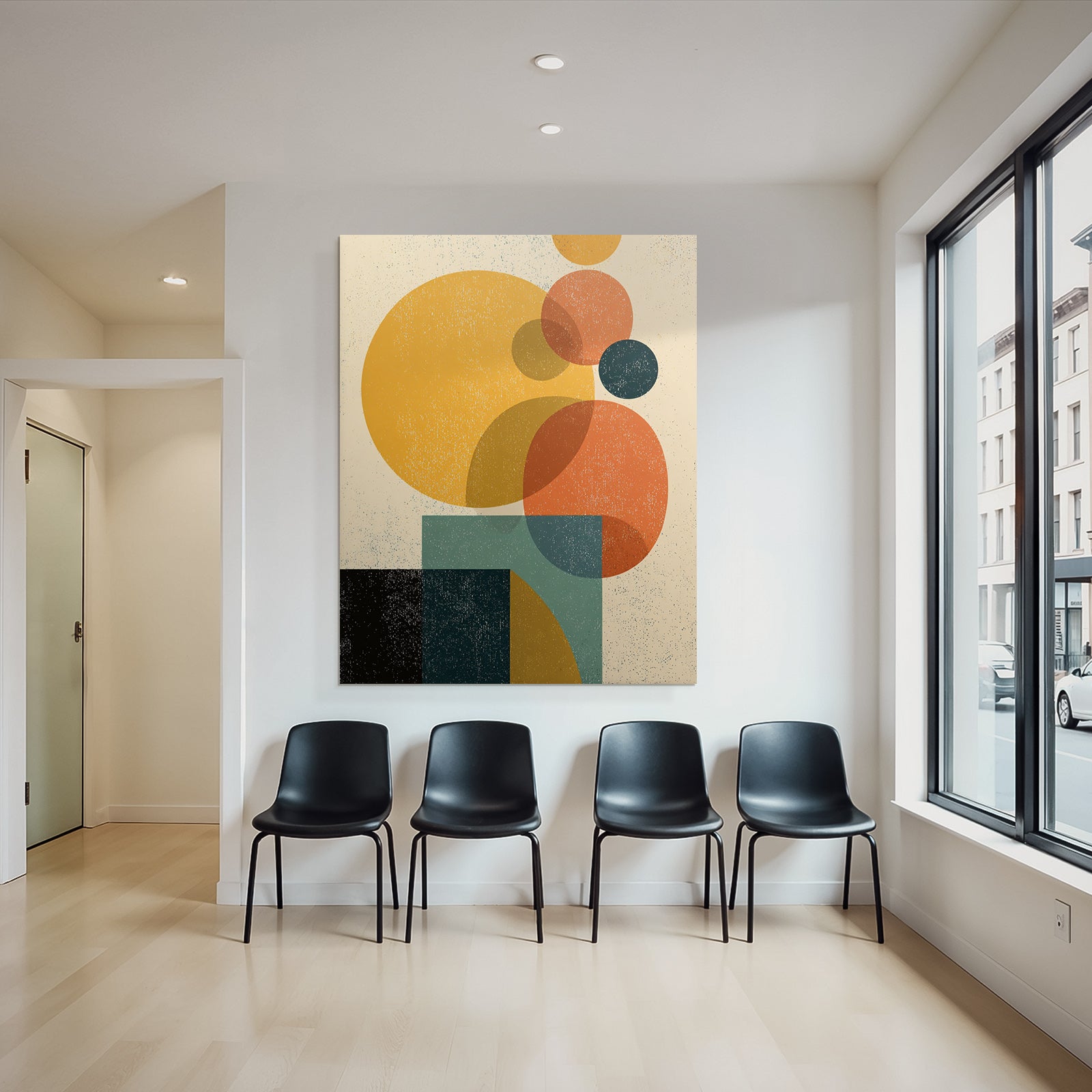 Mit dem Werk „„Abstrakte Zusammensetzung Kreise Vierecke““ im Stil Mid Century Modern gestaltest Du Dein Wartezimmer oder Deine Hotel-Lobby eindrucksvoll und modern – auf Stoff im FameFrame.