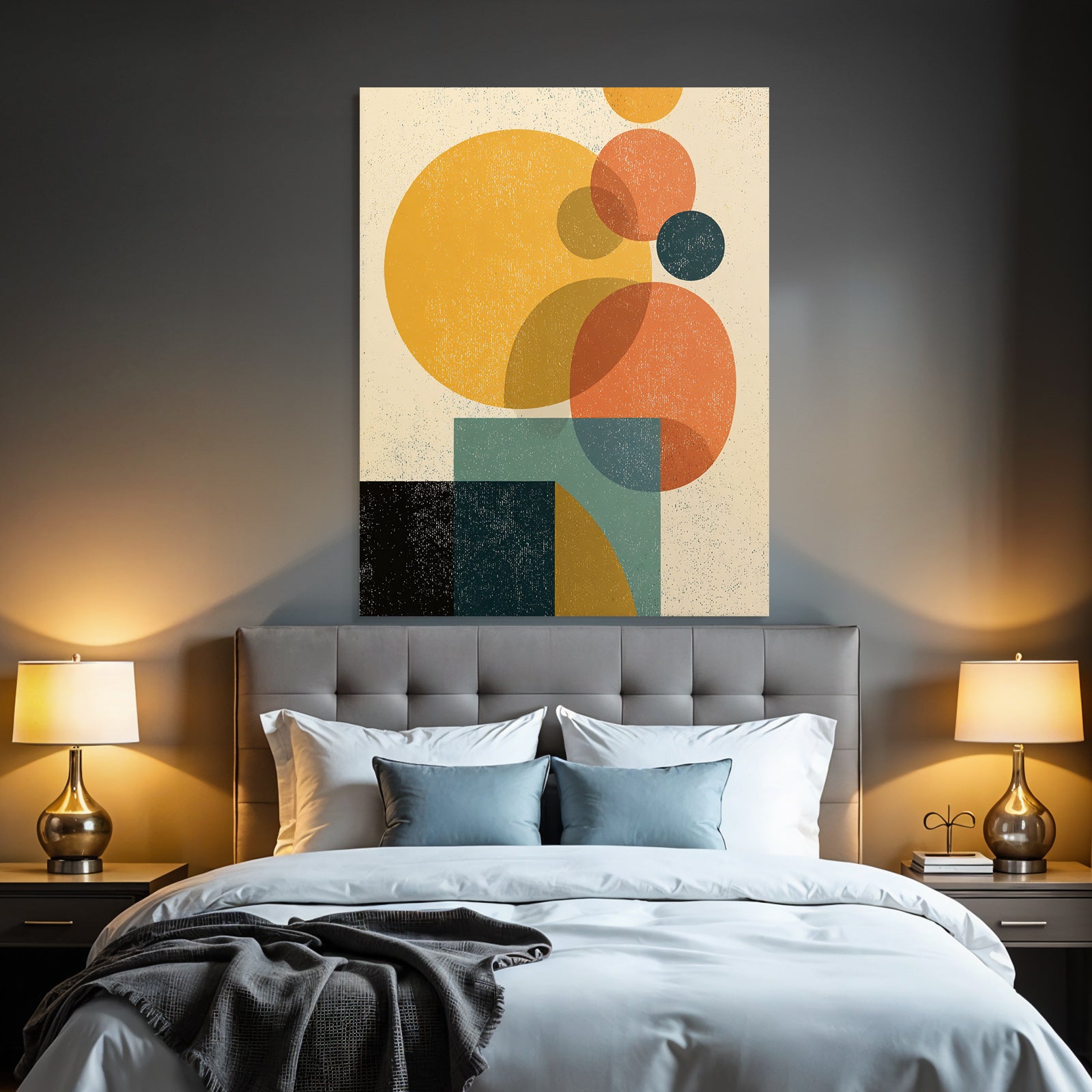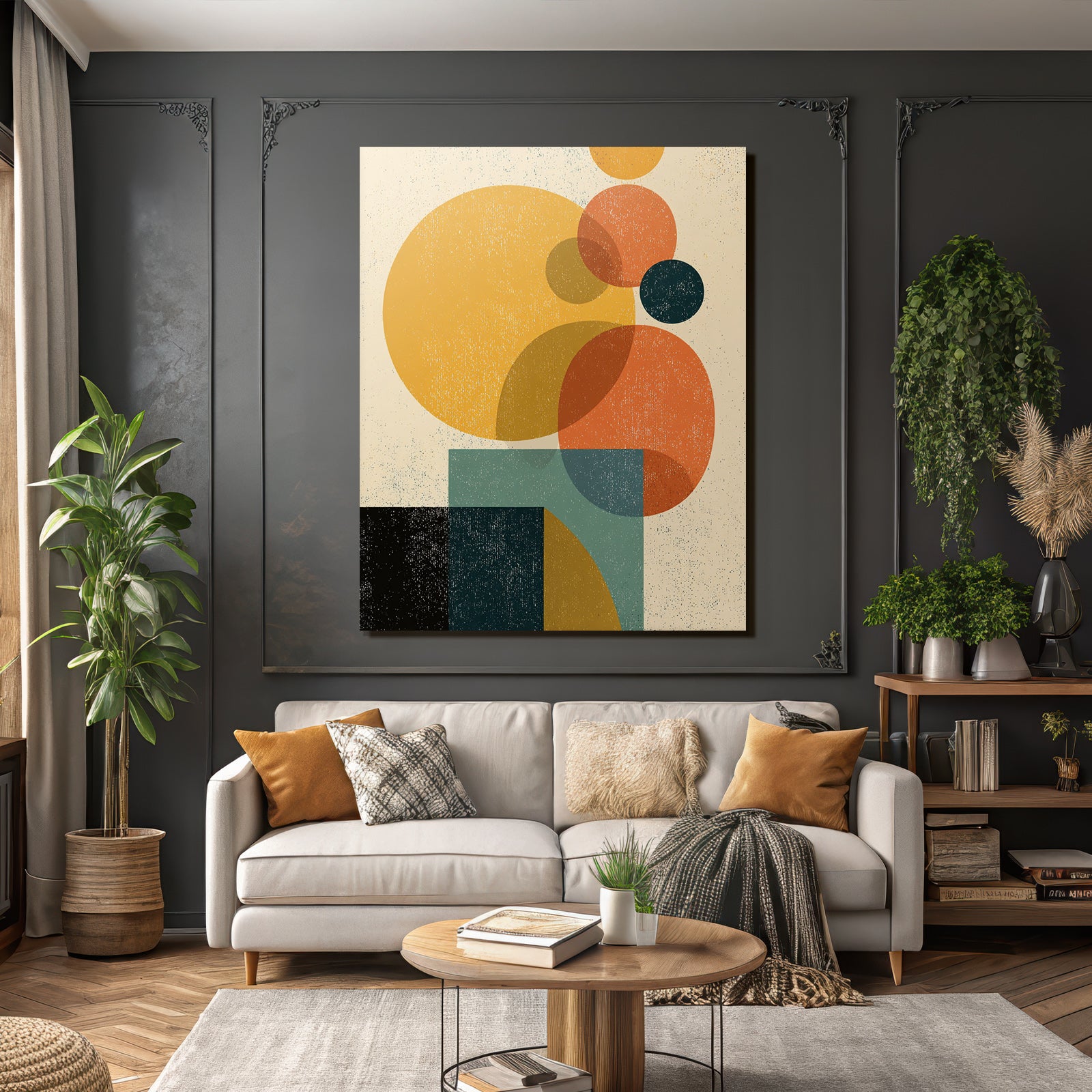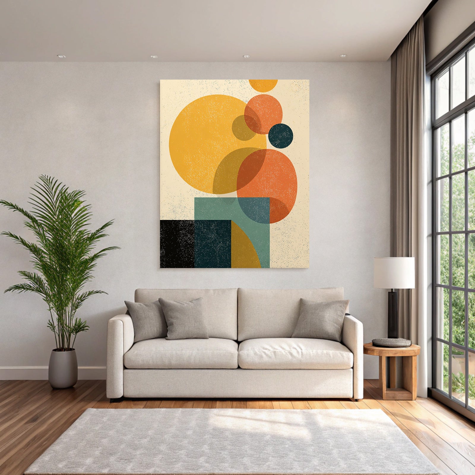 Mit dem Werk „„Abstrakte Zusammensetzung Kreise Vierecke““ im Stil Mid Century Modern gestaltest Du Dein Wartezimmer oder Deine Hotel-Lobby eindrucksvoll und modern – auf Stoff im FameFrame.