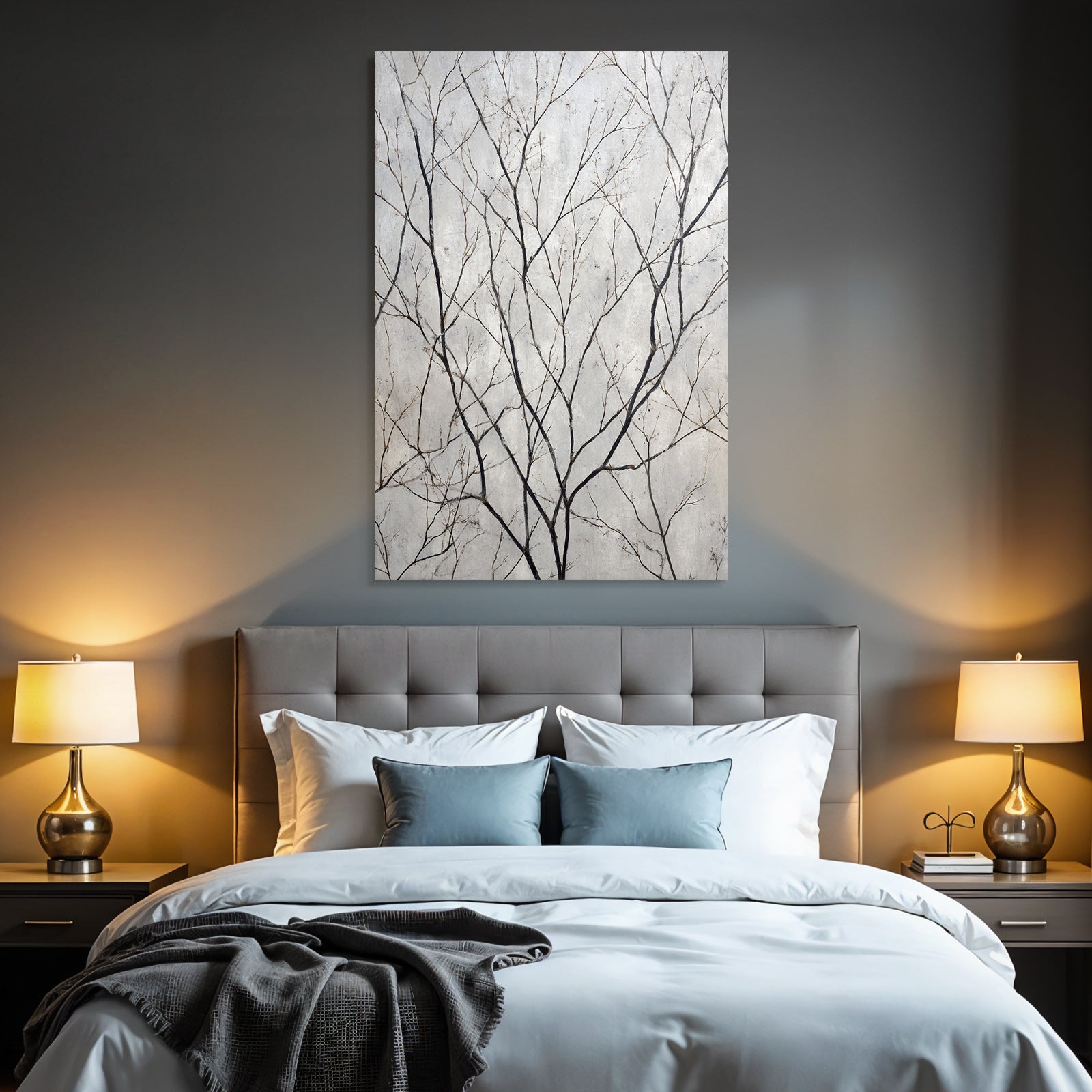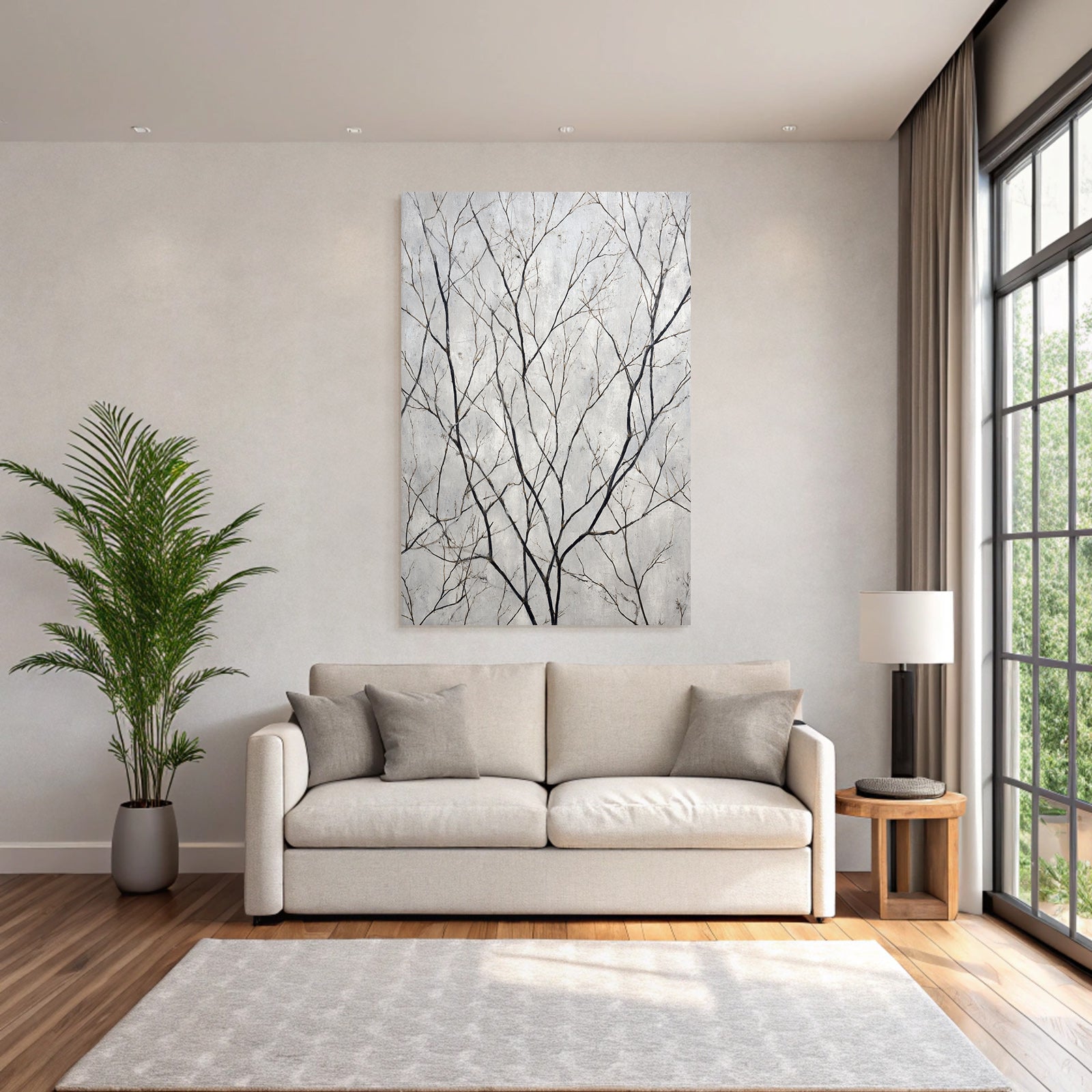 Verleihe Lobby, Wartezimmer oder Studio eine besondere Atmosphäre mit „Abstraktes Zweigmuster Natur Minimalismus“ im Stil Minimalistisch – eindrucksvoll im FameFrame™ präsentiert.