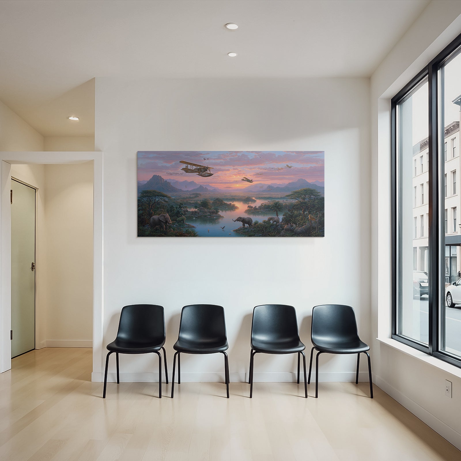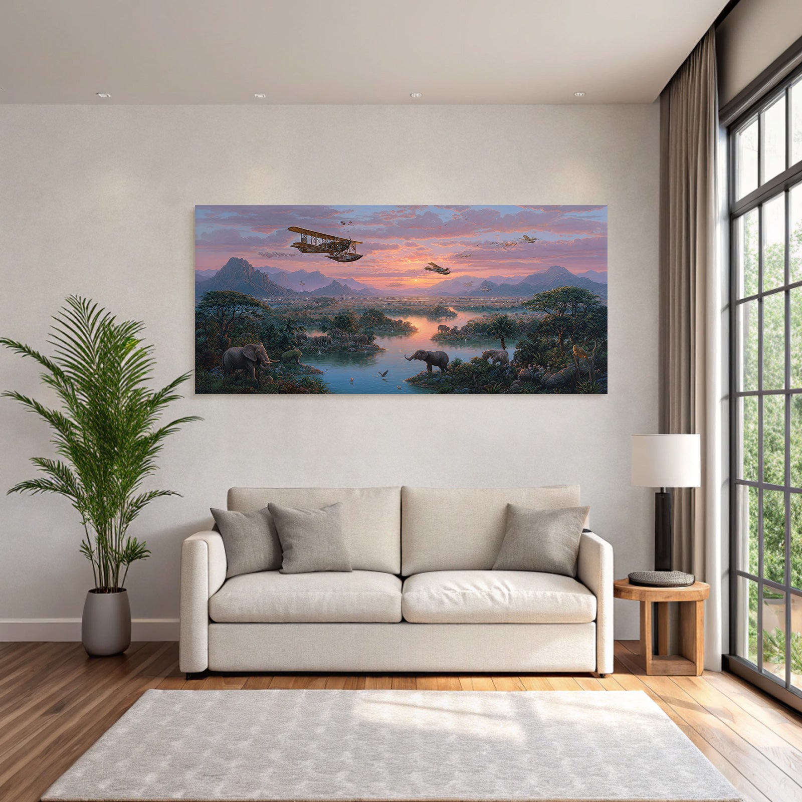 Bring die Atmosphäre von Flugzeuge in Dein Zuhause – mit „Friedliche Natur Landschaft Elephanten Sonnenuntergang“ auf Stoff im austauschbaren FameFrame™.