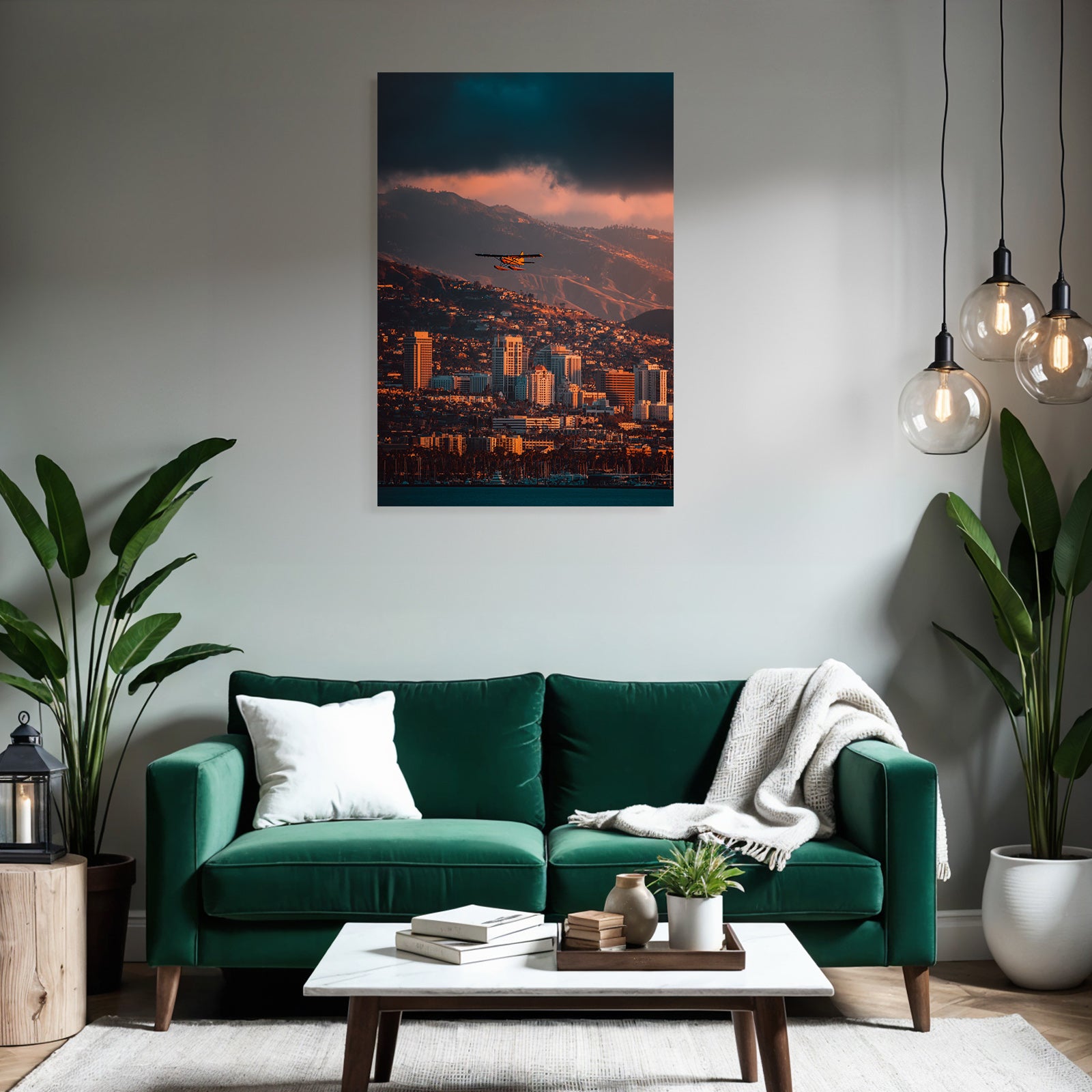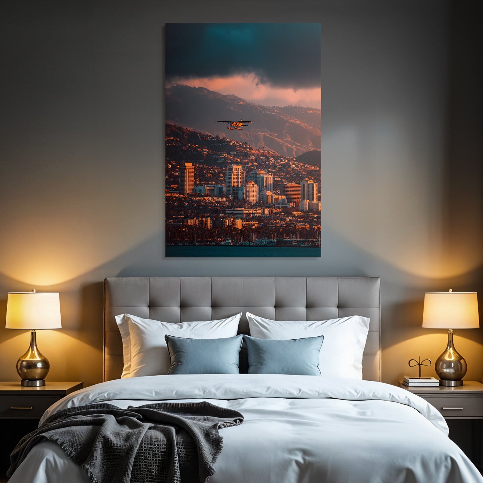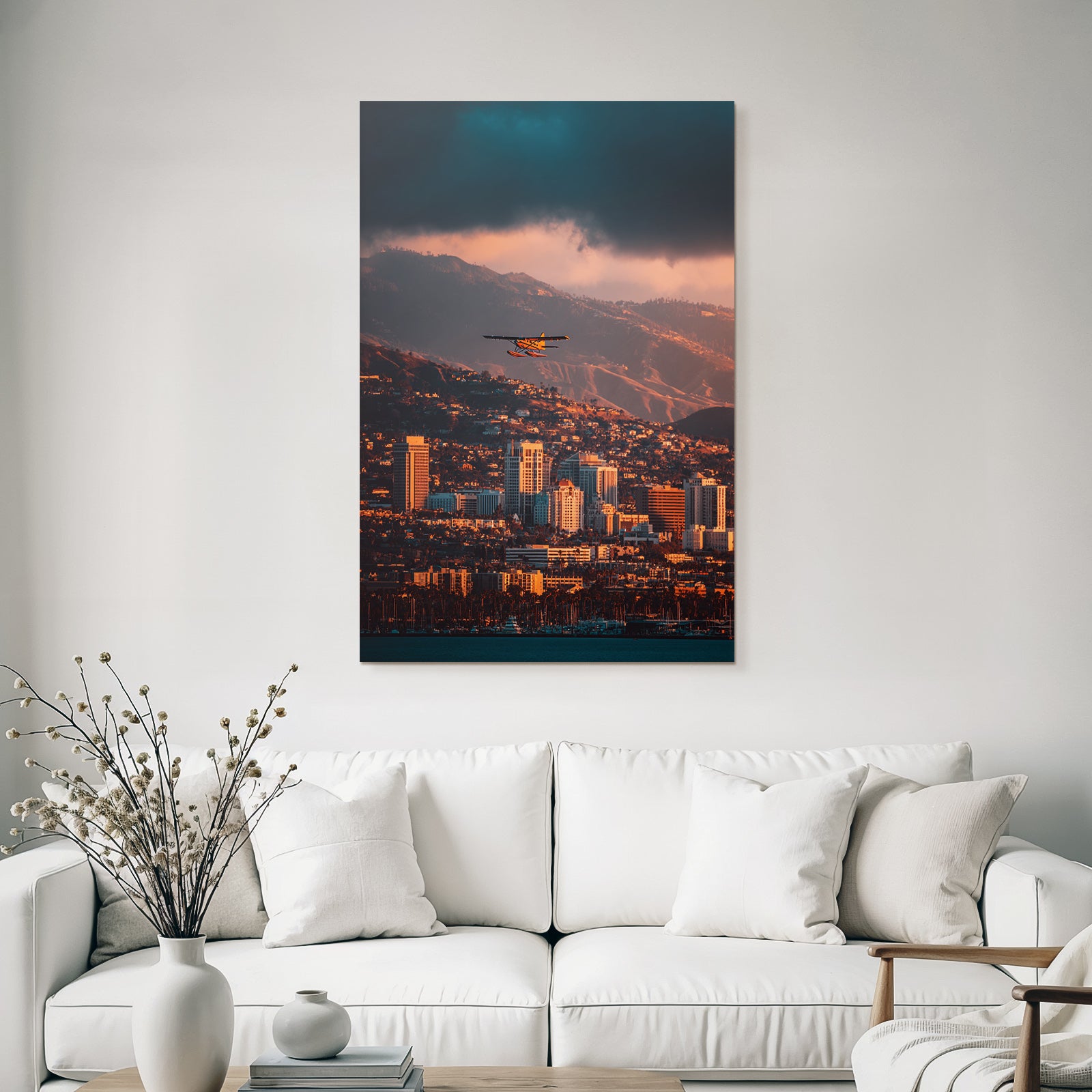 Setz ein Statement: „Lebendige Stadtlandschaft Im Sonnenuntergang Coastal City Mit Seaplane“ im Stil Flugzeuge wird im FameFrame™ zum echten Kunstobjekt an Deiner Wand.
