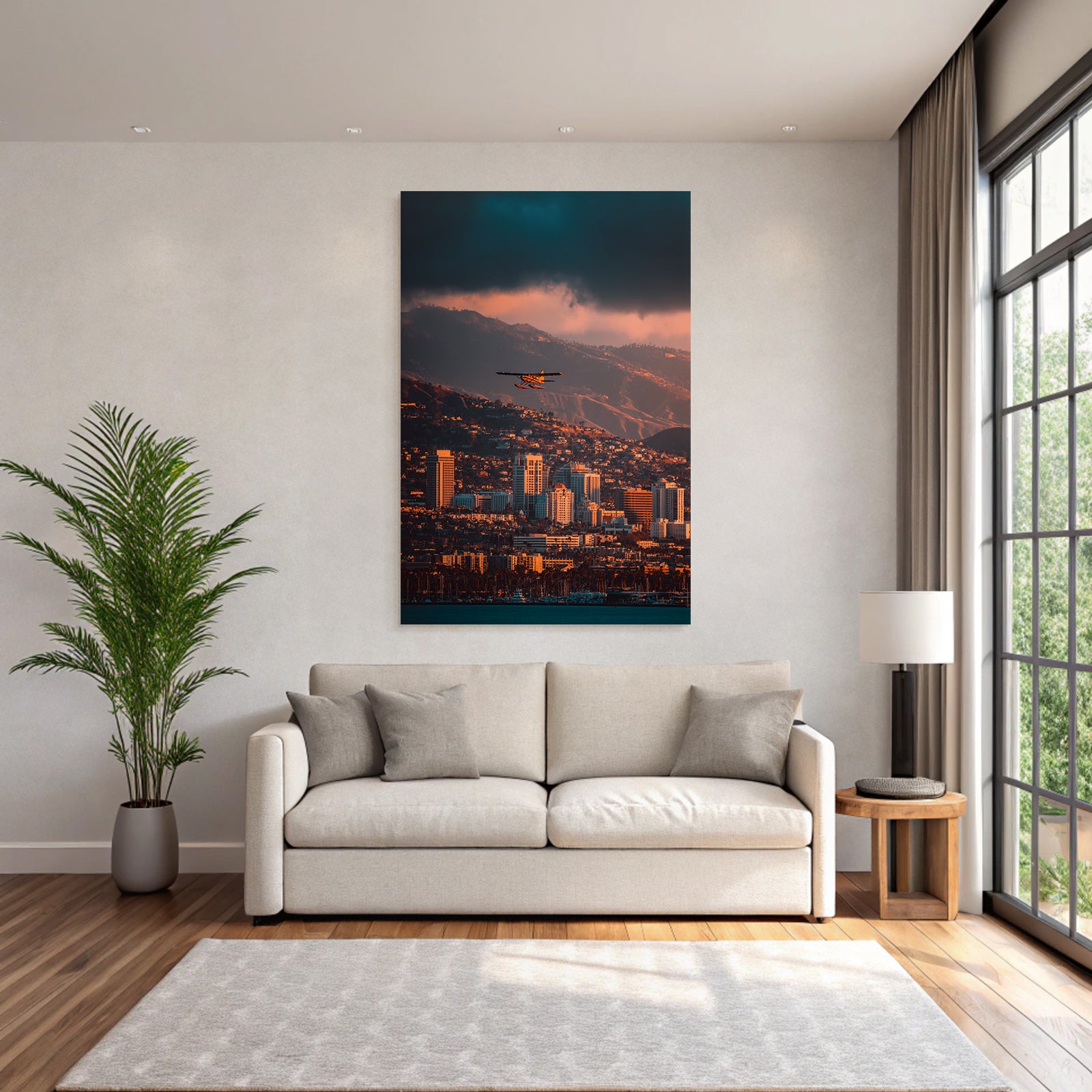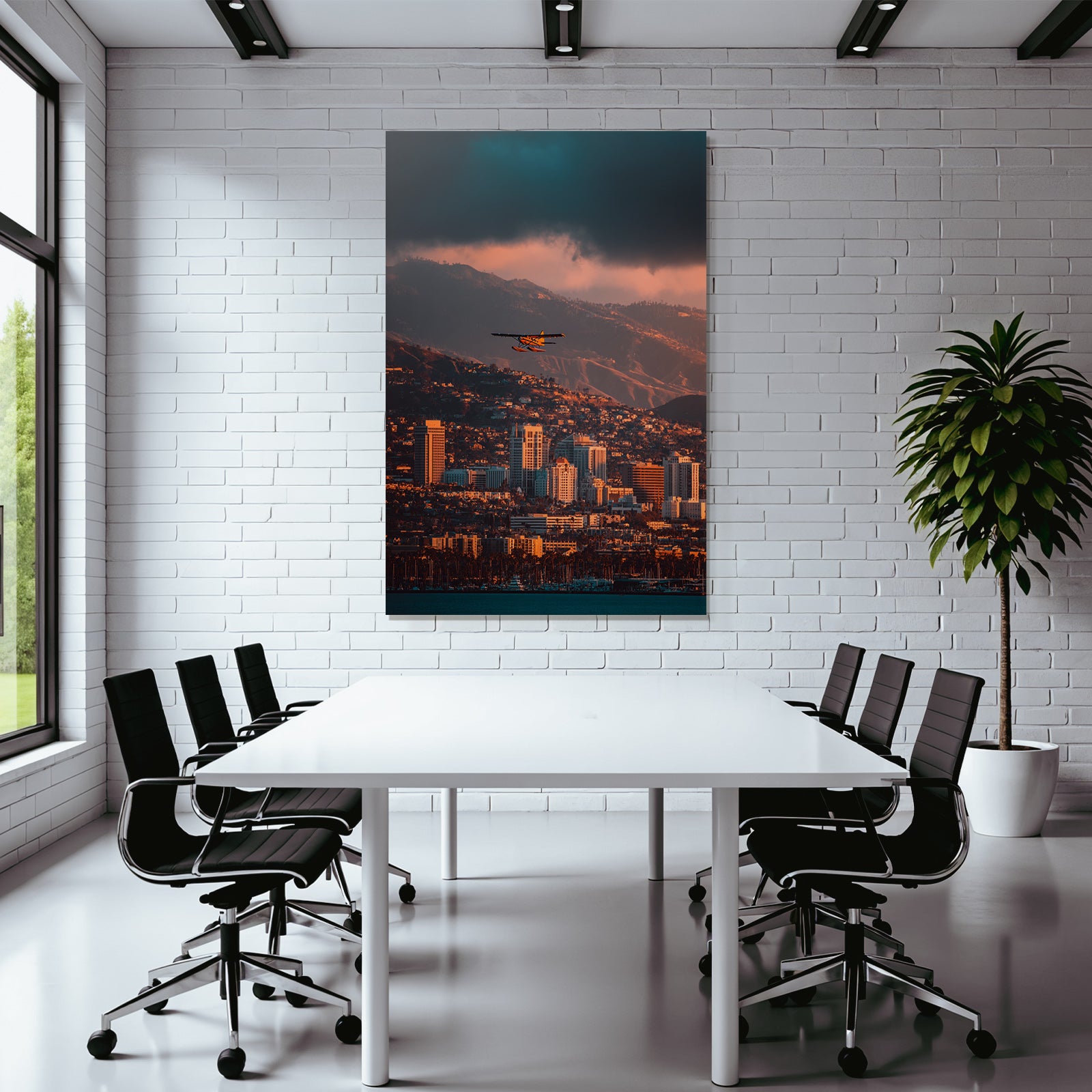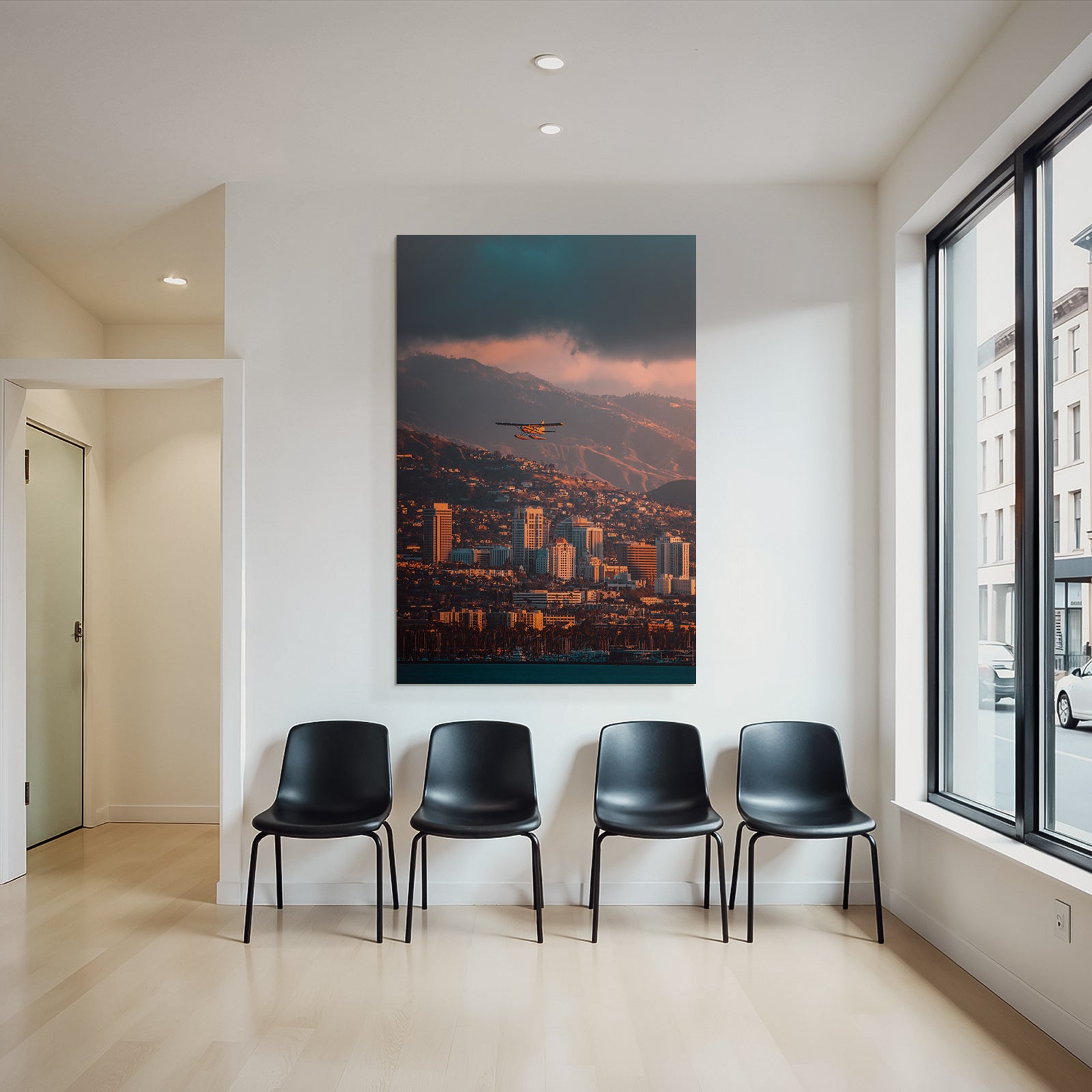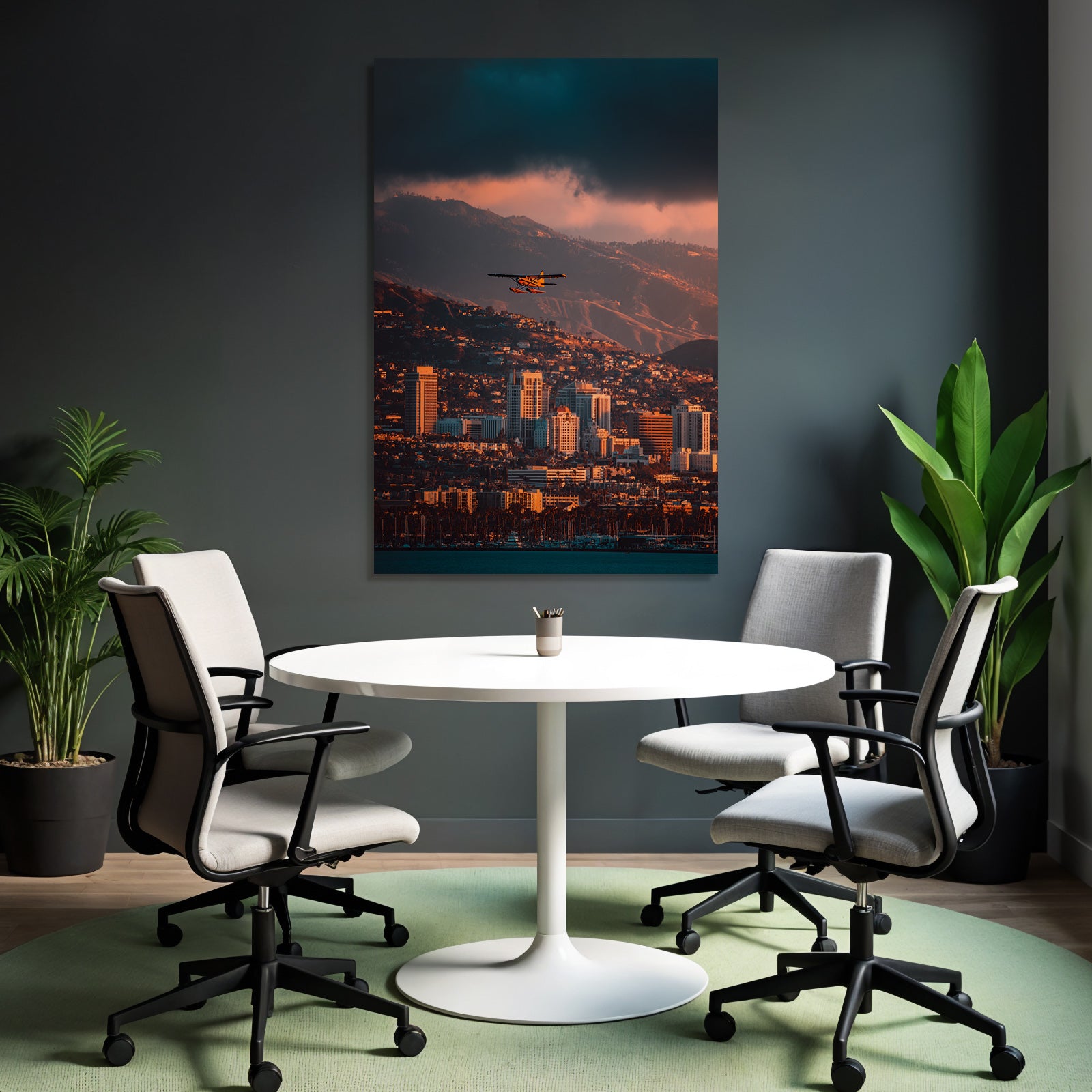 Setz ein Statement: „Lebendige Stadtlandschaft Im Sonnenuntergang Coastal City Mit Seaplane“ im Stil Flugzeuge wird im FameFrame™ zum echten Kunstobjekt an Deiner Wand.