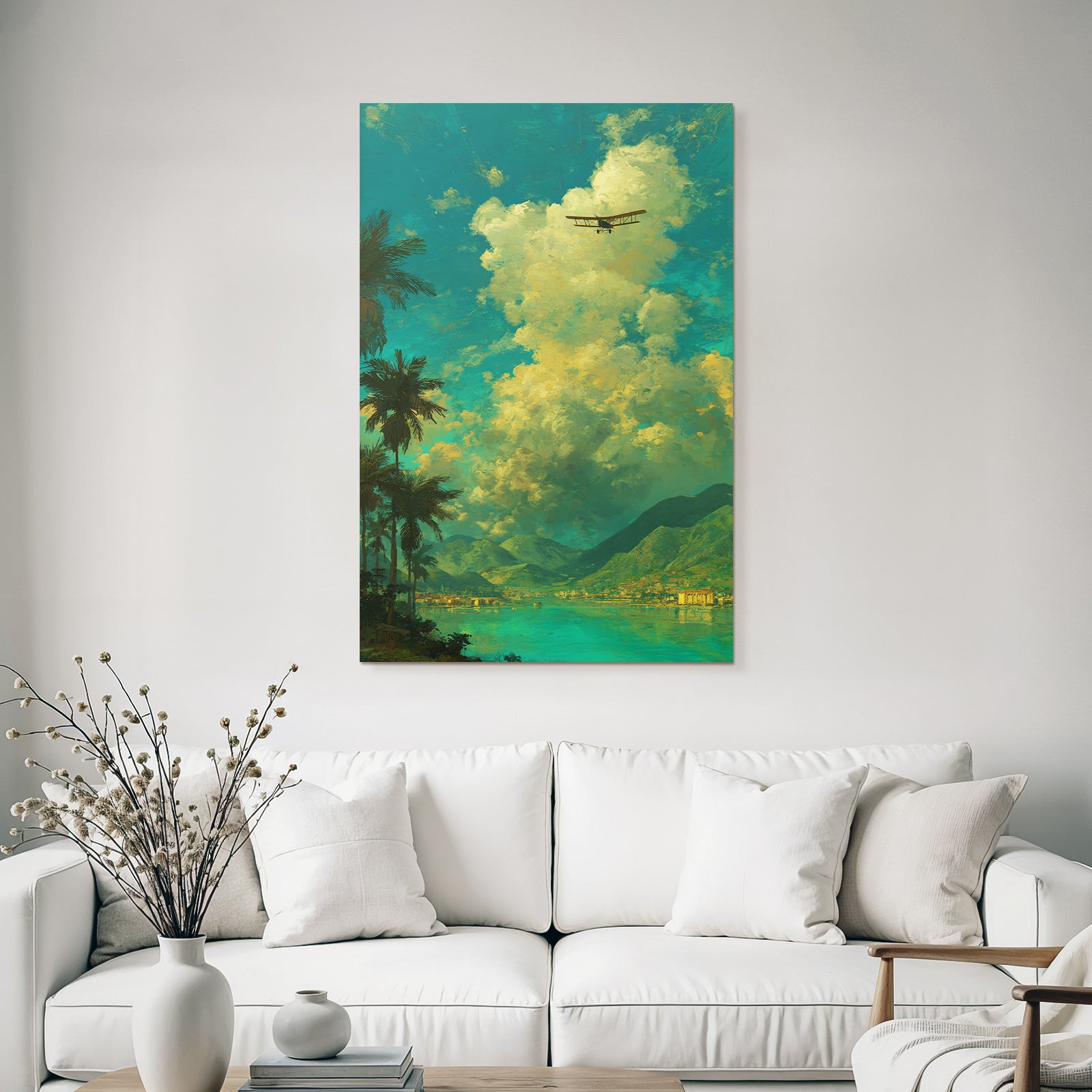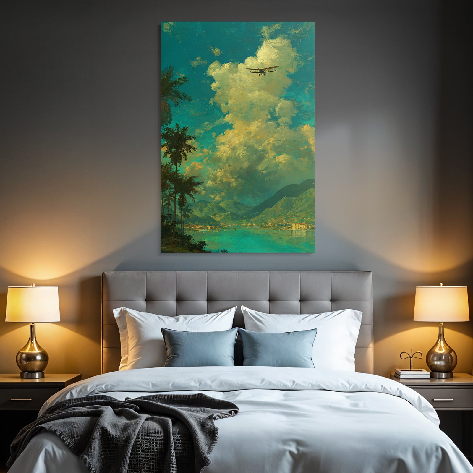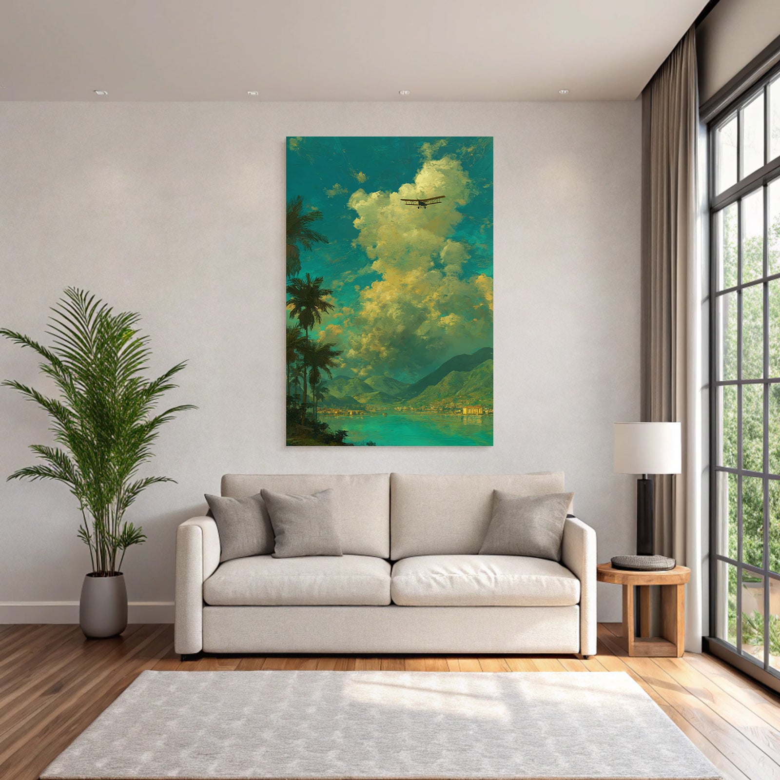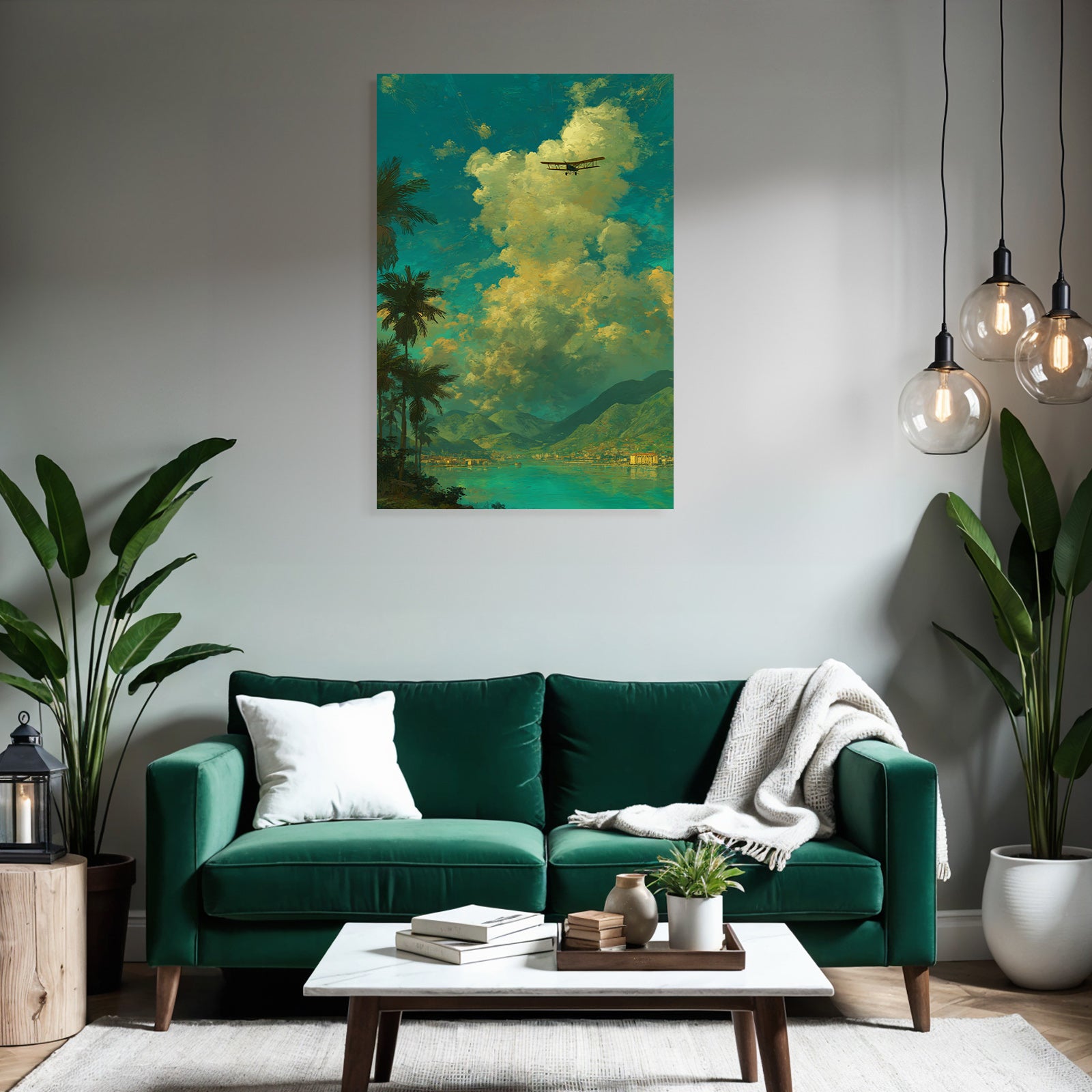 „Szenische Landschaft Mit Flughimmel Palm Baeumen Und Bergen“ verbindet das Beste aus Flugzeuge mit modernem Textildruck – edel präsentiert im hochwertigen FameFrame™.