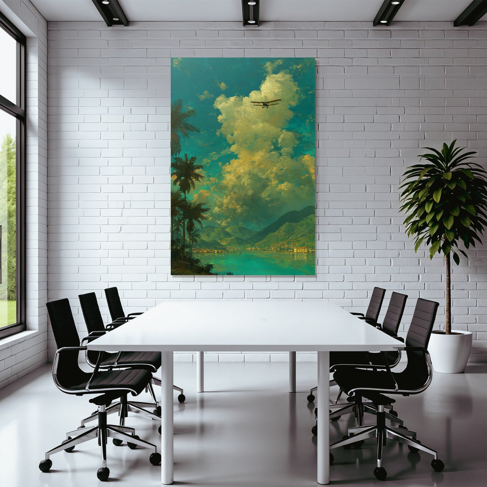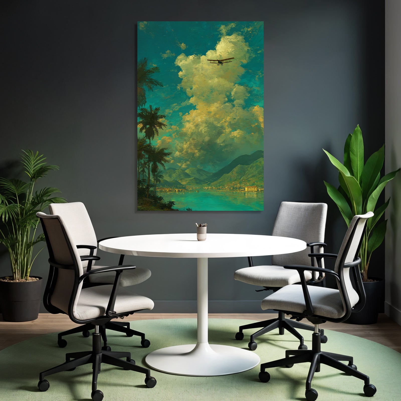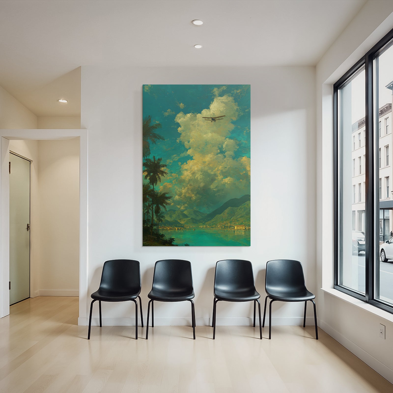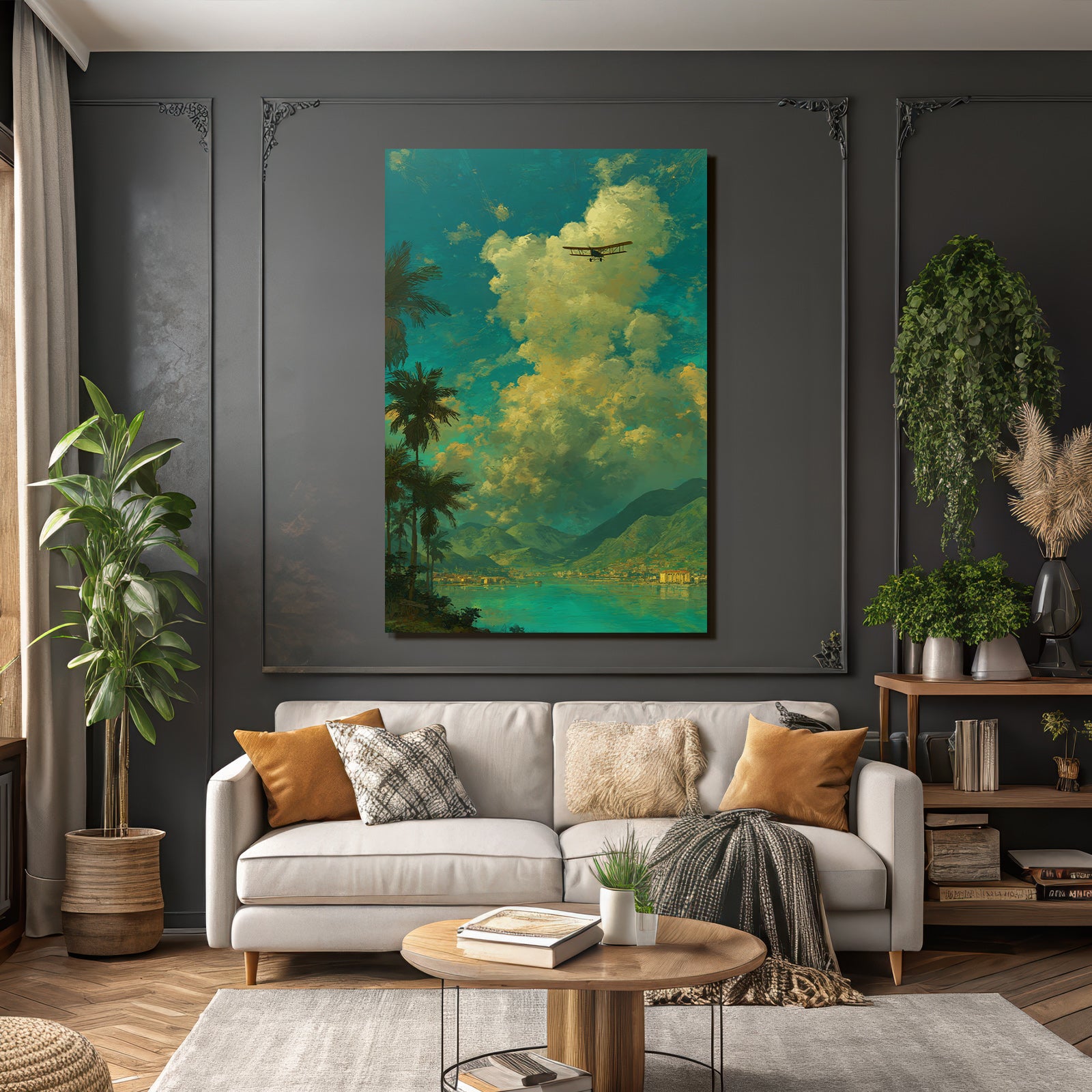 „Szenische Landschaft Mit Flughimmel Palm Baeumen Und Bergen“ verbindet das Beste aus Flugzeuge mit modernem Textildruck – edel präsentiert im hochwertigen FameFrame™.