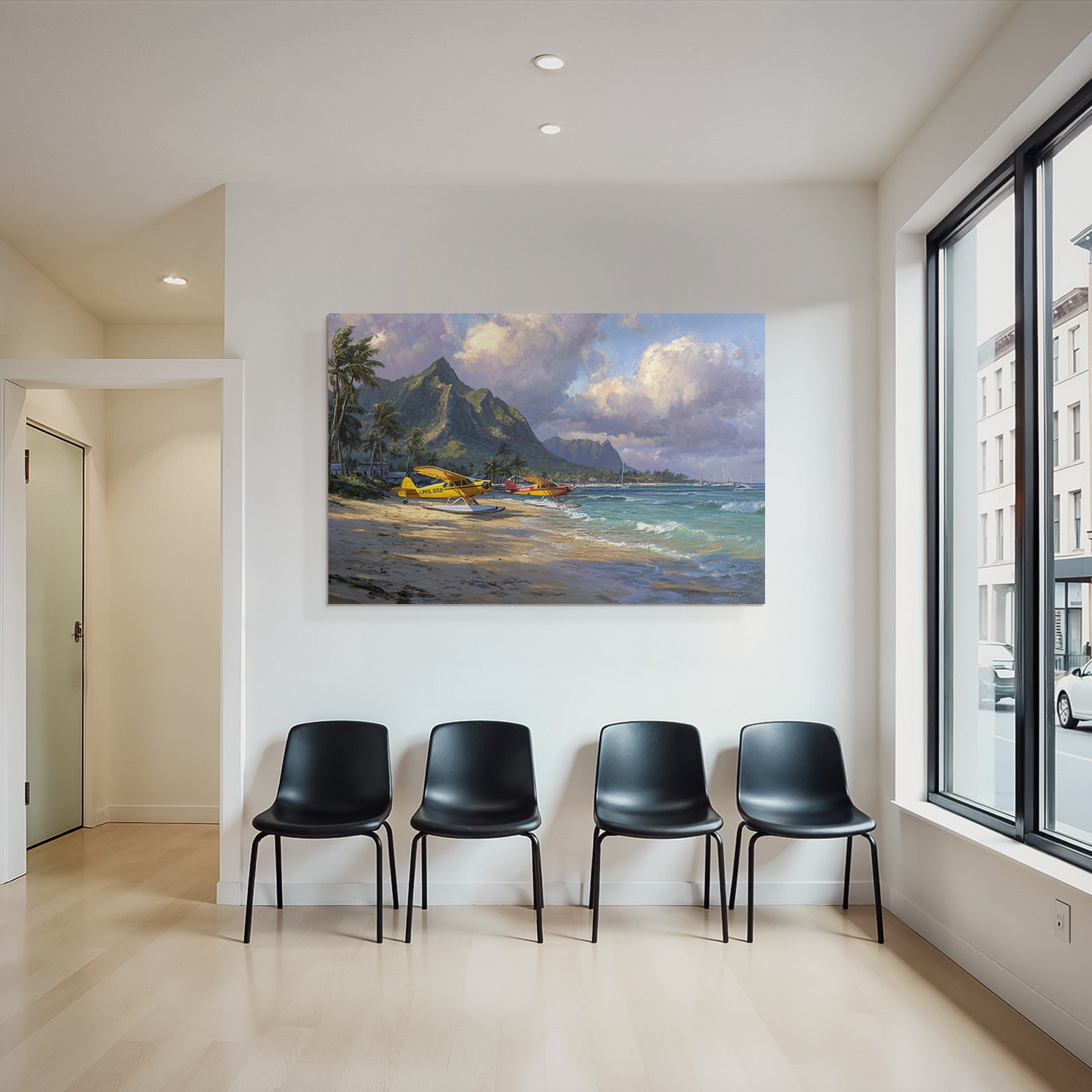 Verleihe Lobby, Wartezimmer oder Studio eine besondere Atmosphäre mit „Tropische Idylle Mit Seaplanes Und Palmbaeumen Beachlandscape“ im Stil Flugzeuge – eindrucksvoll im FameFrame™ präsentiert.