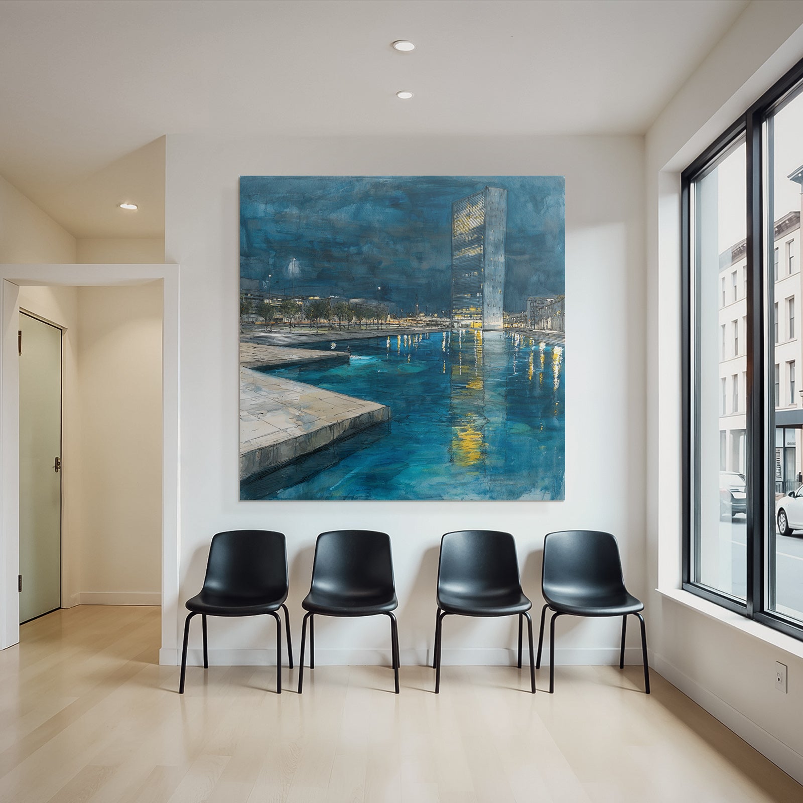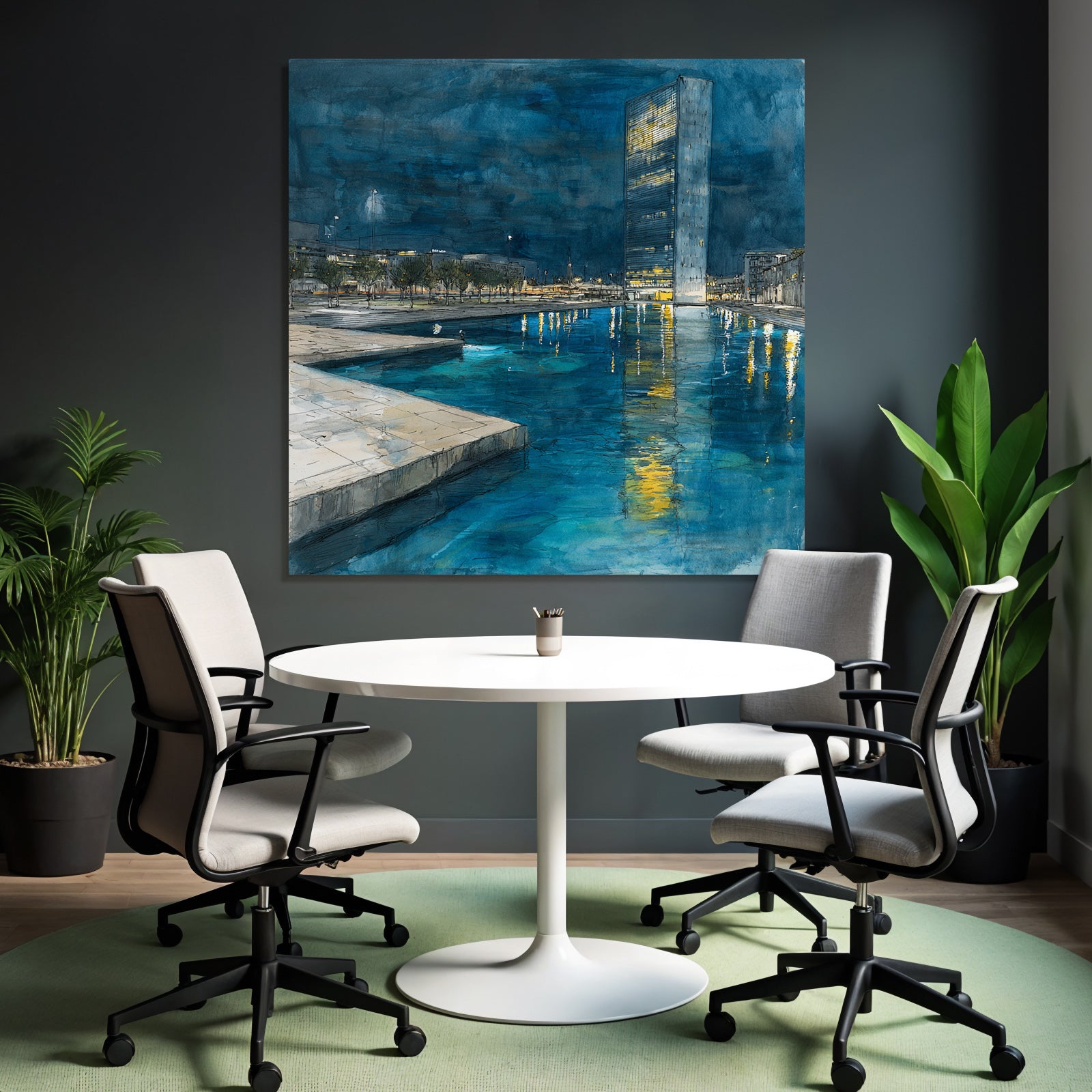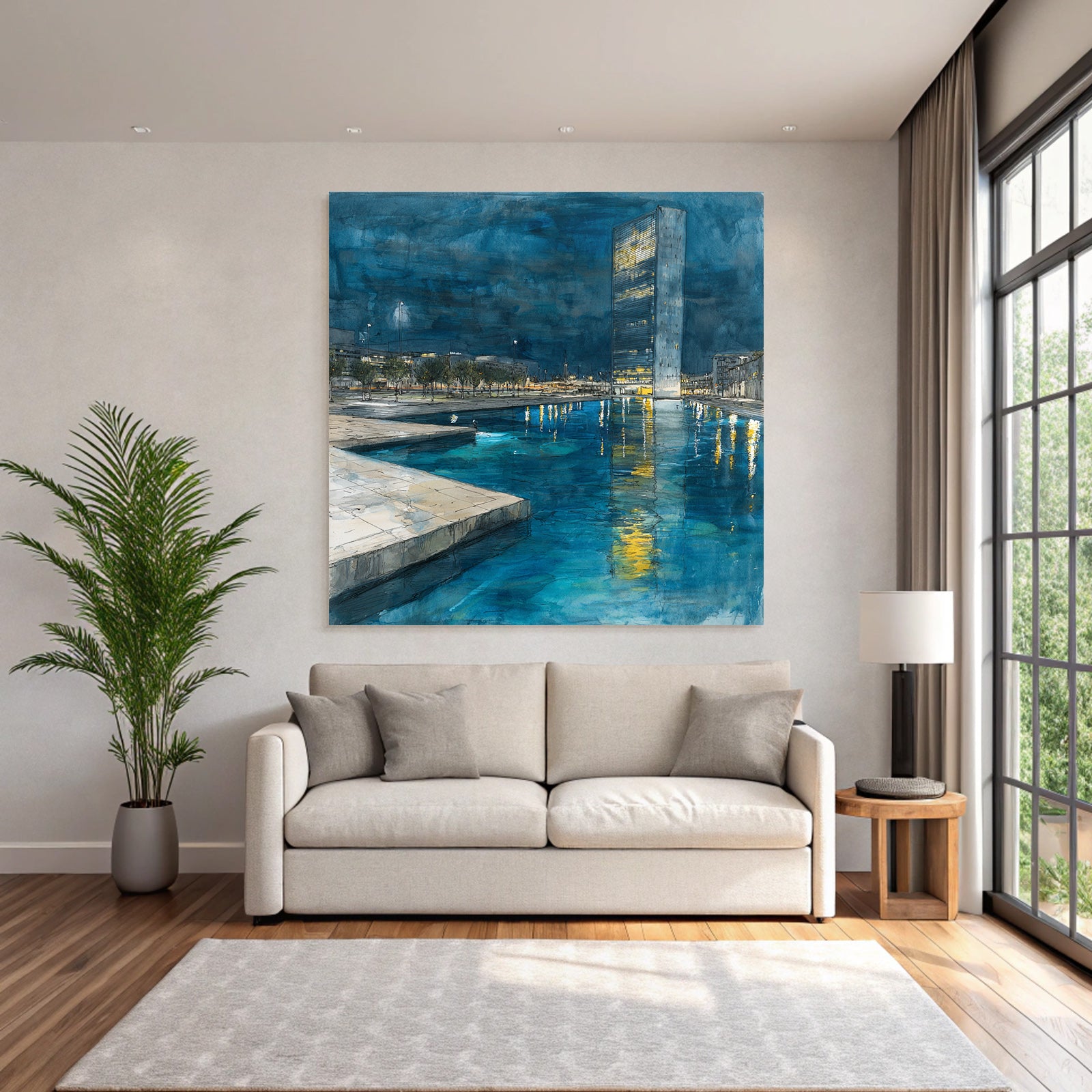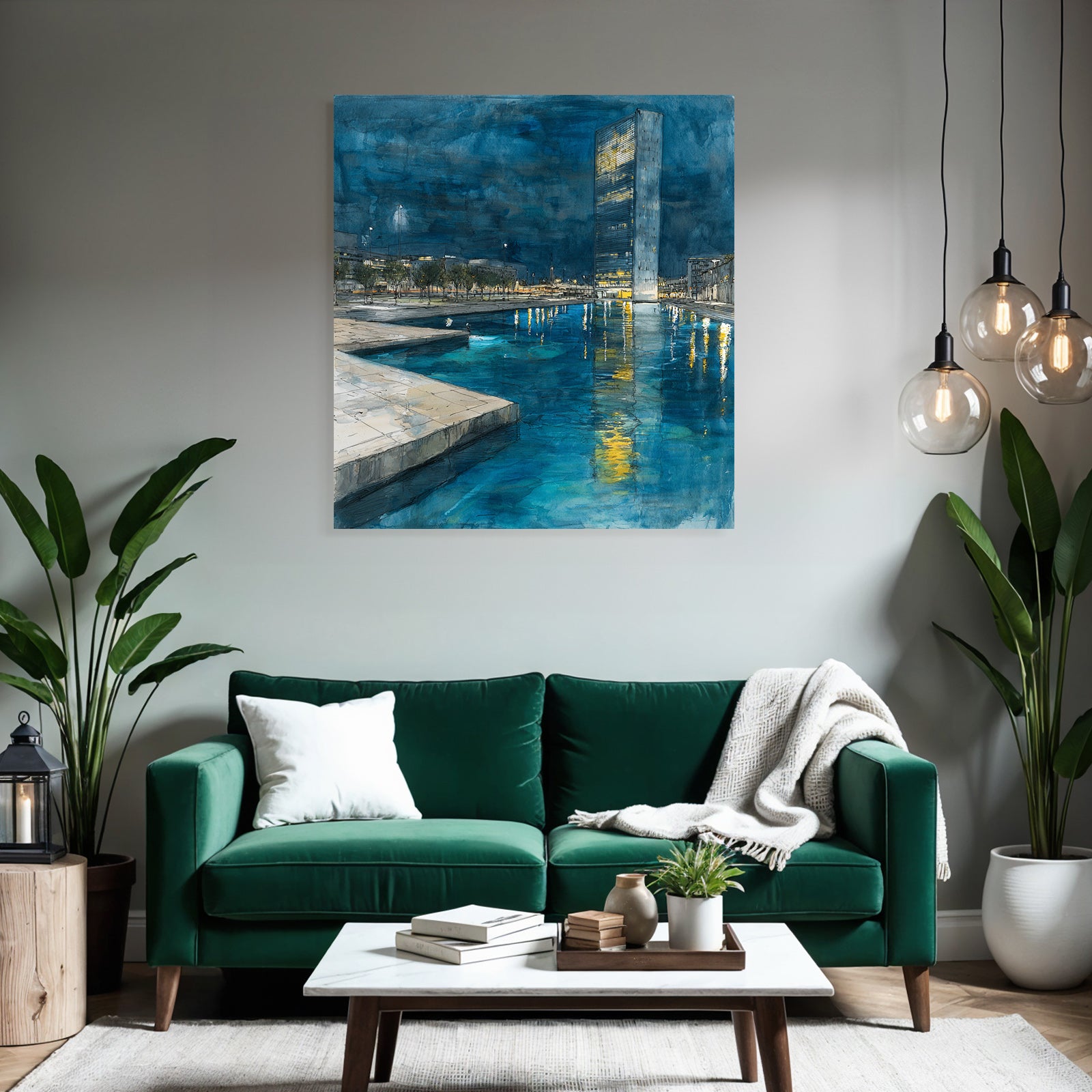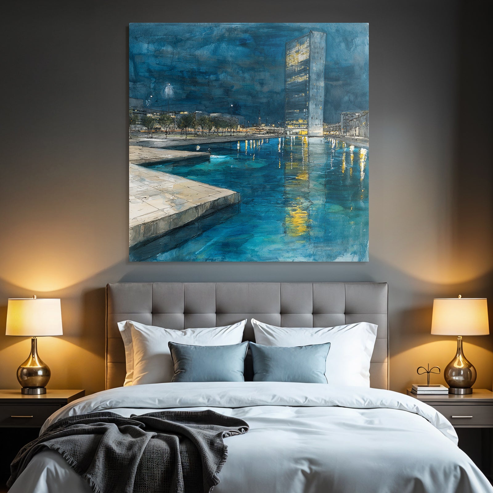Entdecken Sie die Facetten von „Moderne Nachtszenen Stadt Reflexion Wasser“. Dieses Motiv im Look von Moderne Architektur ist eine Zierde für jeden Raum und wird im FameFrame elegant inszeniert.