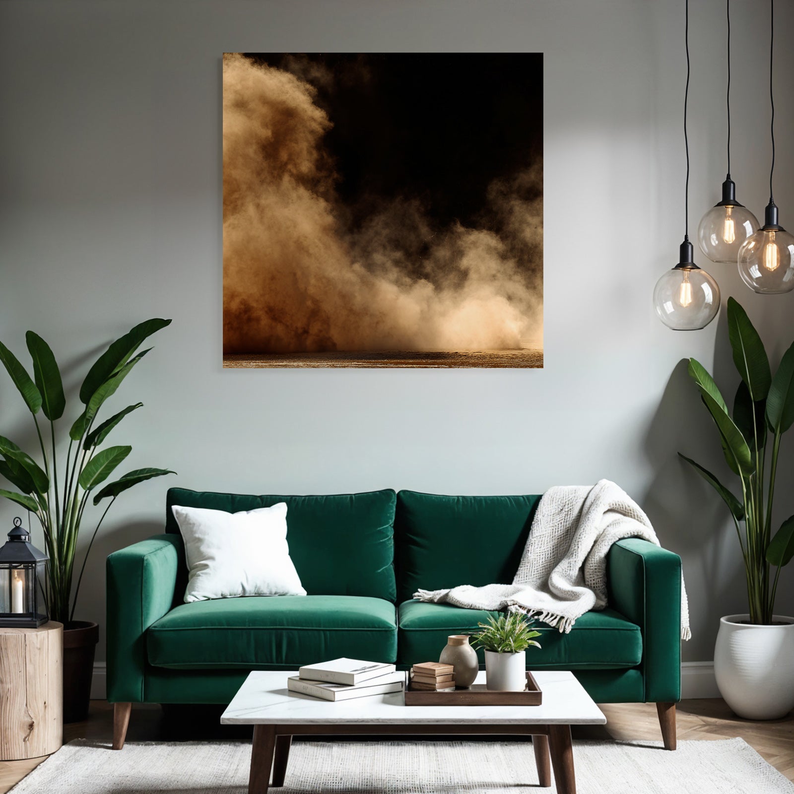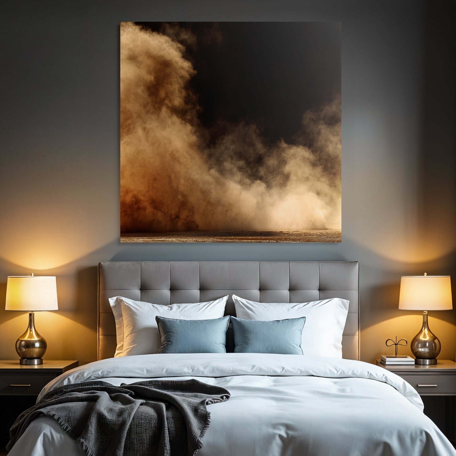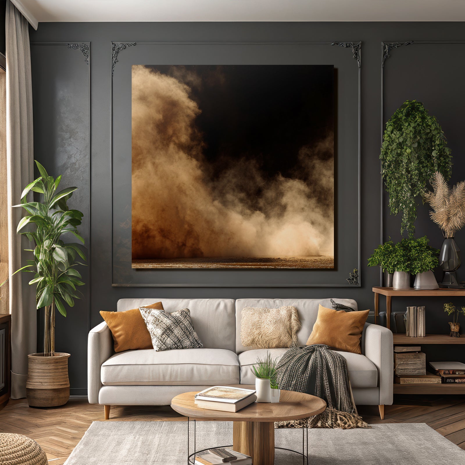 Mit „Aufgewirbelte Staubwolke Vor Dunklem Hintergrund“ entscheiden Sie sich für ein ausdrucksstarkes Kunstwerk im Stil Nahaufnahmen. Der FameFrame unterstreicht die moderne und hochwertige Wirkung.