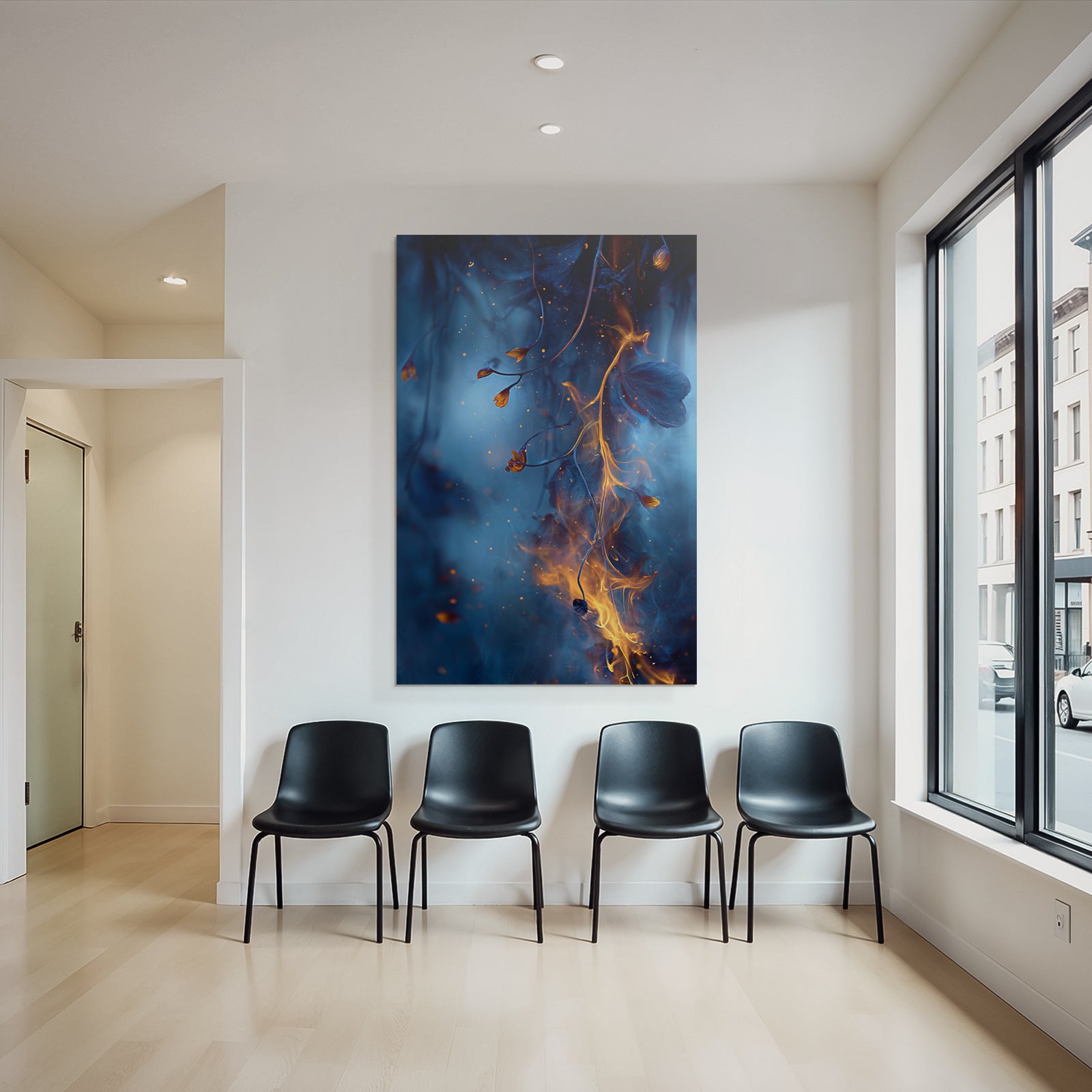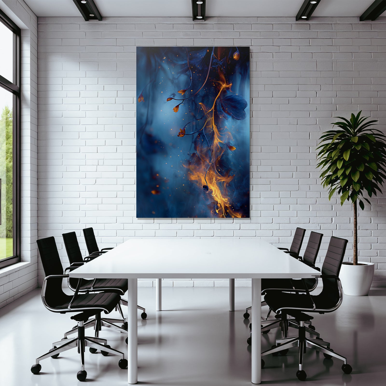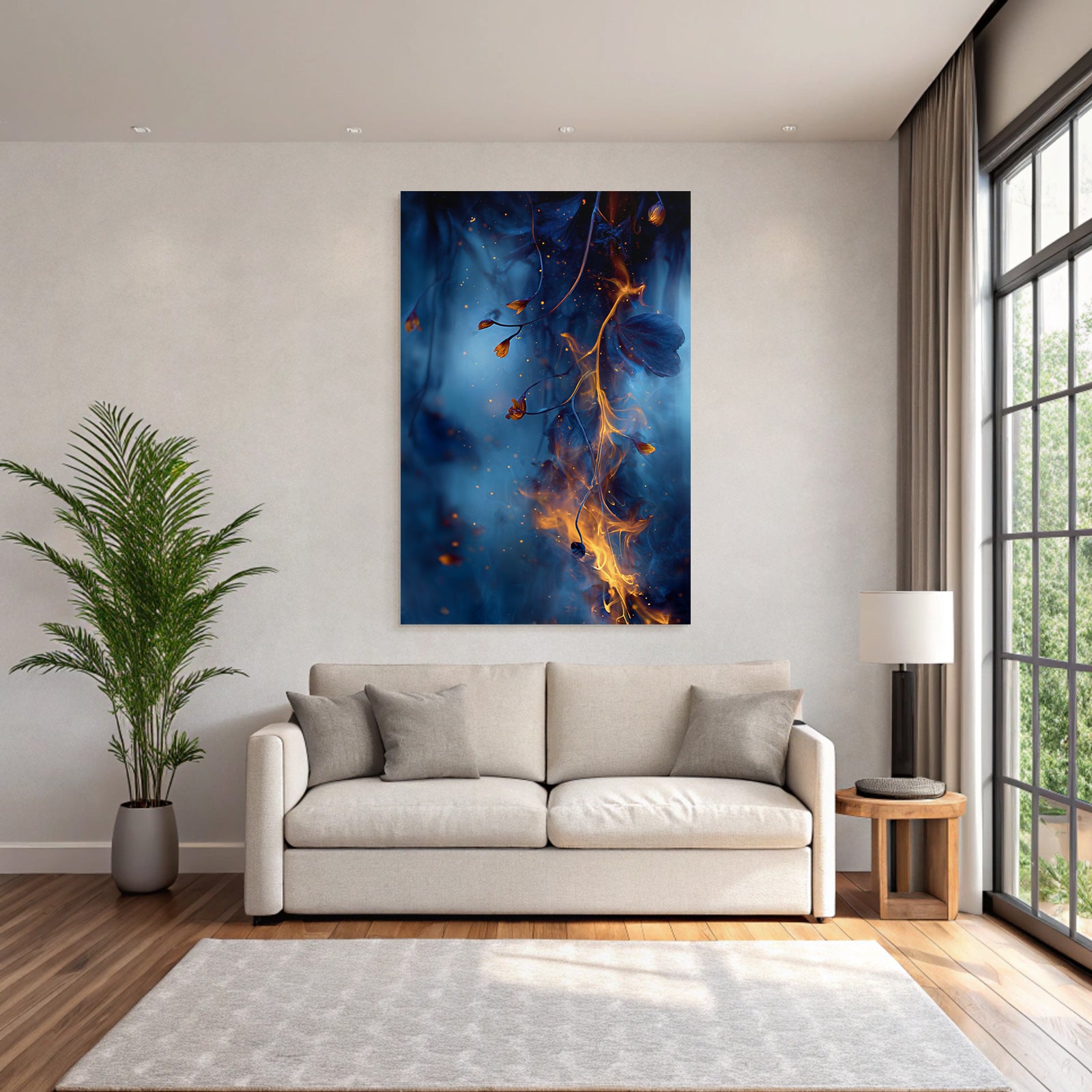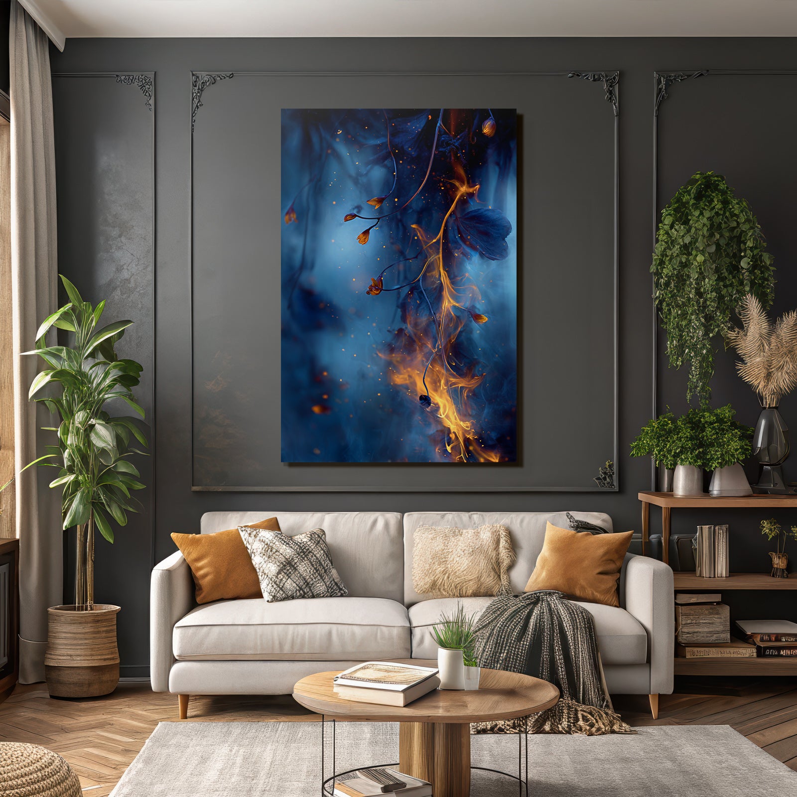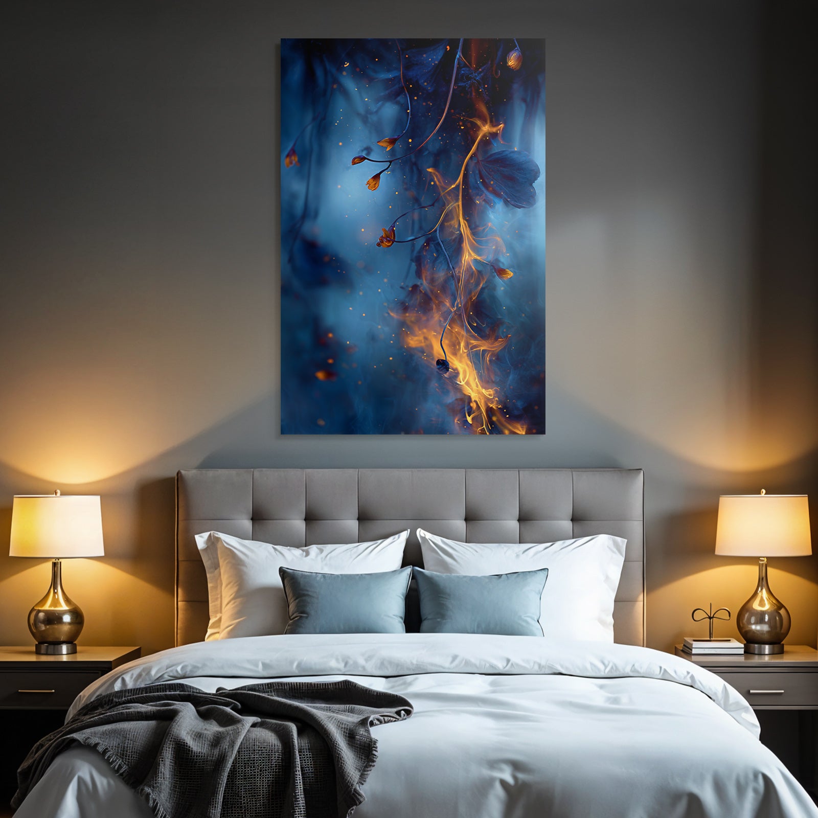 Ein Meisterwerk im Stil Nahaufnahmen: „Blumen Und Flammen Auf Dunkelblaüm Hintergrund“ fängt die Atmosphäre und die typischen Elemente dieses Stils ein und wird im FameFrame zum zeitlosen Hingucker.