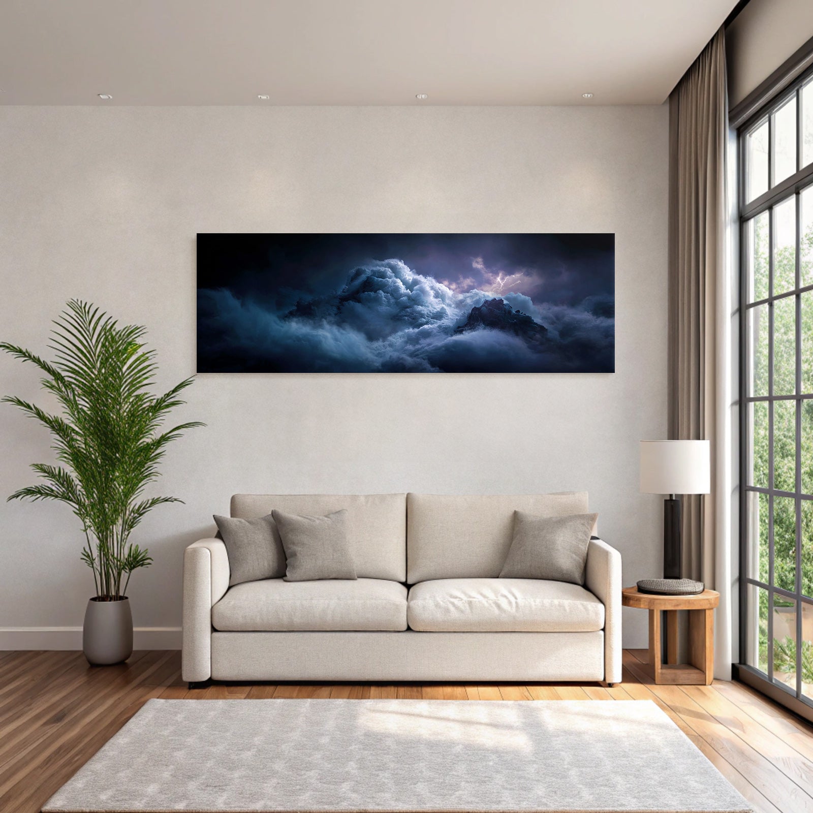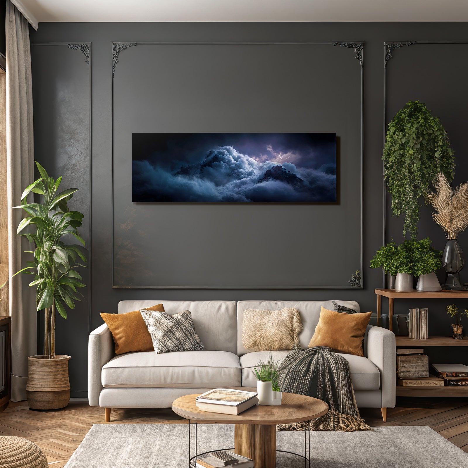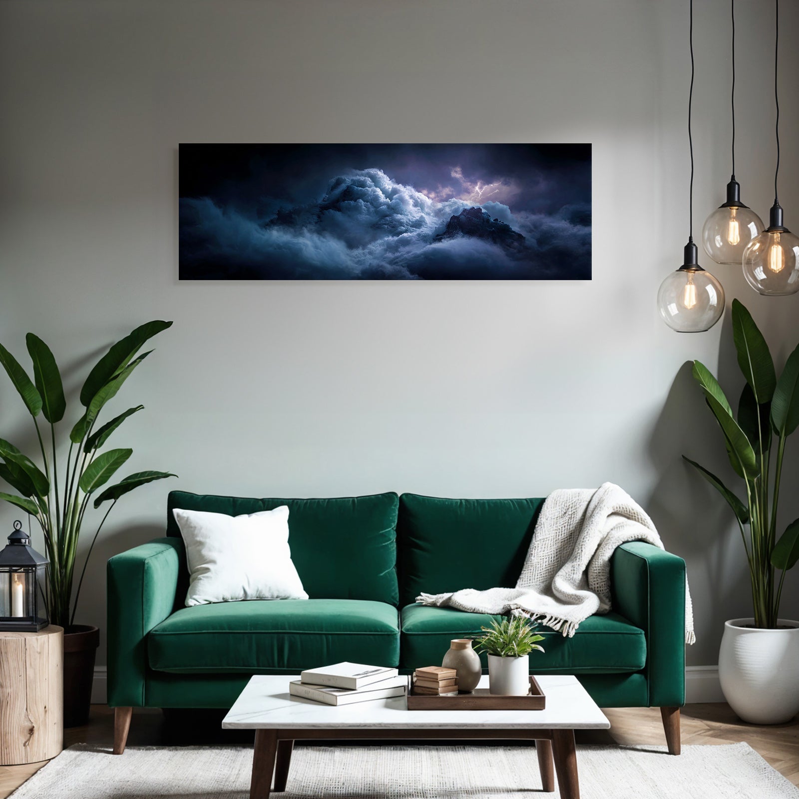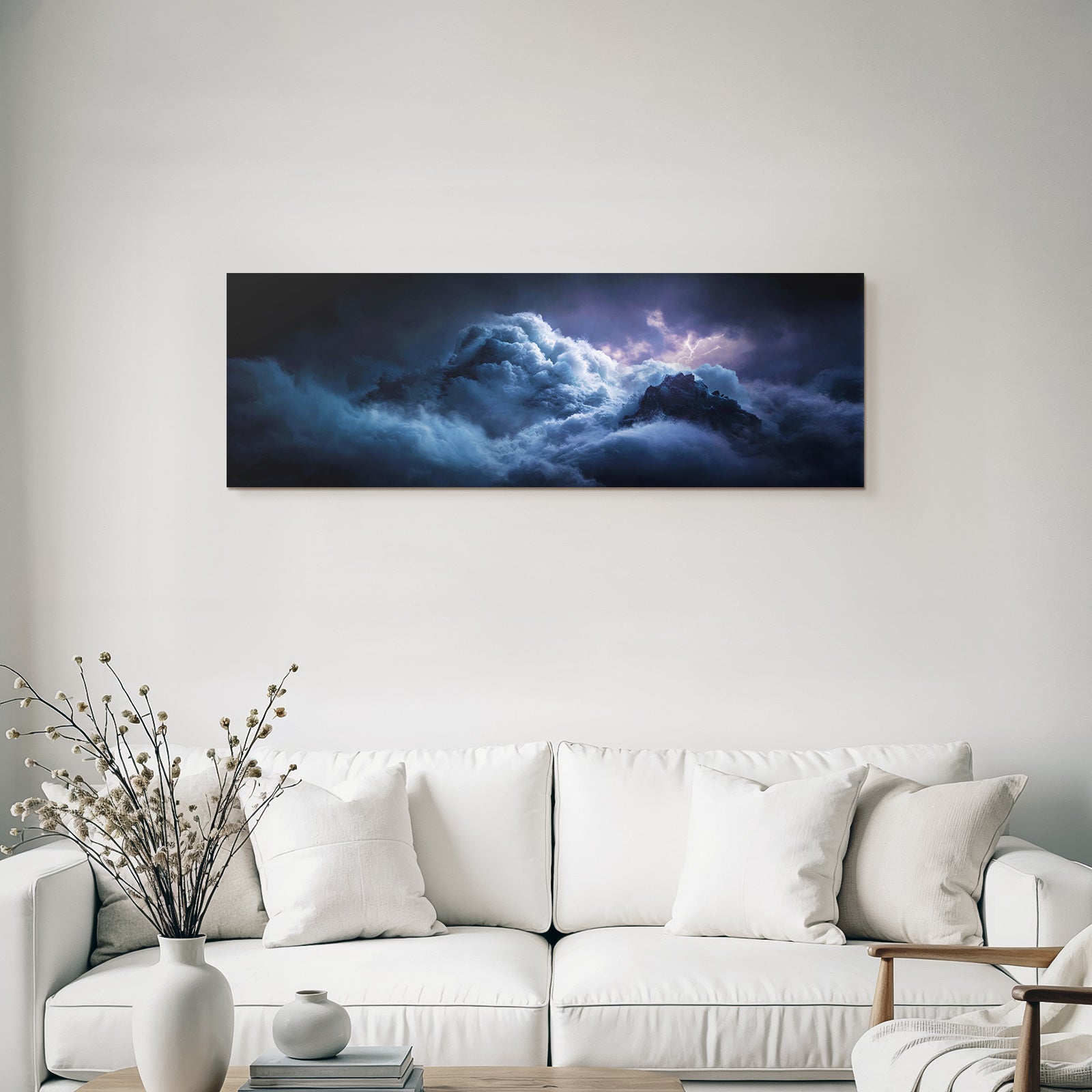 Erleben Sie die pure Essenz von Nahaufnahmen. Das Werk „Dramatische Gewitterwolken Über Felsigen Gipfeln“ wird durch den hochwertigen Textildruck im FameFrame zu einem Statement-Piece.