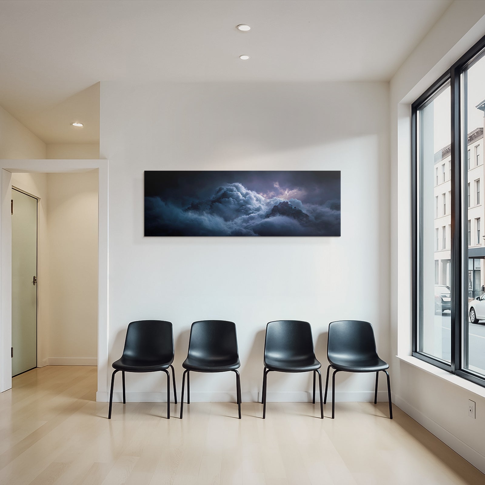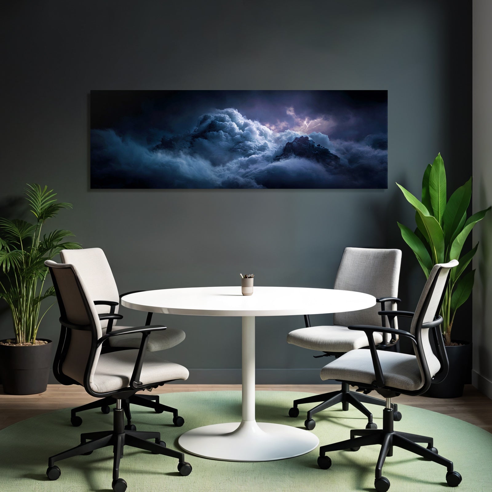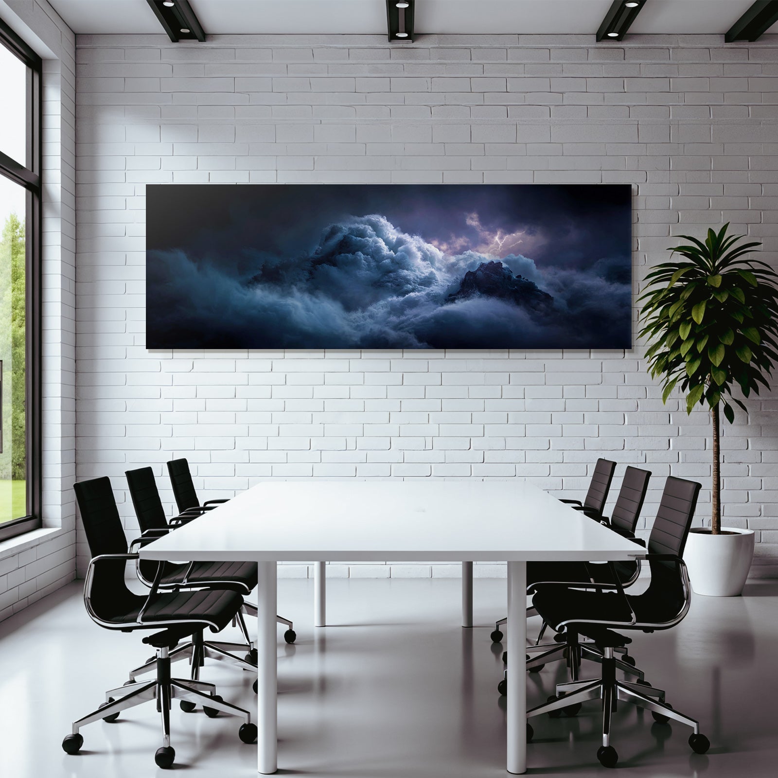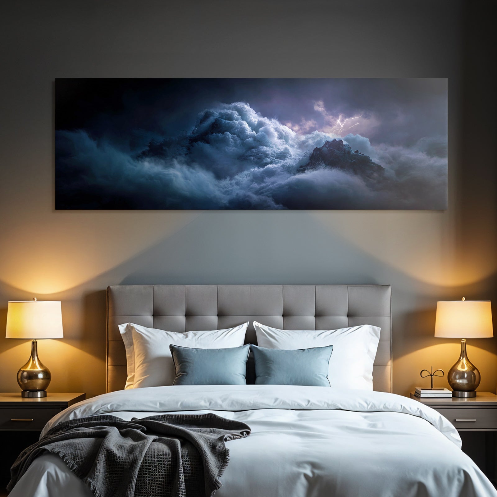 Erleben Sie die pure Essenz von Nahaufnahmen. Das Werk „Dramatische Gewitterwolken Über Felsigen Gipfeln“ wird durch den hochwertigen Textildruck im FameFrame zu einem Statement-Piece.
