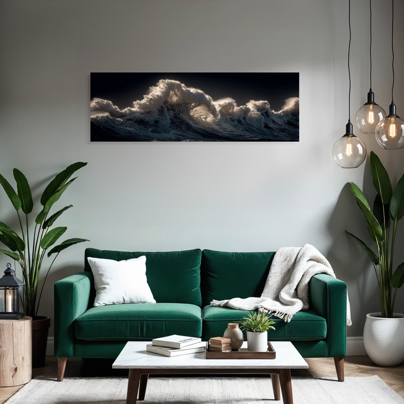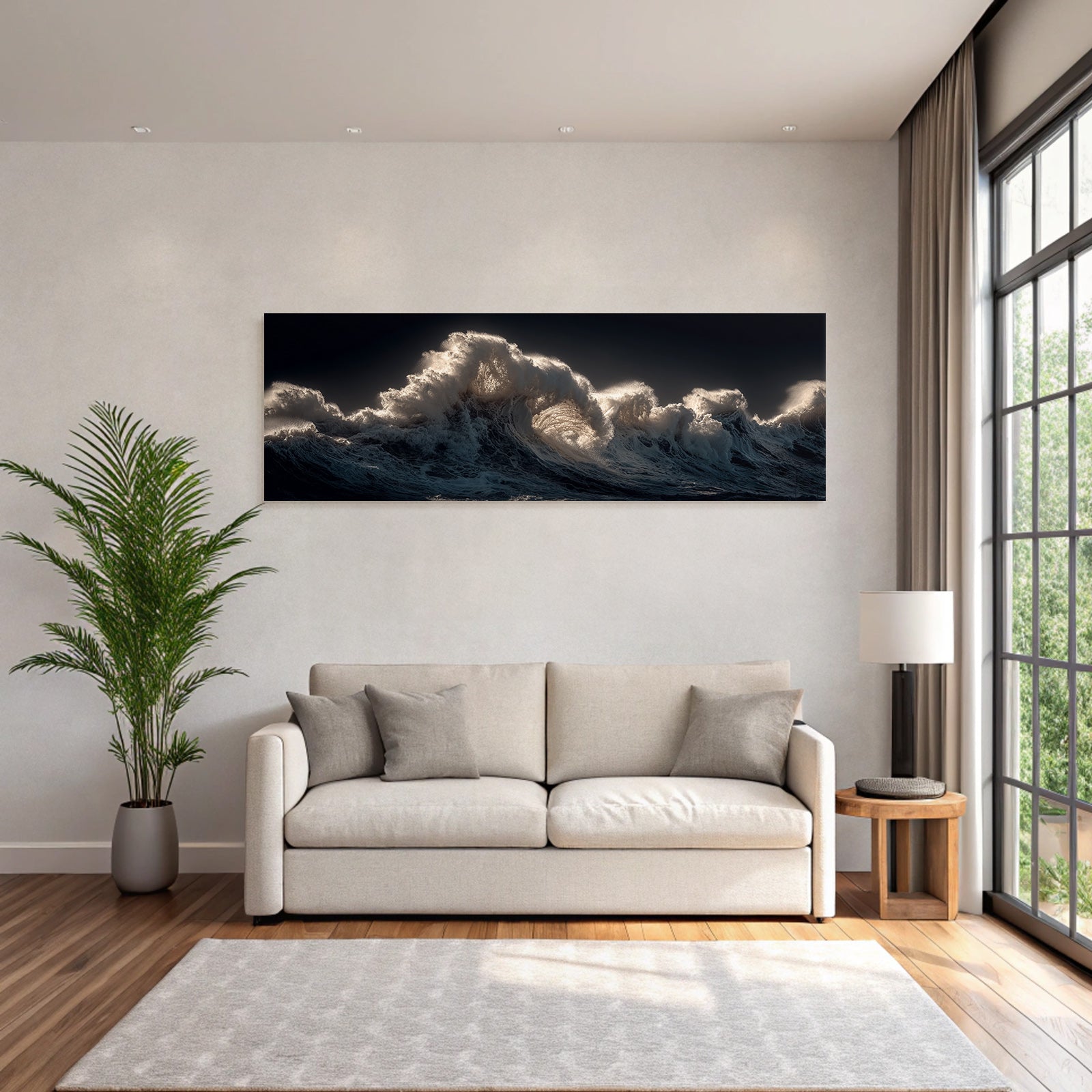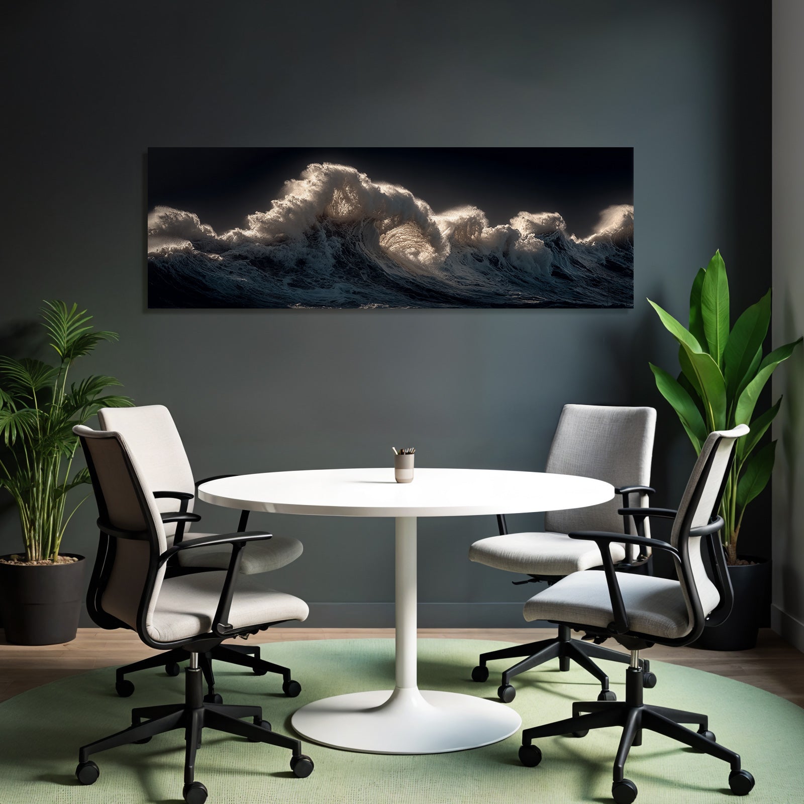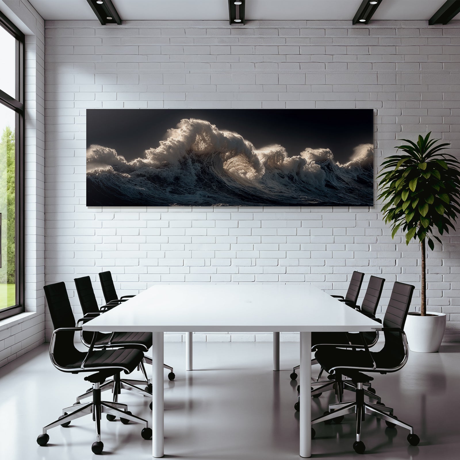 Gestalten Sie Ihr Homeoffice oder Büro inspirierend und modern. „Dramatische Ozeanwellen Im Lichtspiel“ im Nahaufnahmen-Look sorgt im FameFrame für eine kreative Arbeitsatmosphäre.