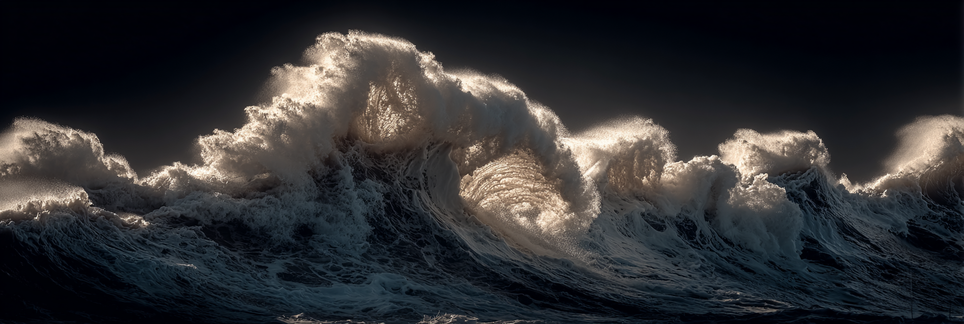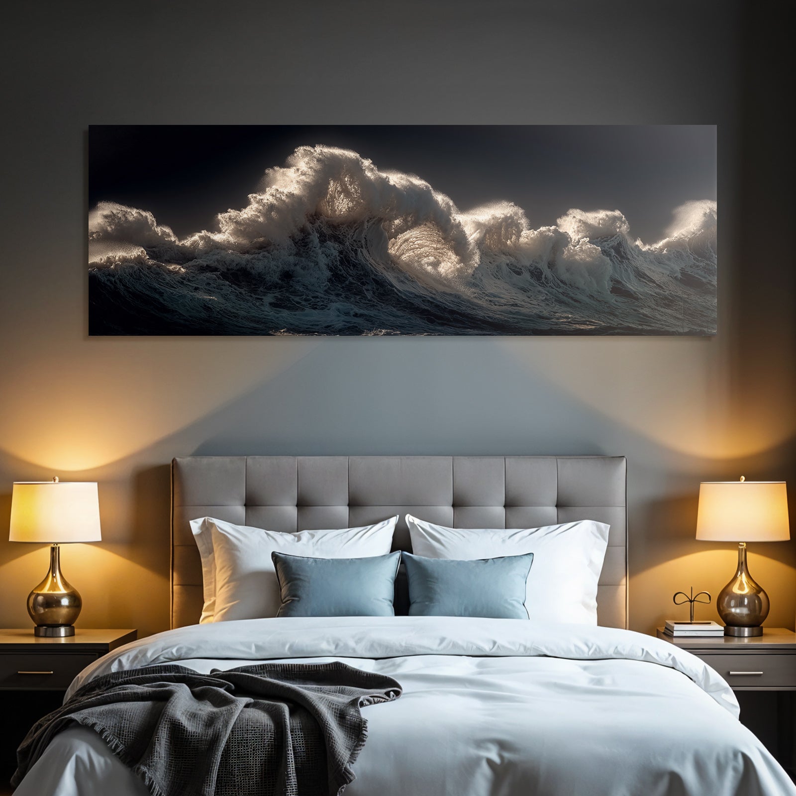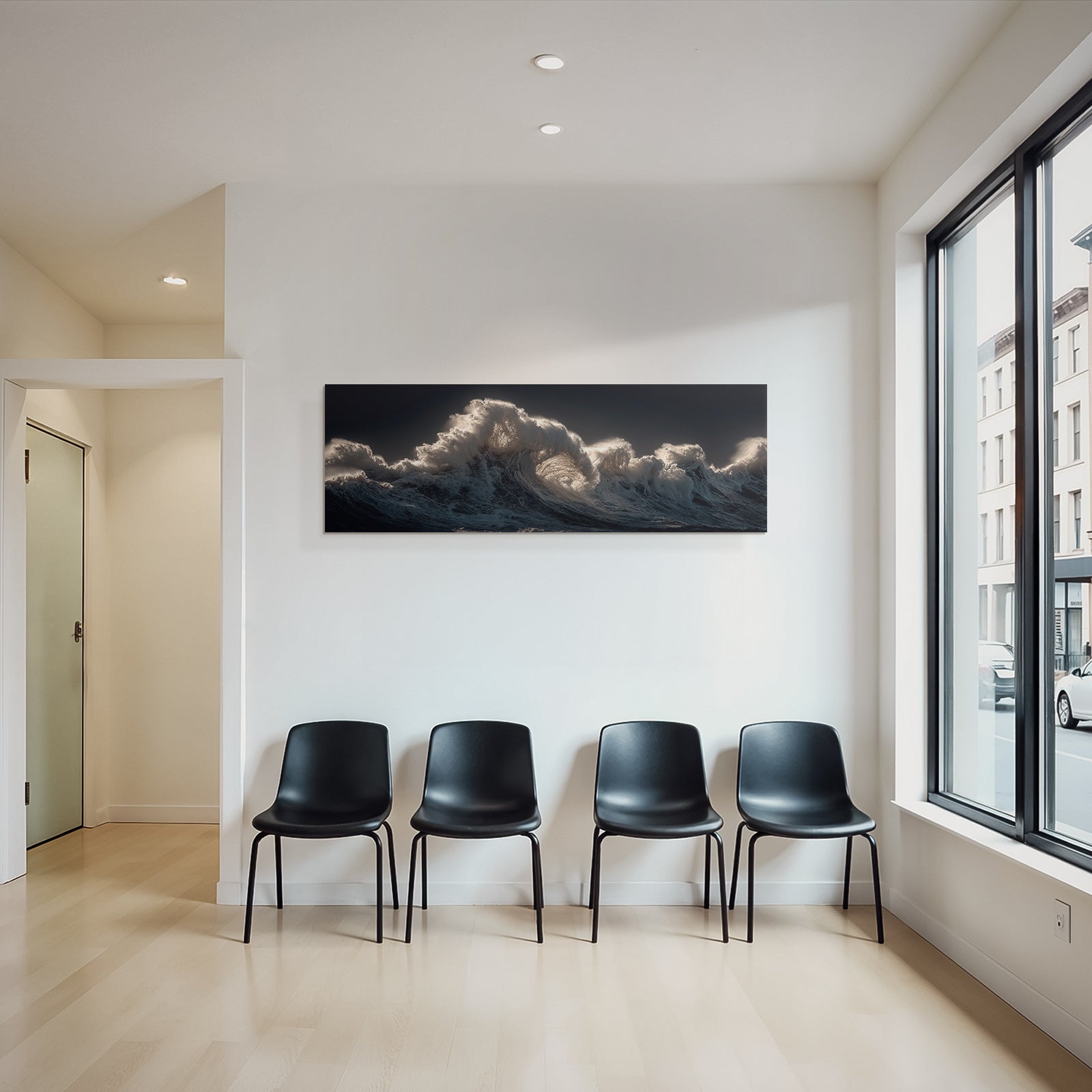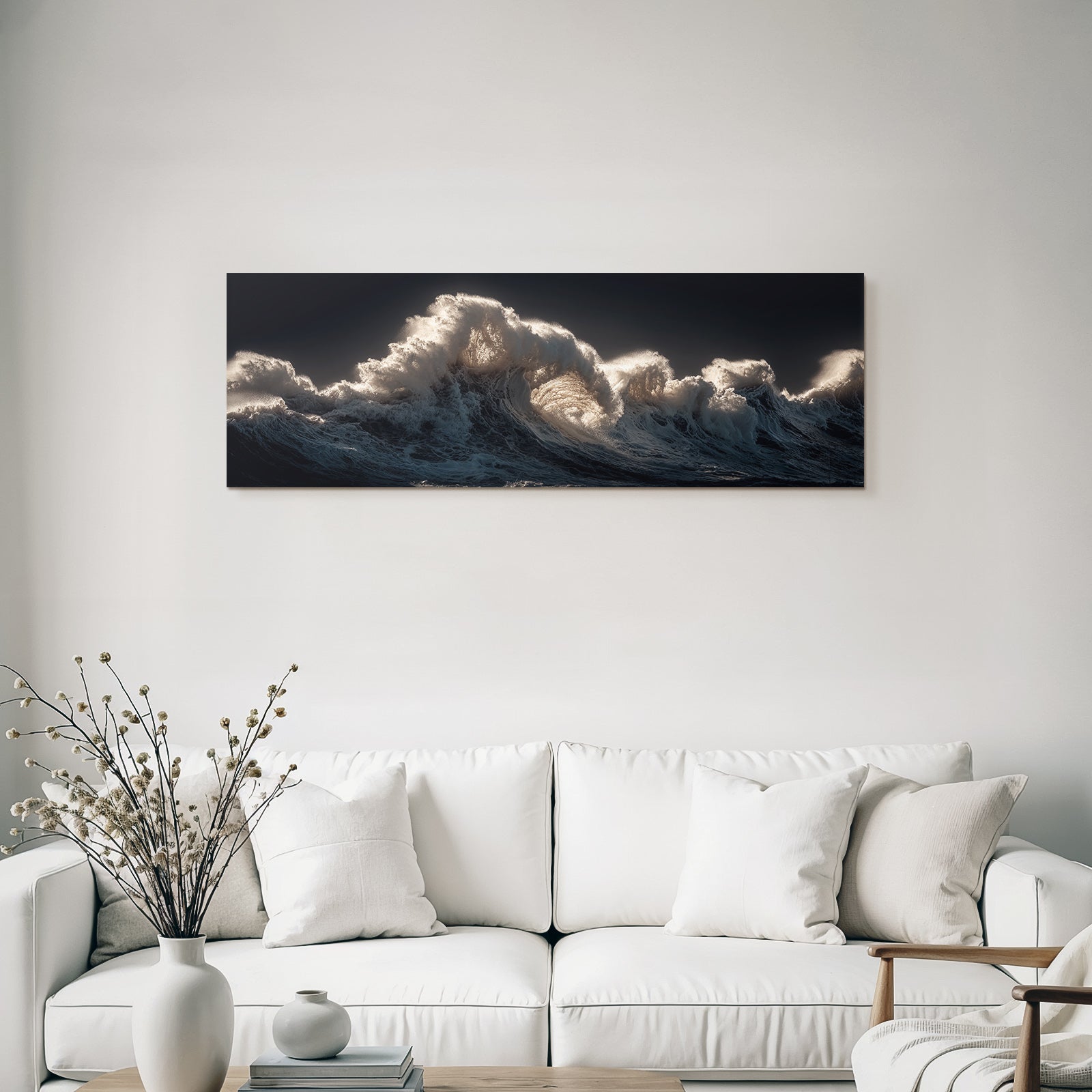 Gestalten Sie Ihr Homeoffice oder Büro inspirierend und modern. „Dramatische Ozeanwellen Im Lichtspiel“ im Nahaufnahmen-Look sorgt im FameFrame für eine kreative Arbeitsatmosphäre.