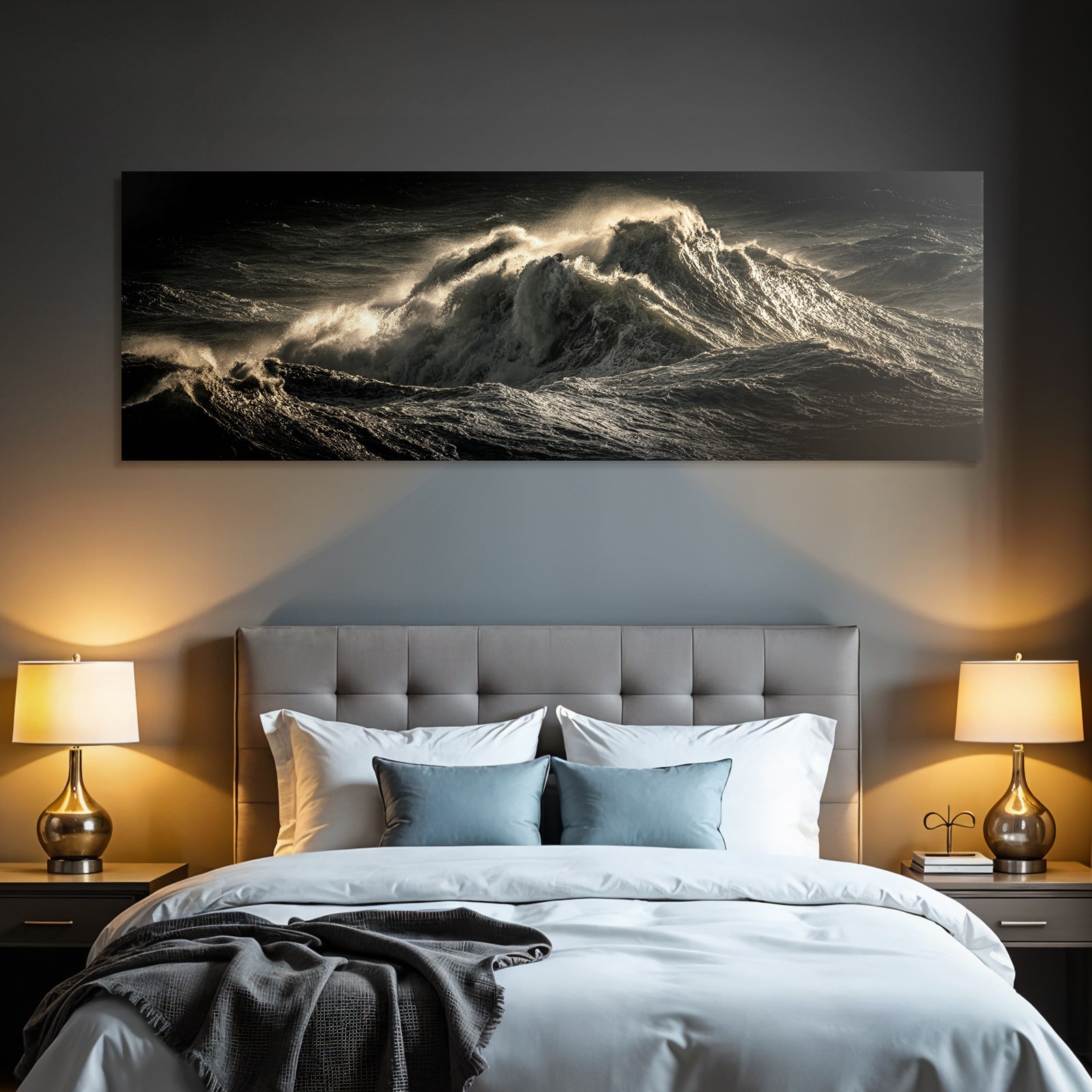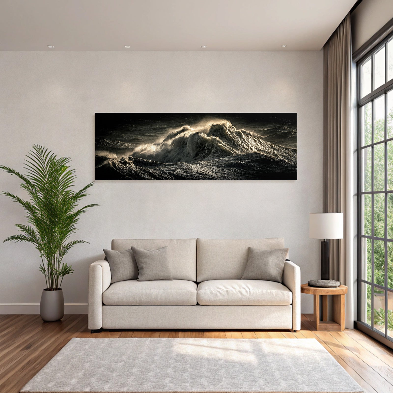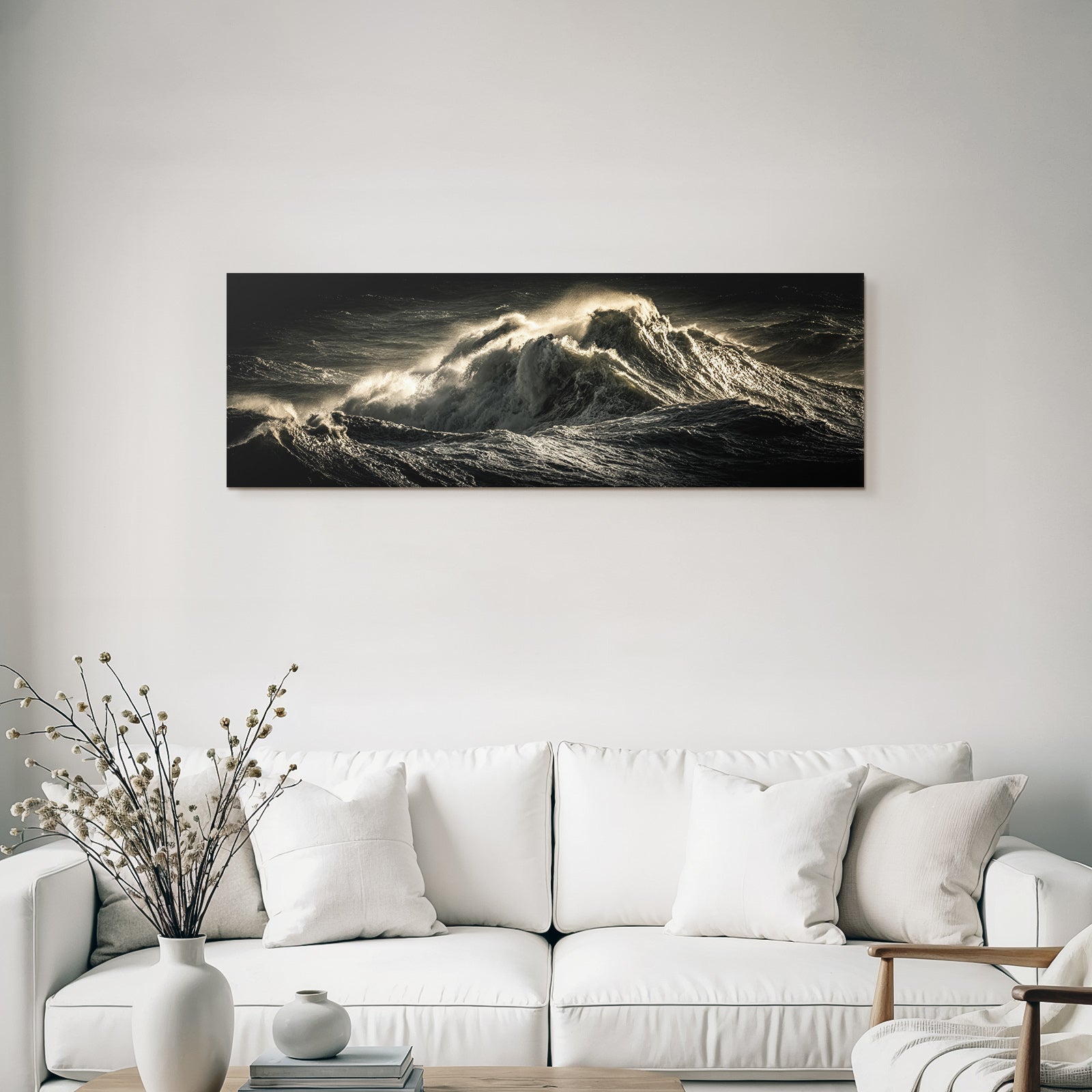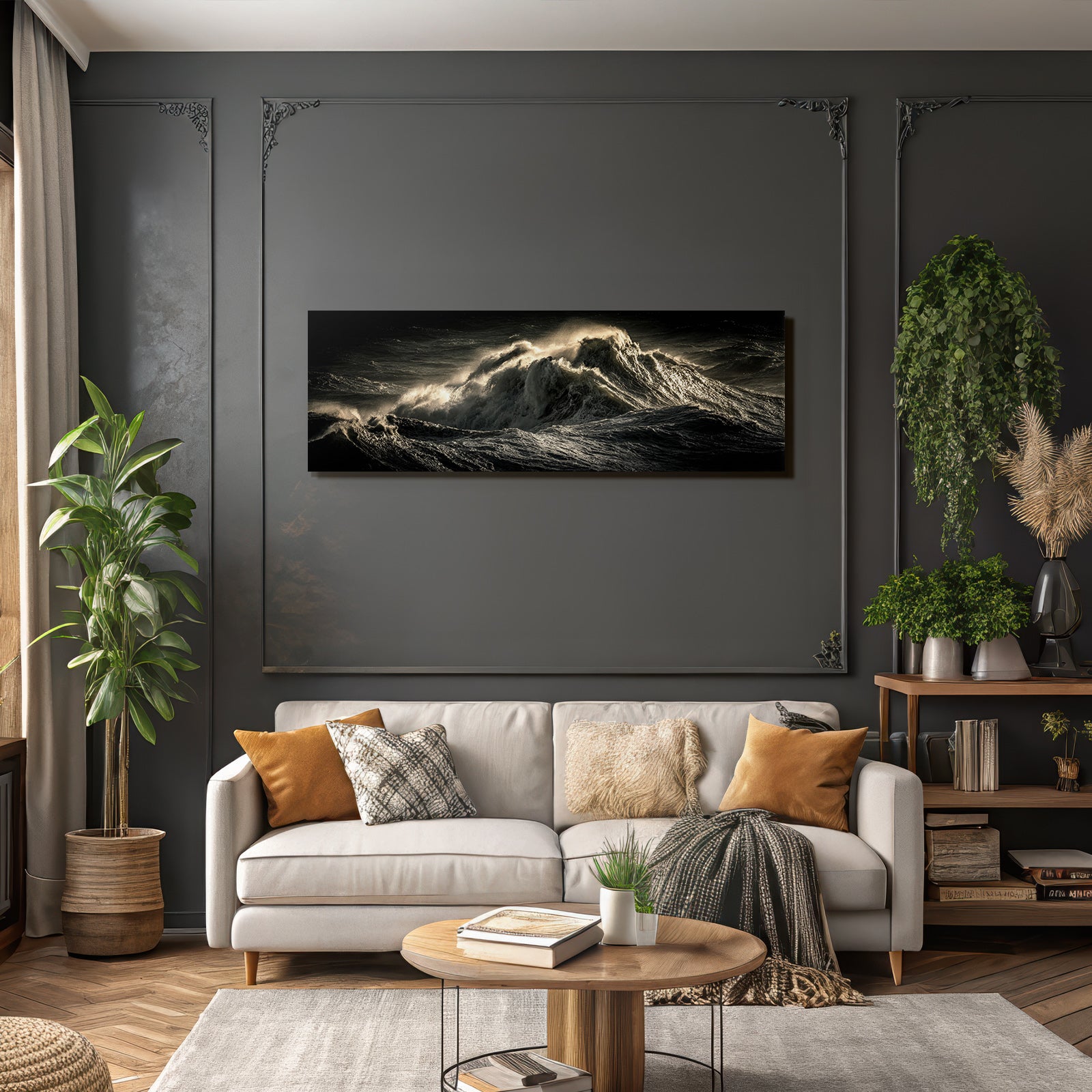 Für Liebhaber des Nahaufnahmen-Looks: Das Kunstwerk „Dramatische Ozeanwellen In Stürmischer Beleuchtung“ bringt die charakteristischen Merkmale dieses Stils brillant auf Stoff – perfektioniert durch den FameFrame.