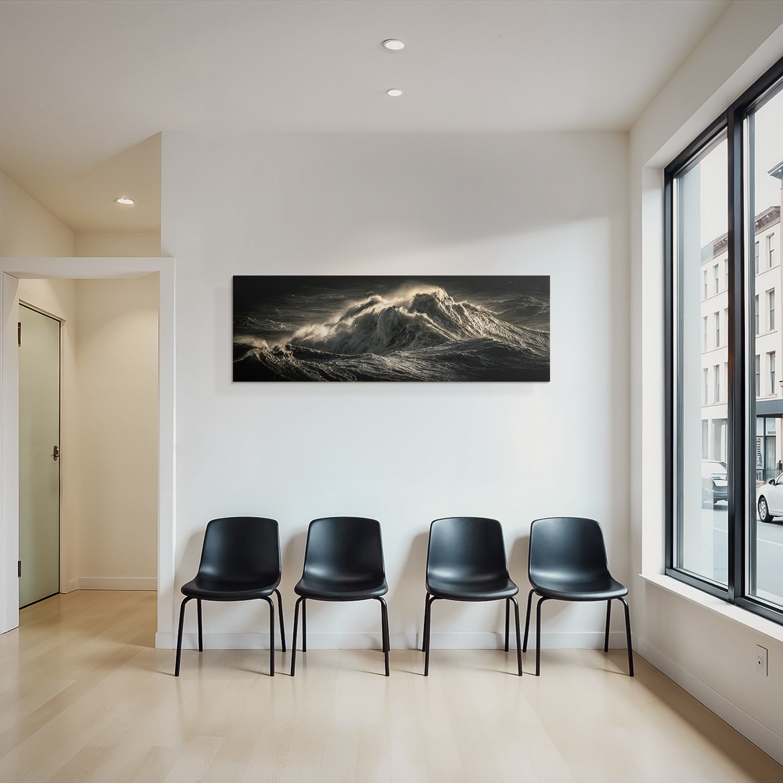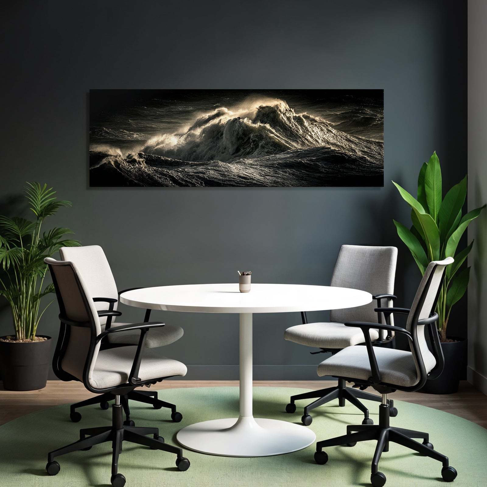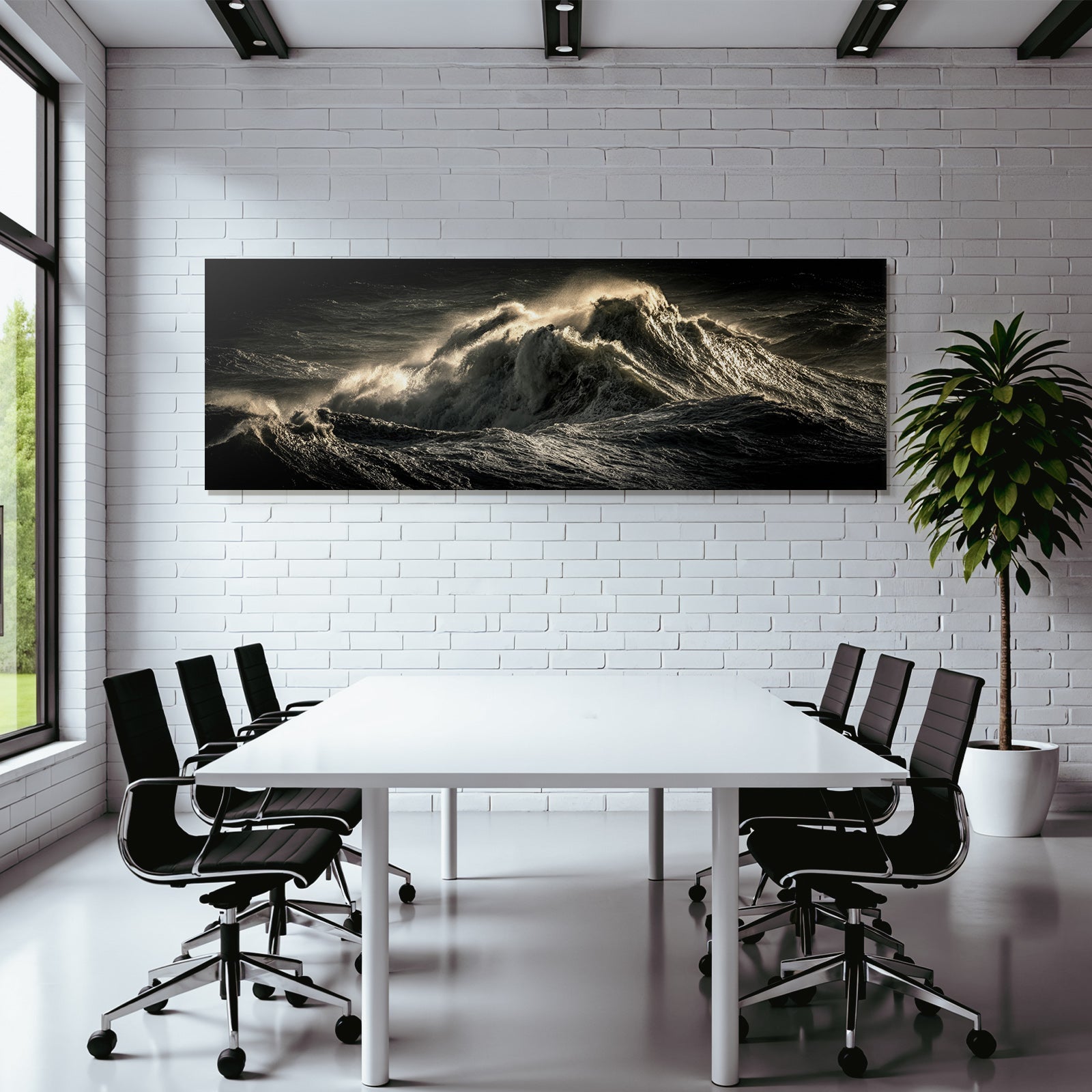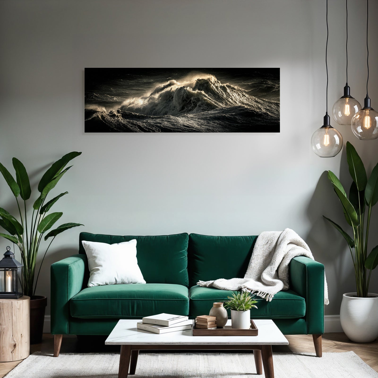 Für Liebhaber des Nahaufnahmen-Looks: Das Kunstwerk „Dramatische Ozeanwellen In Stürmischer Beleuchtung“ bringt die charakteristischen Merkmale dieses Stils brillant auf Stoff – perfektioniert durch den FameFrame.