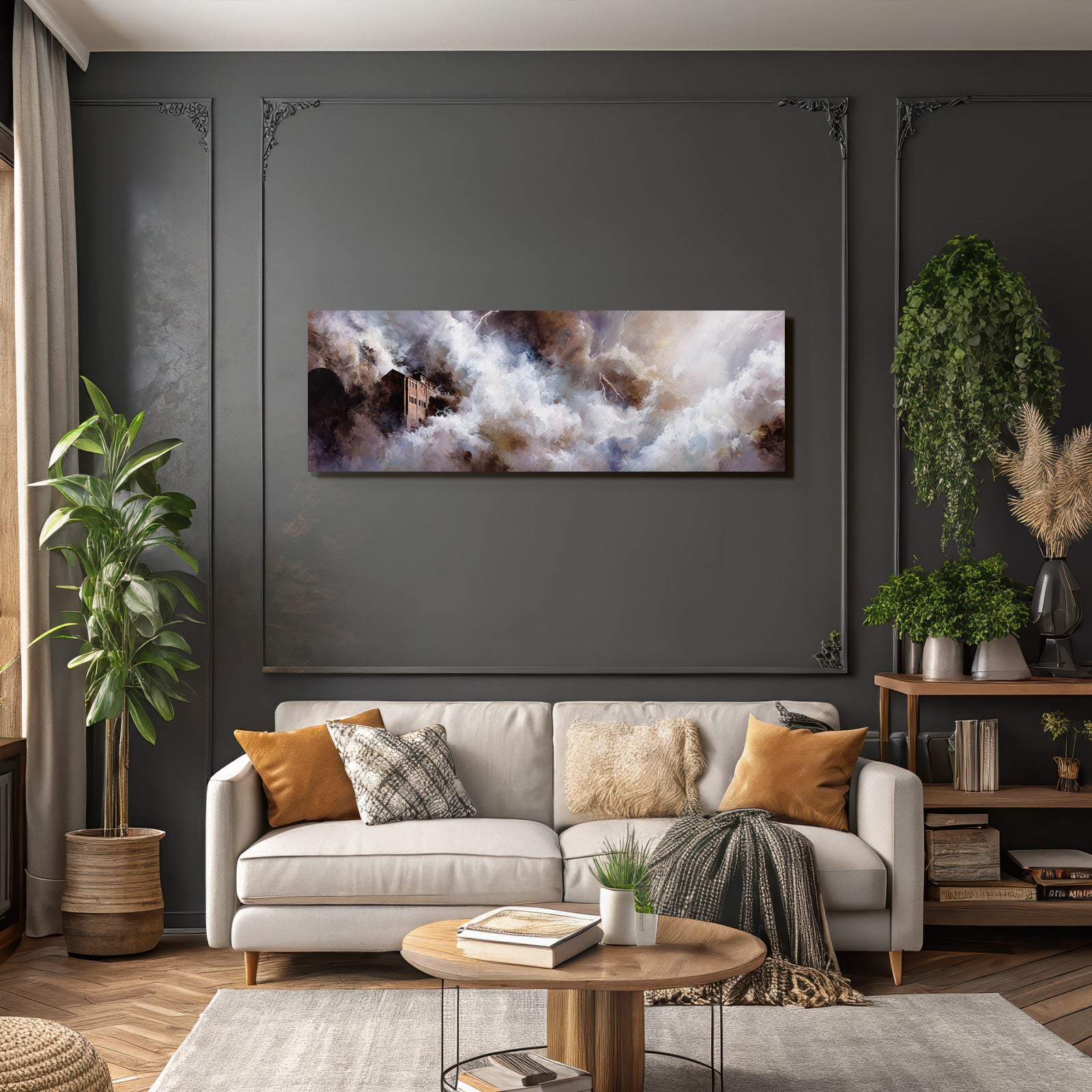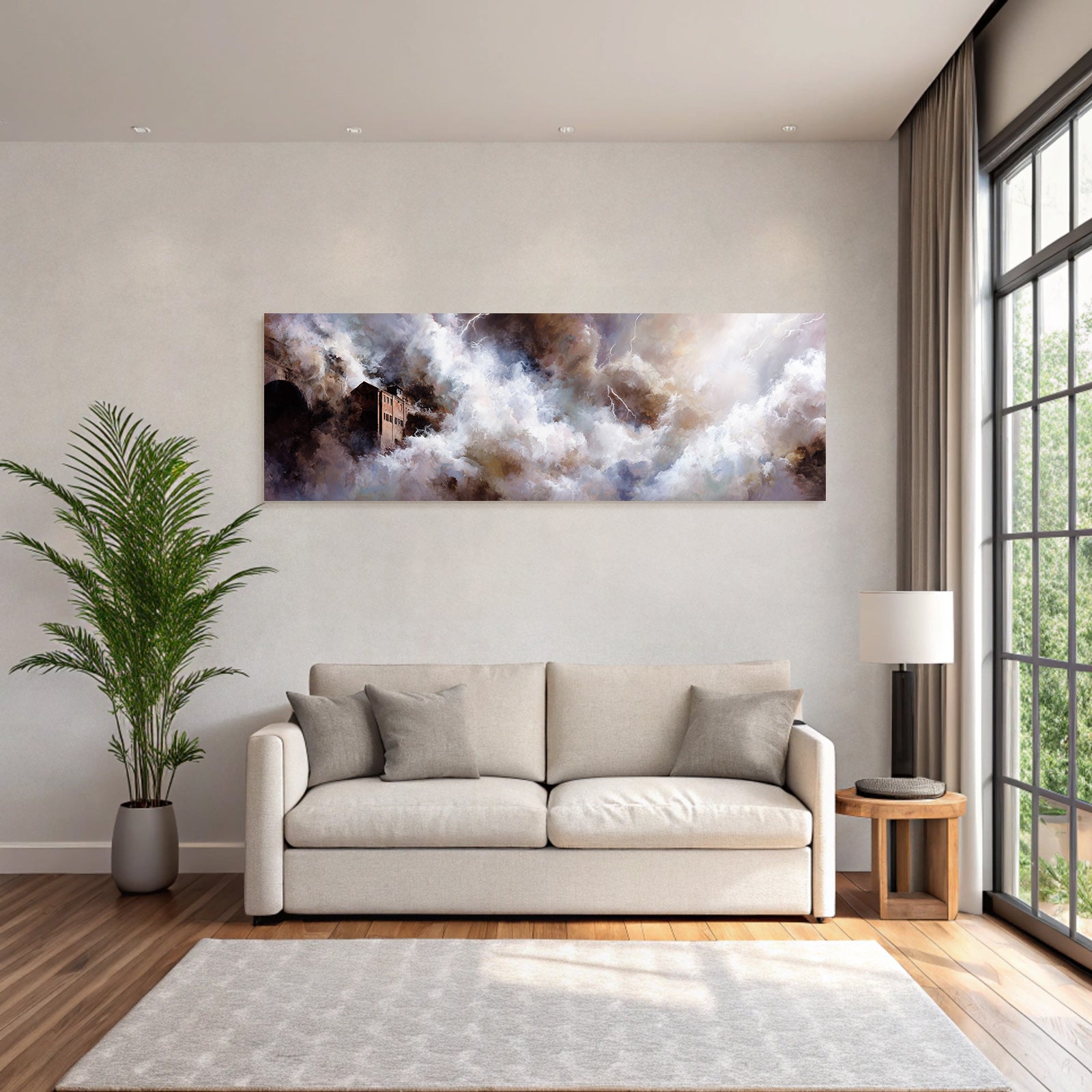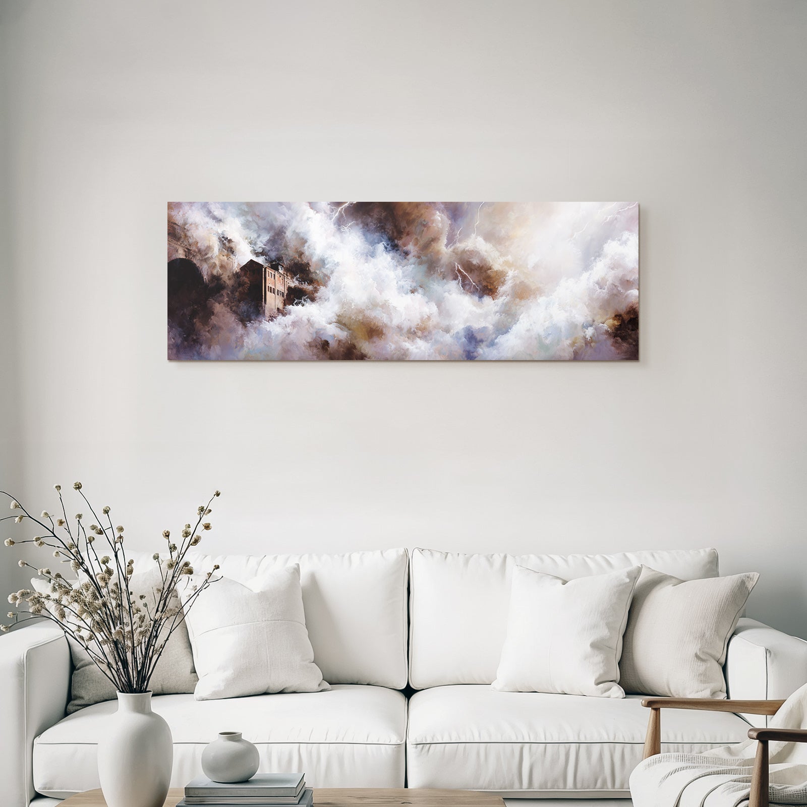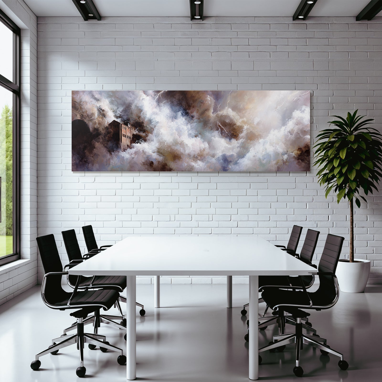 „Dramatisches Gewitter Über Historischem Gebäude“ verleiht Ihrem Raum Charakter. Die Anlehnung an den Stil Nahaufnahmen, kombiniert mit der schlichten Eleganz des FameFrame, schafft eine einzigartige Atmosphäre.