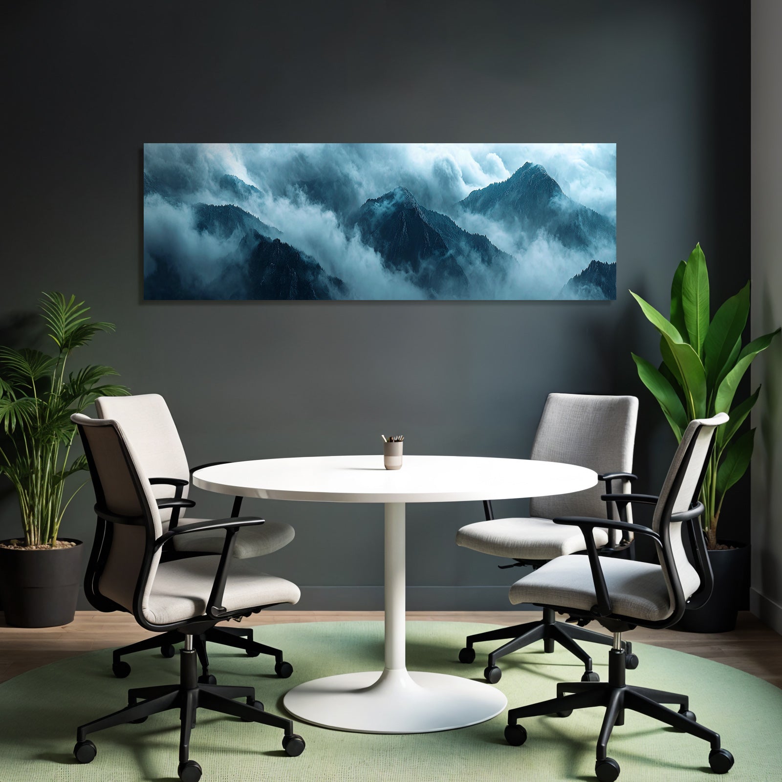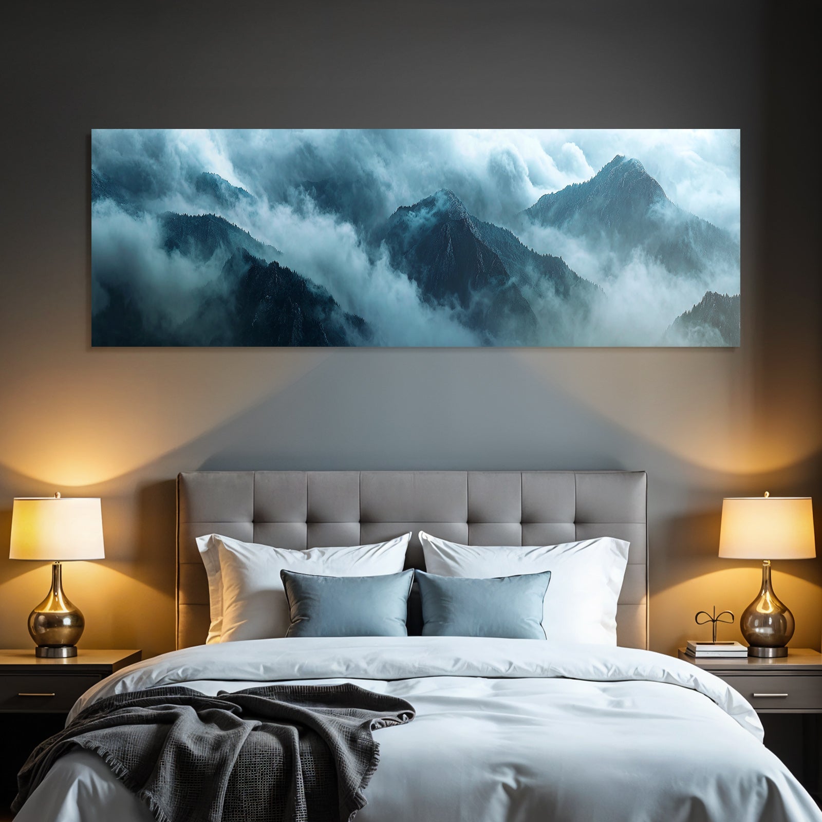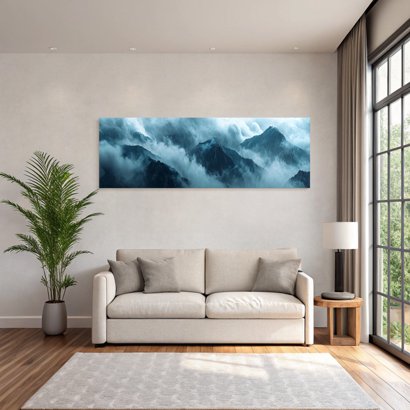 Für Liebhaber des Nahaufnahmen-Looks: Das Kunstwerk „Neblige Berglandschaft Mit Wolkenhülle“ bringt die charakteristischen Merkmale dieses Stils brillant auf Stoff – perfektioniert durch den FameFrame.