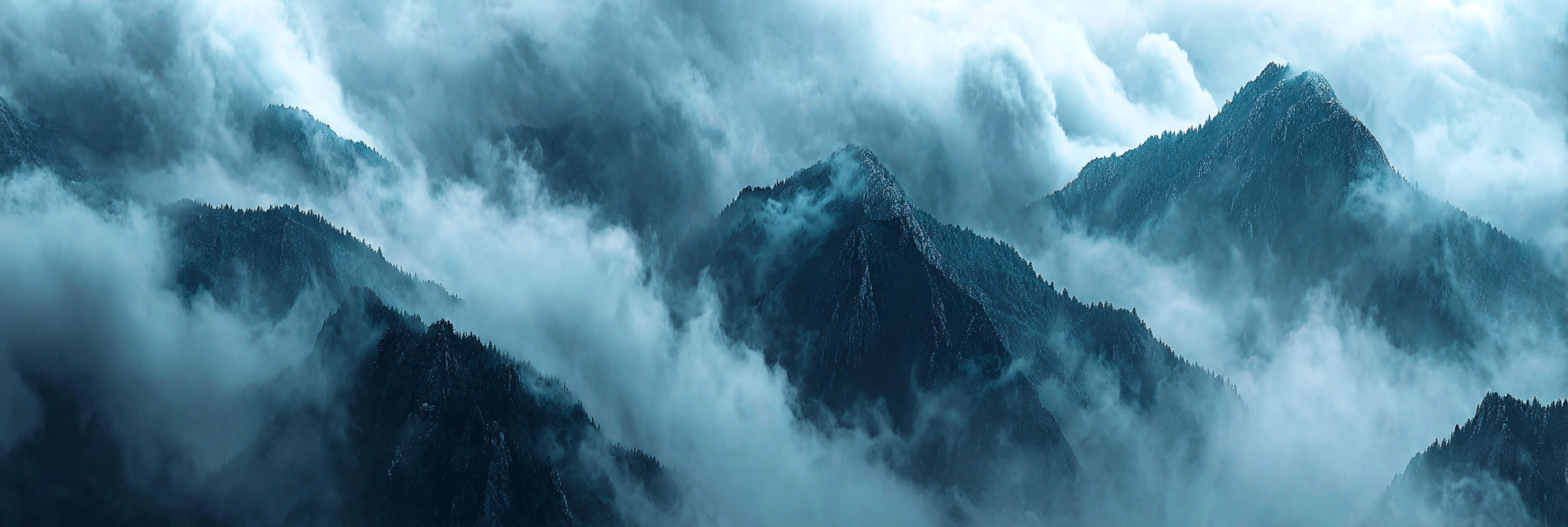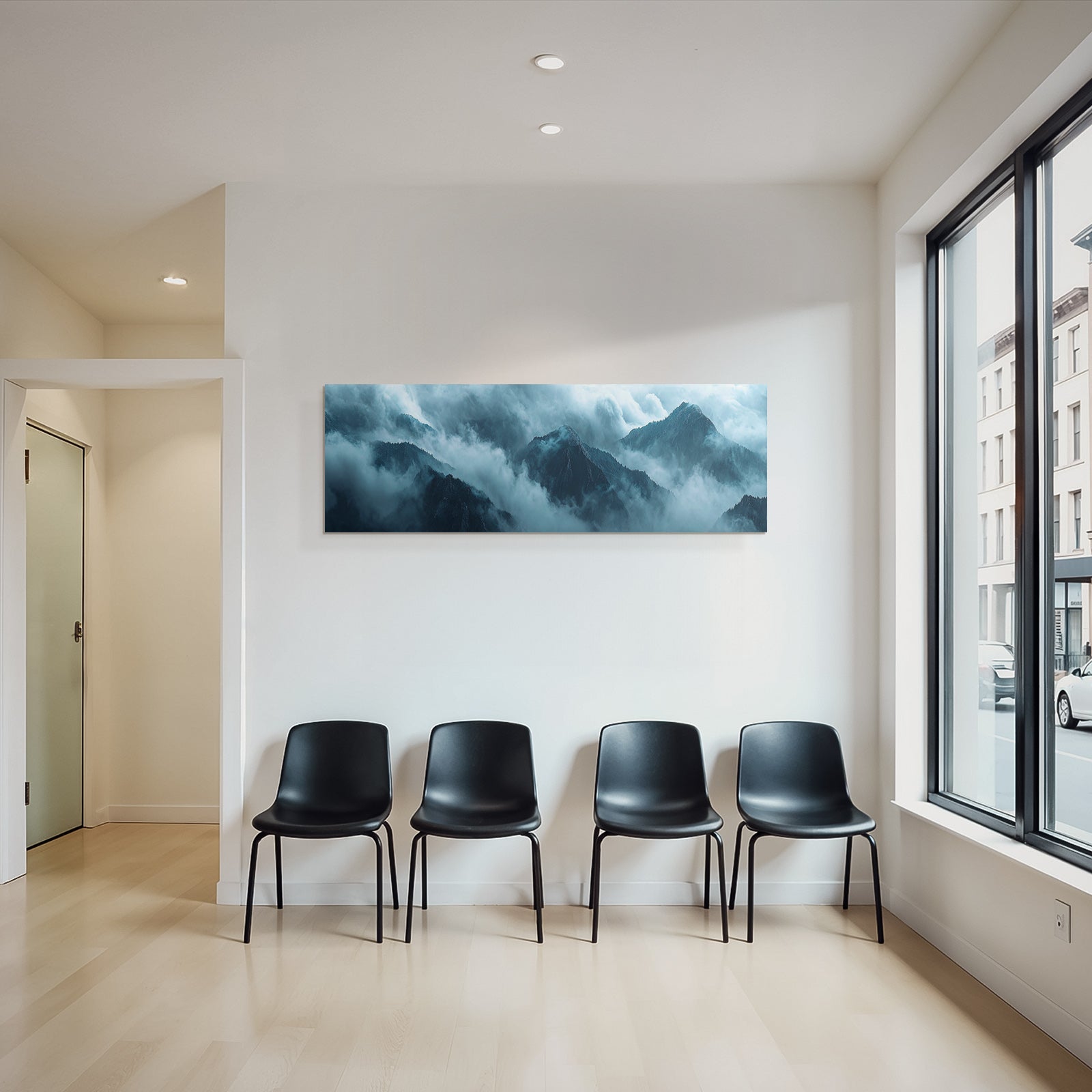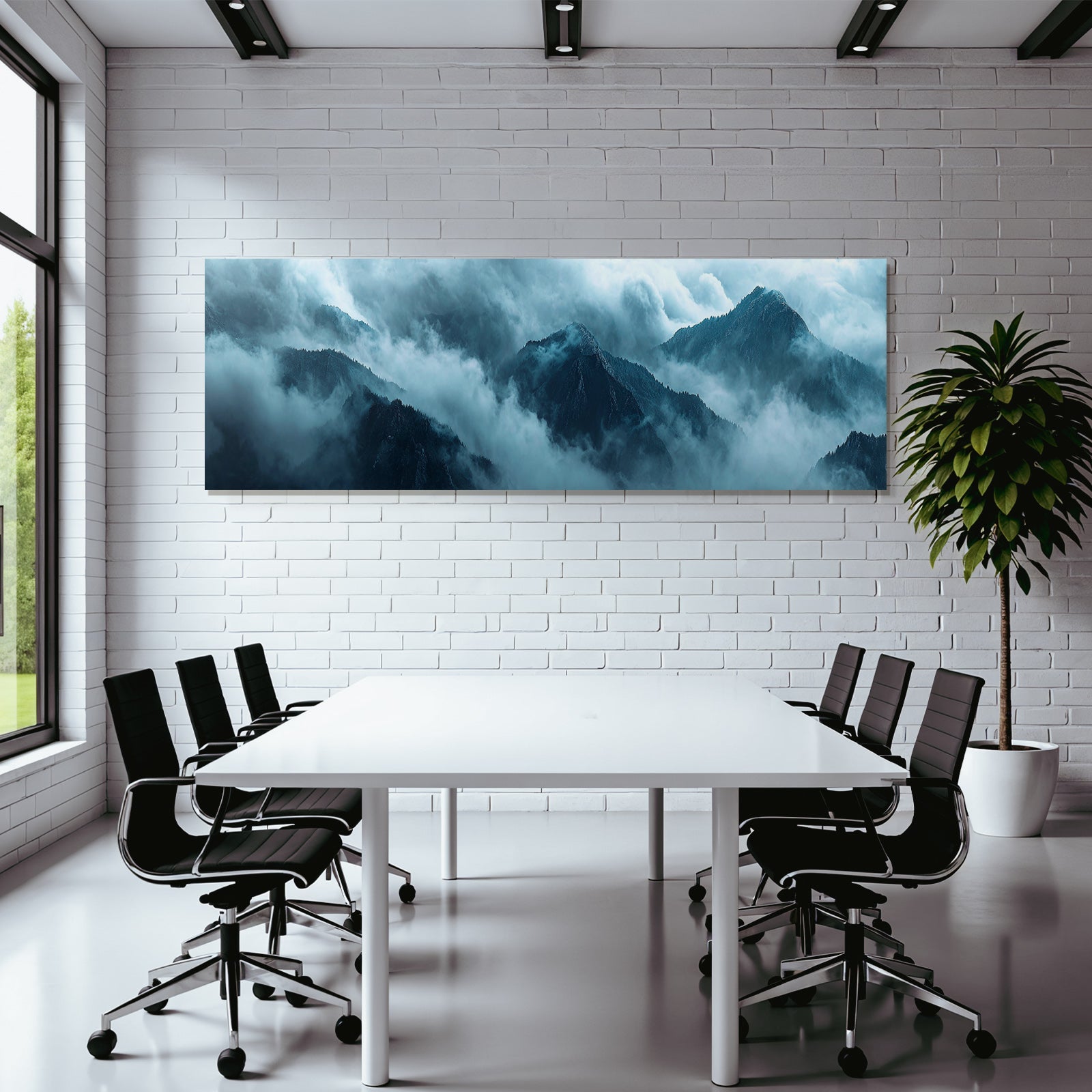 Für Liebhaber des Nahaufnahmen-Looks: Das Kunstwerk „Neblige Berglandschaft Mit Wolkenhülle“ bringt die charakteristischen Merkmale dieses Stils brillant auf Stoff – perfektioniert durch den FameFrame.