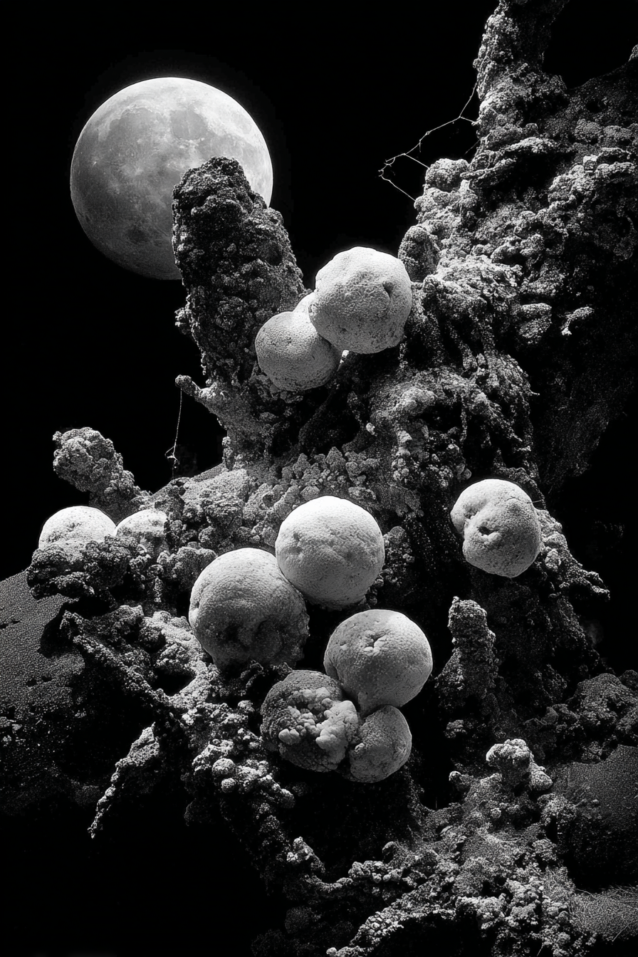 Ein einzigartiges Kunstwerk der Produktlinie FameFrame mit dem Titel „Surreales Mondlicht Und Mikroorganismenlandschaft“, im Stil Nahaufnahmen.
