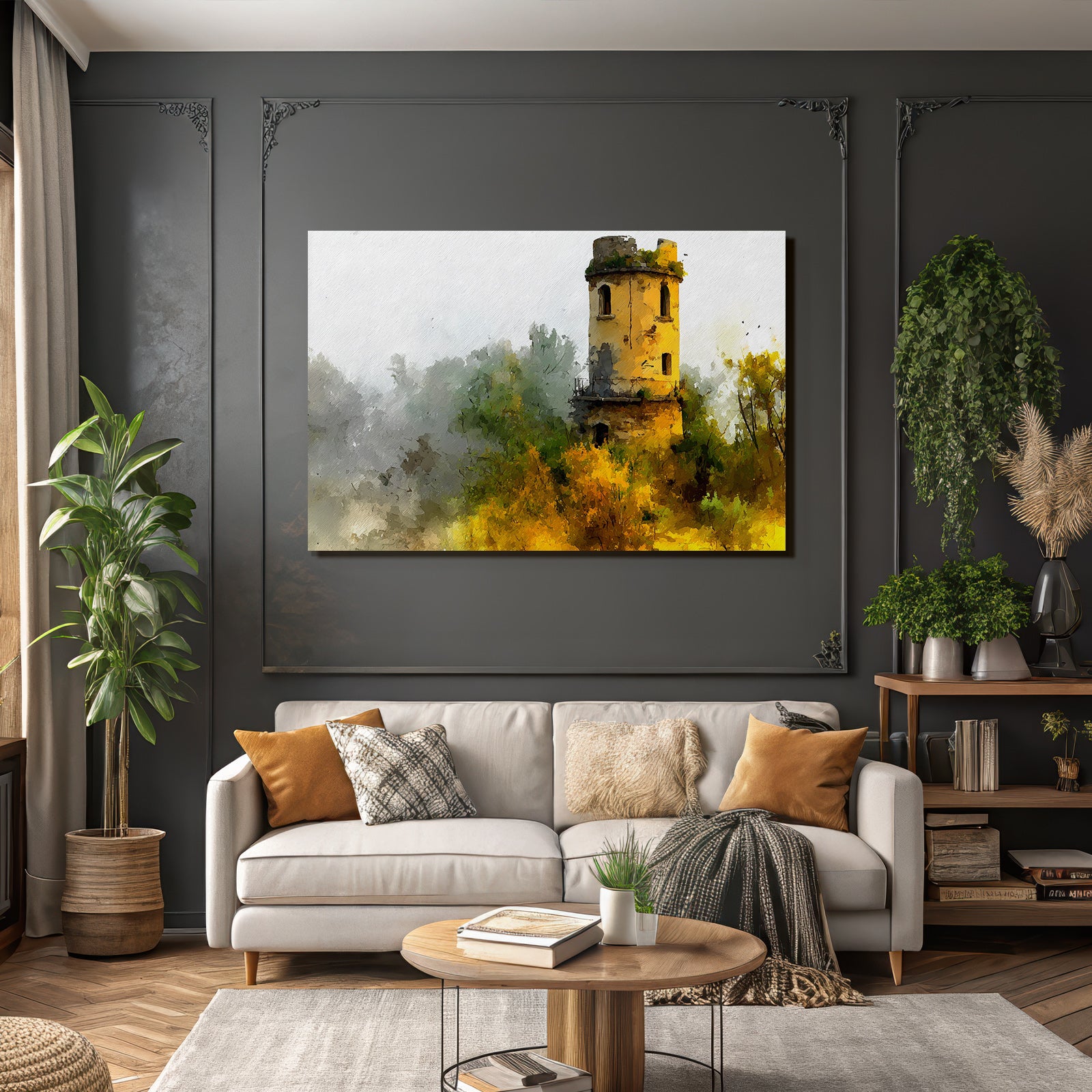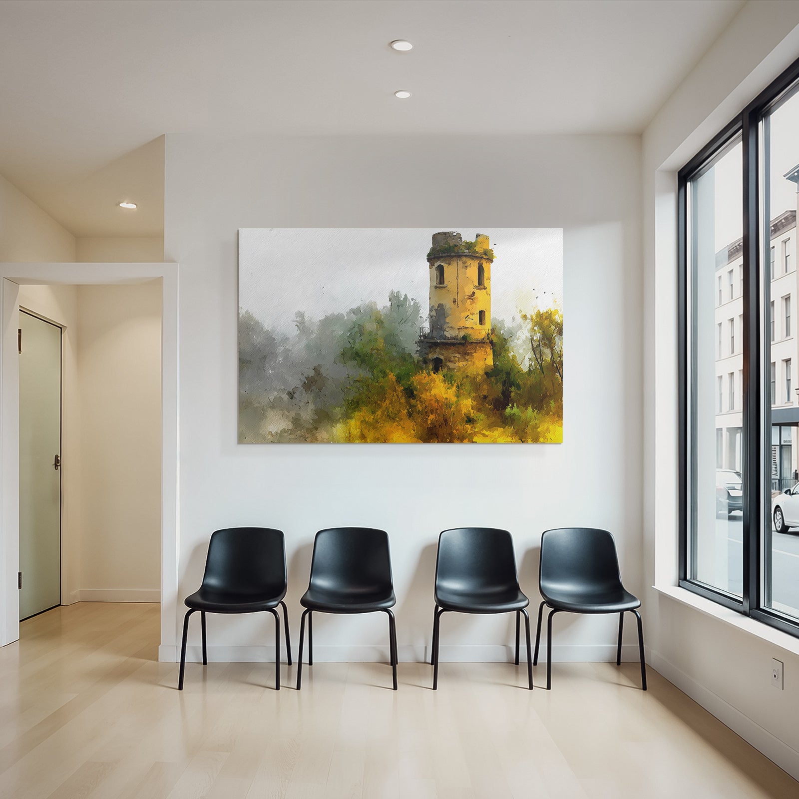 Ein Highlight für Wohnzimmer, Studio oder Empfangsbereich: „Alter Turm Im Nebelwald“ bringt den Stil Nebel und Wetter auf Stoff – gespannt im edlen FameFrame.