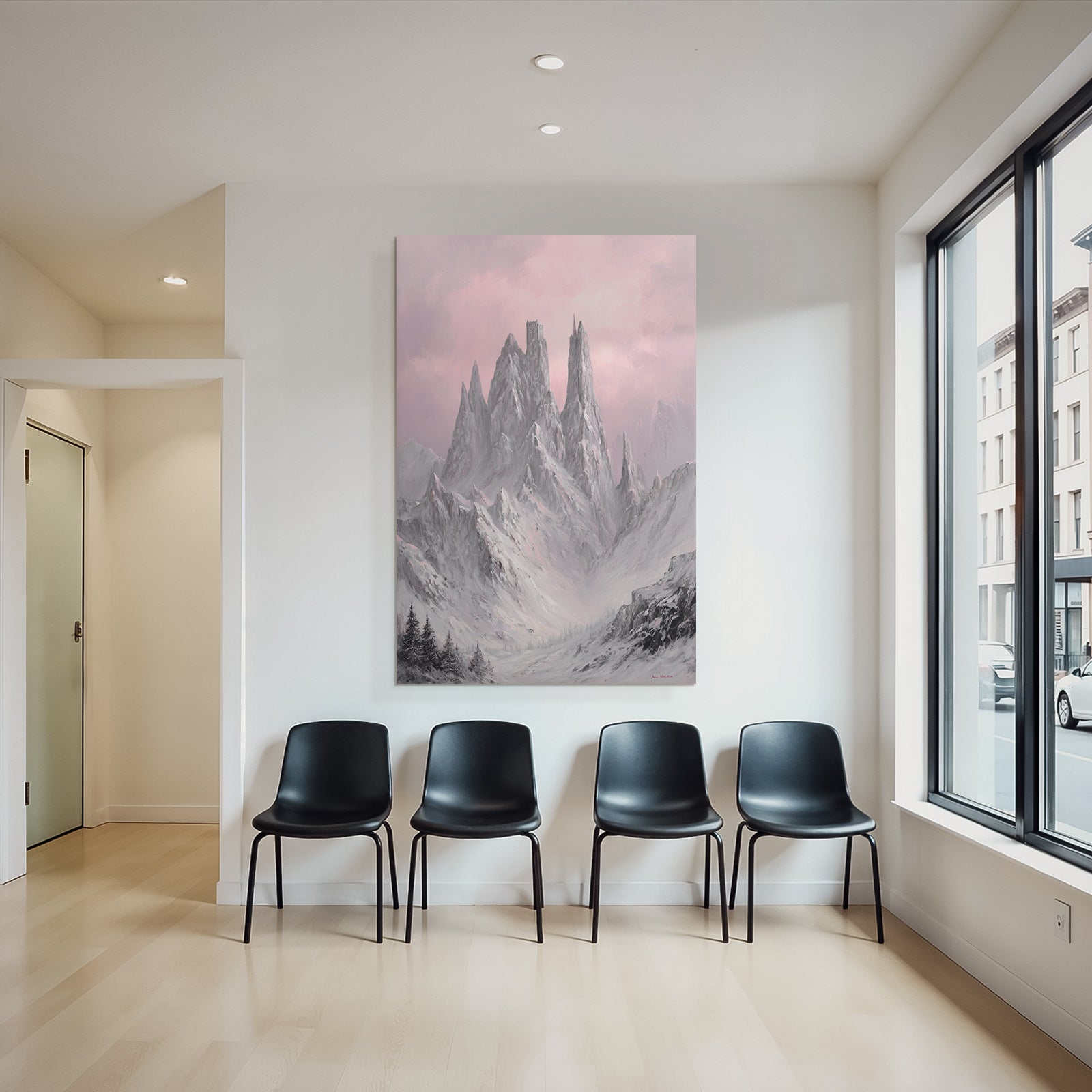 Modern, stilvoll, individuell: „Bergschloss In Rosaroter Winterlandschaft“ im Stil Eis und Schnee überzeugt im hochwertigen FameFrame durch klare Formen und starke Farben.