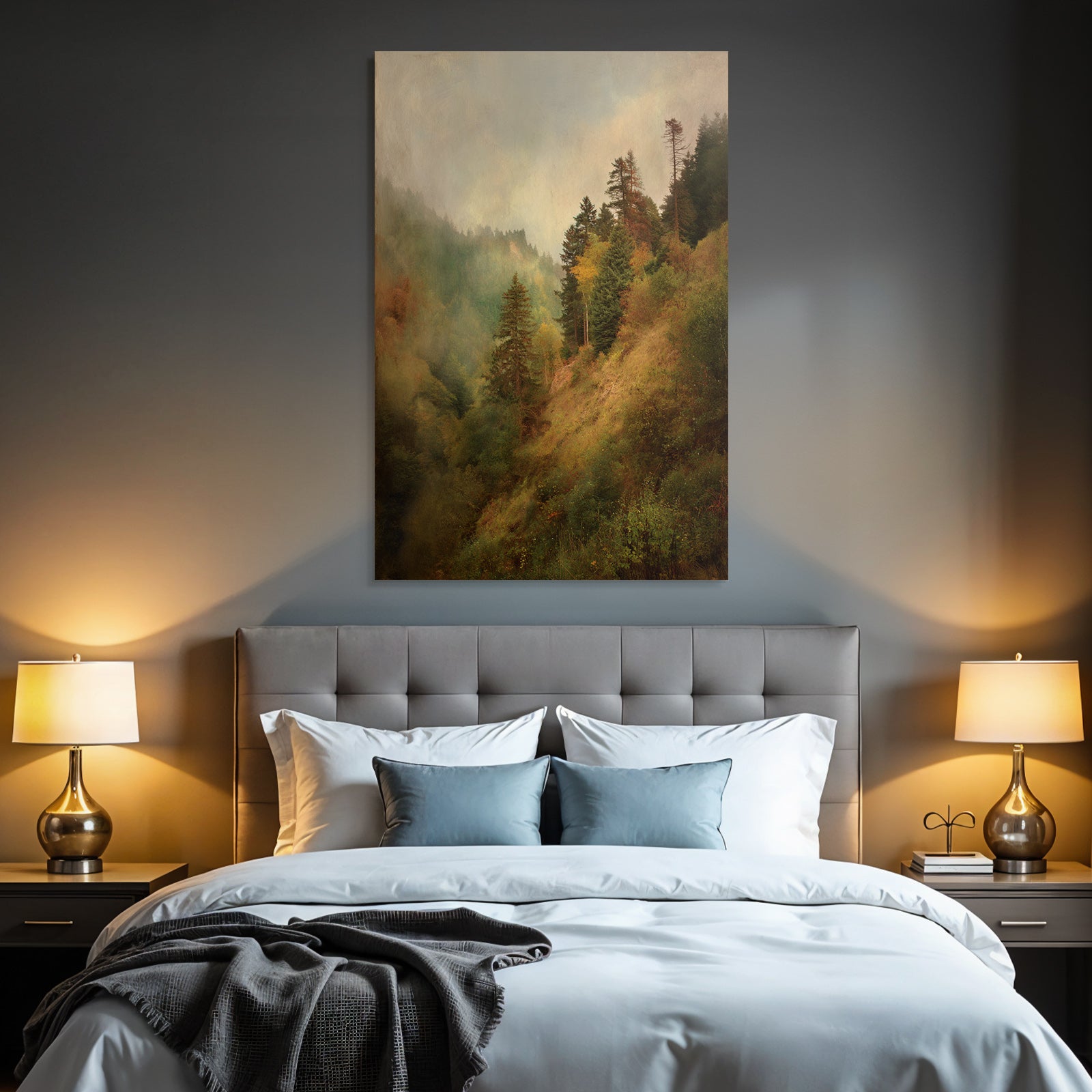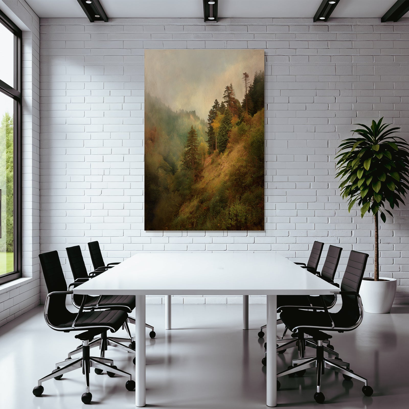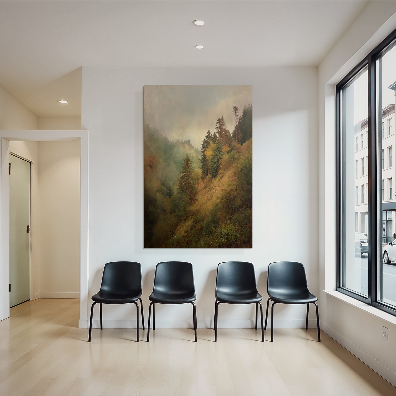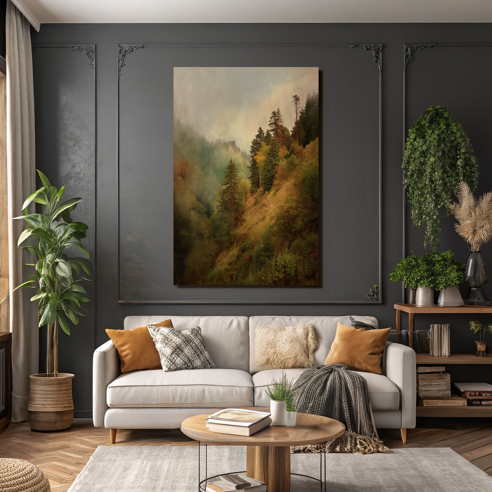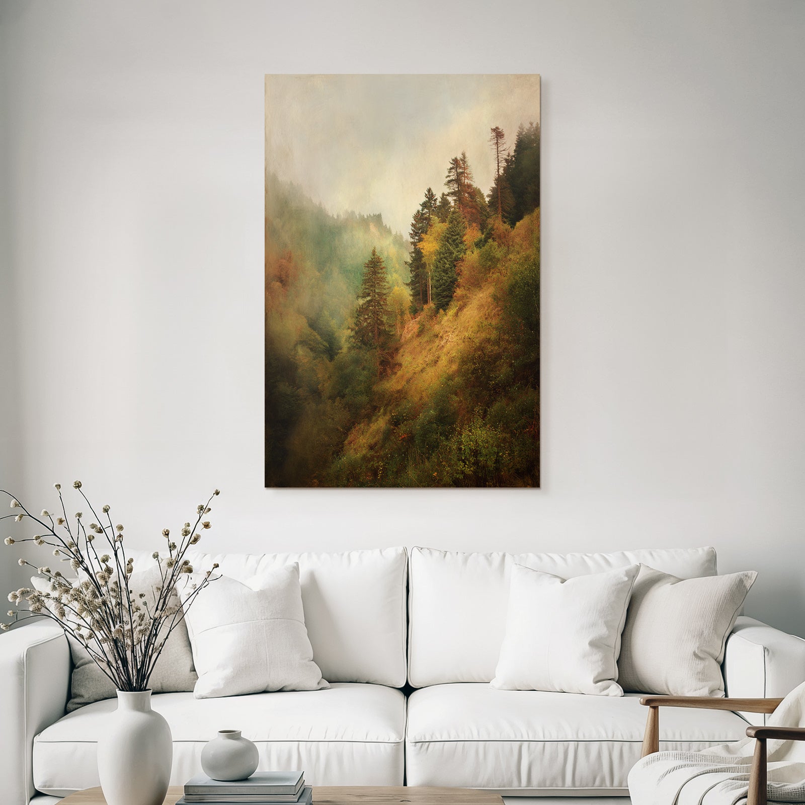 Die Kombination aus dem Motiv „Herbstnebliger Waldhang Im Gebirge“ und dem Stil Nebel und Wetter schafft eine Brücke zwischen Klassik und Moderne. Der FameFrame vollendet dieses Zusammenspiel perfekt.