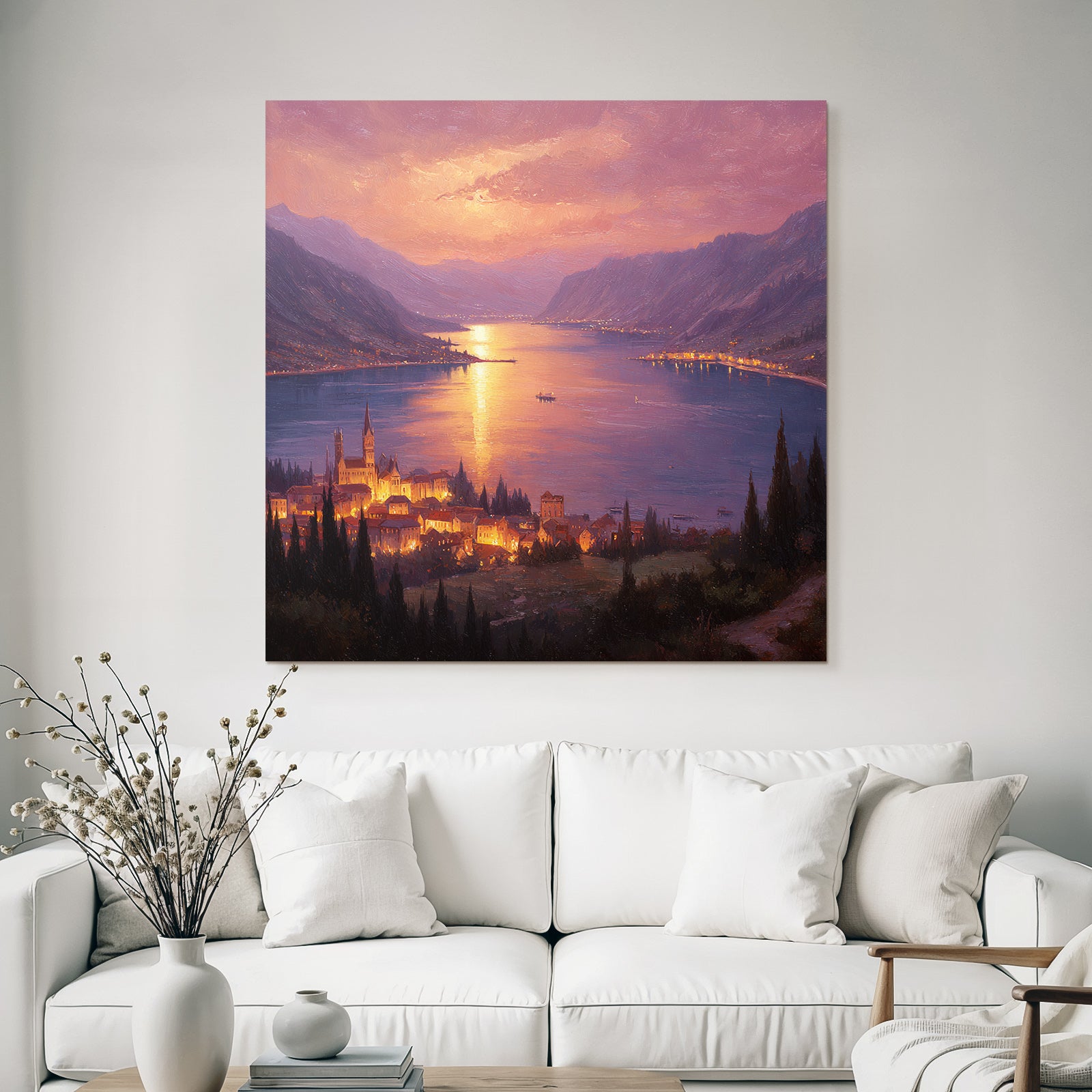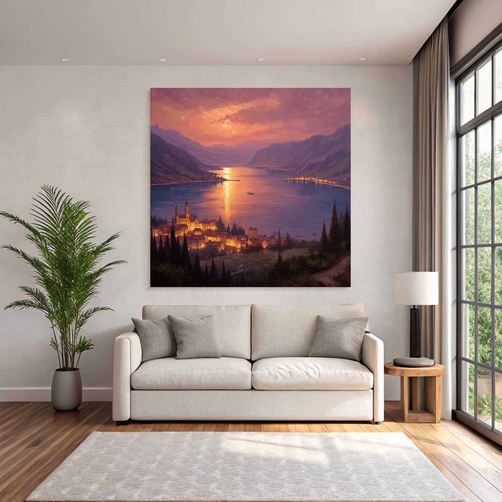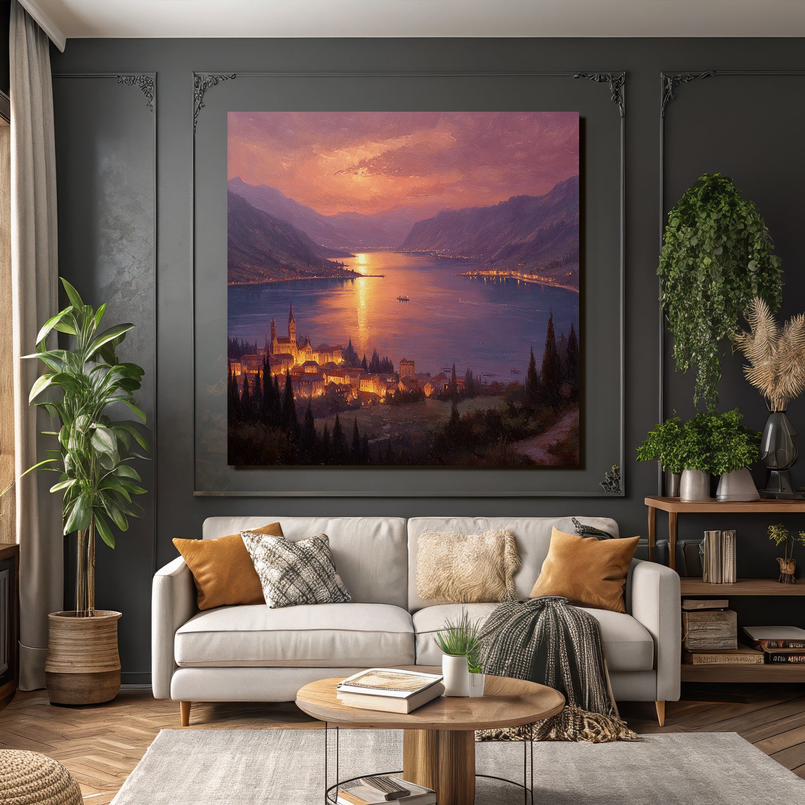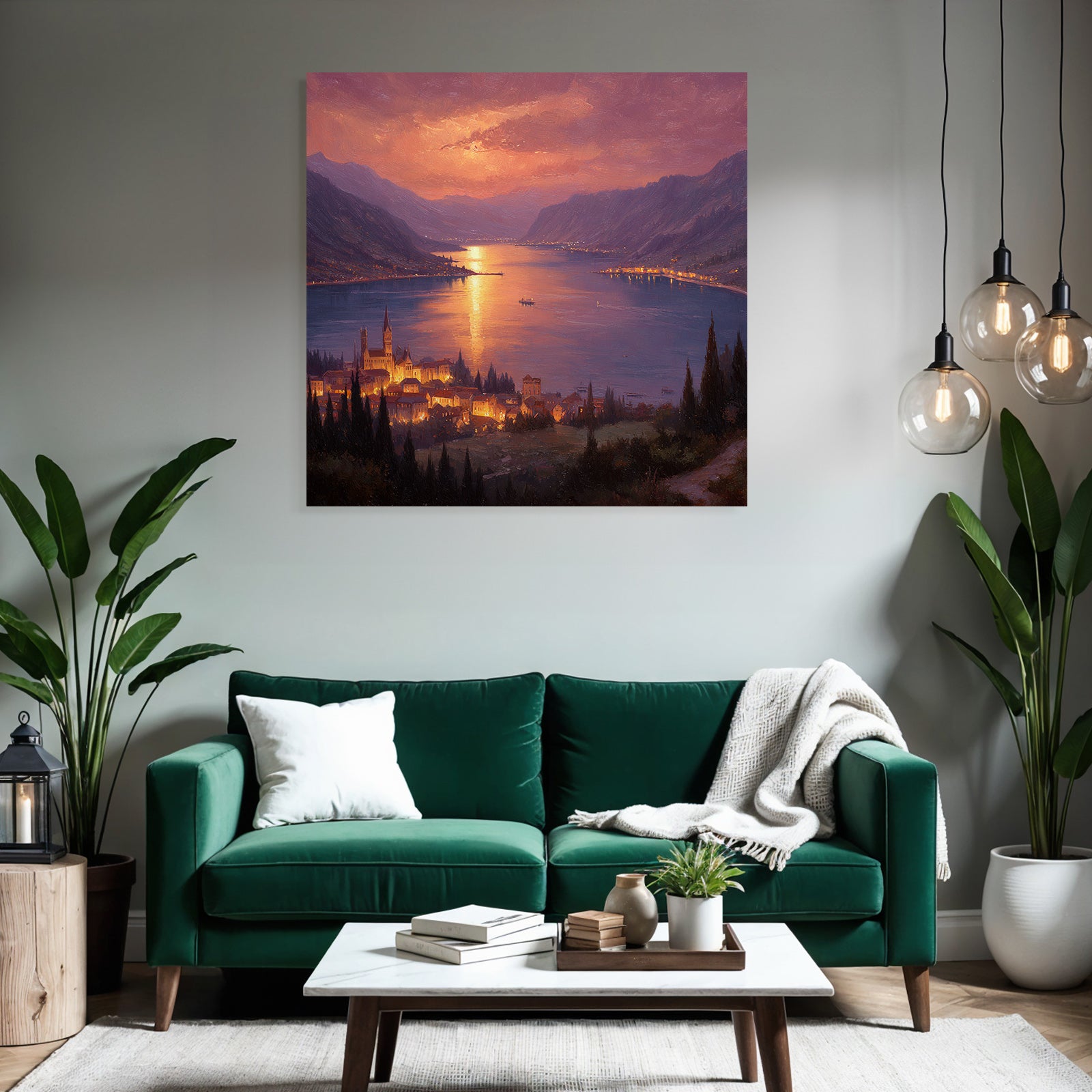 Der Stil Nebel und Wetter, neu interpretiert. Mit „Idyllischer Sonnenuntergang Am Gebirgssee“ holen Sie sich ein Kunstwerk nach Hause, das im eleganten FameFrame seine volle ästhetische Kraft entfaltet.