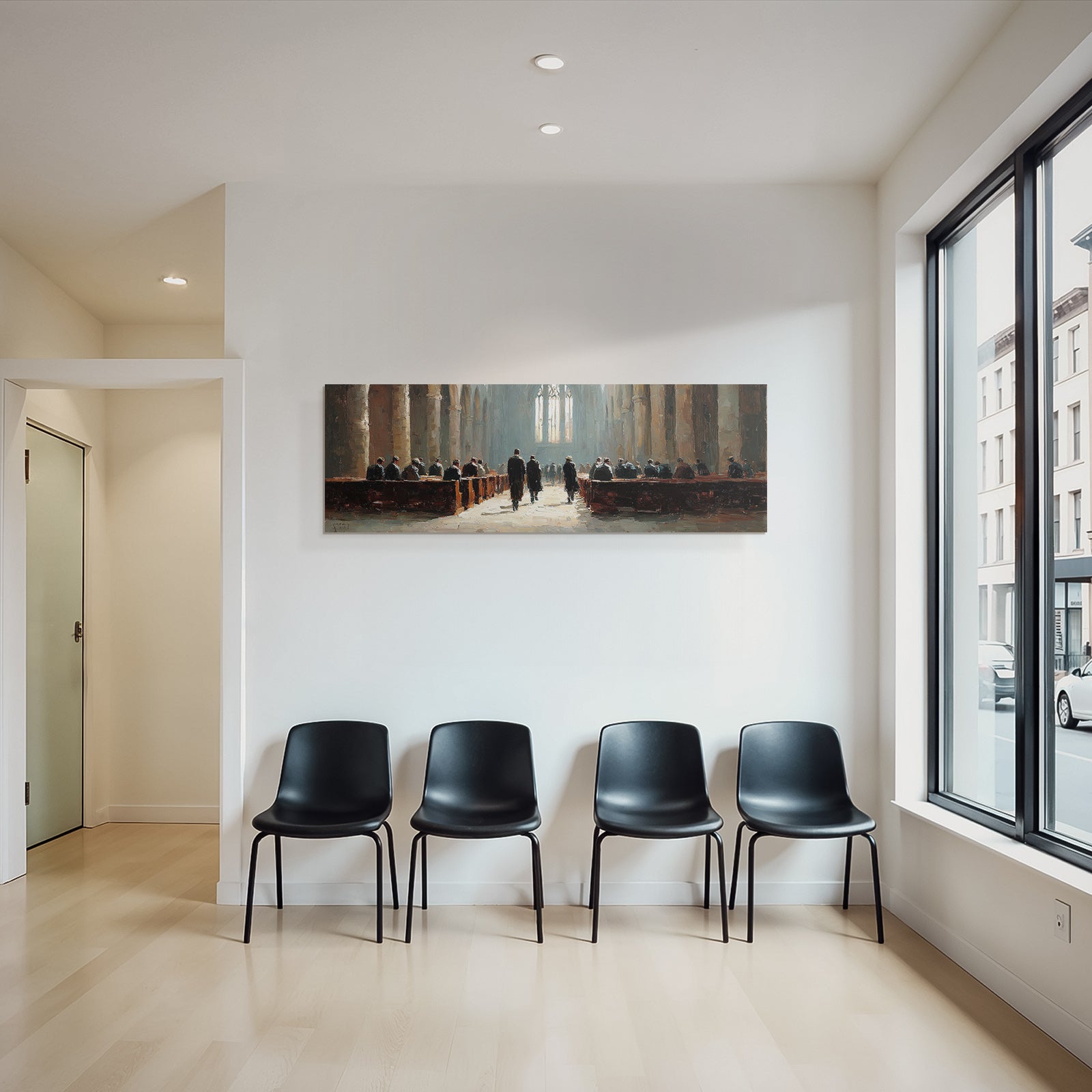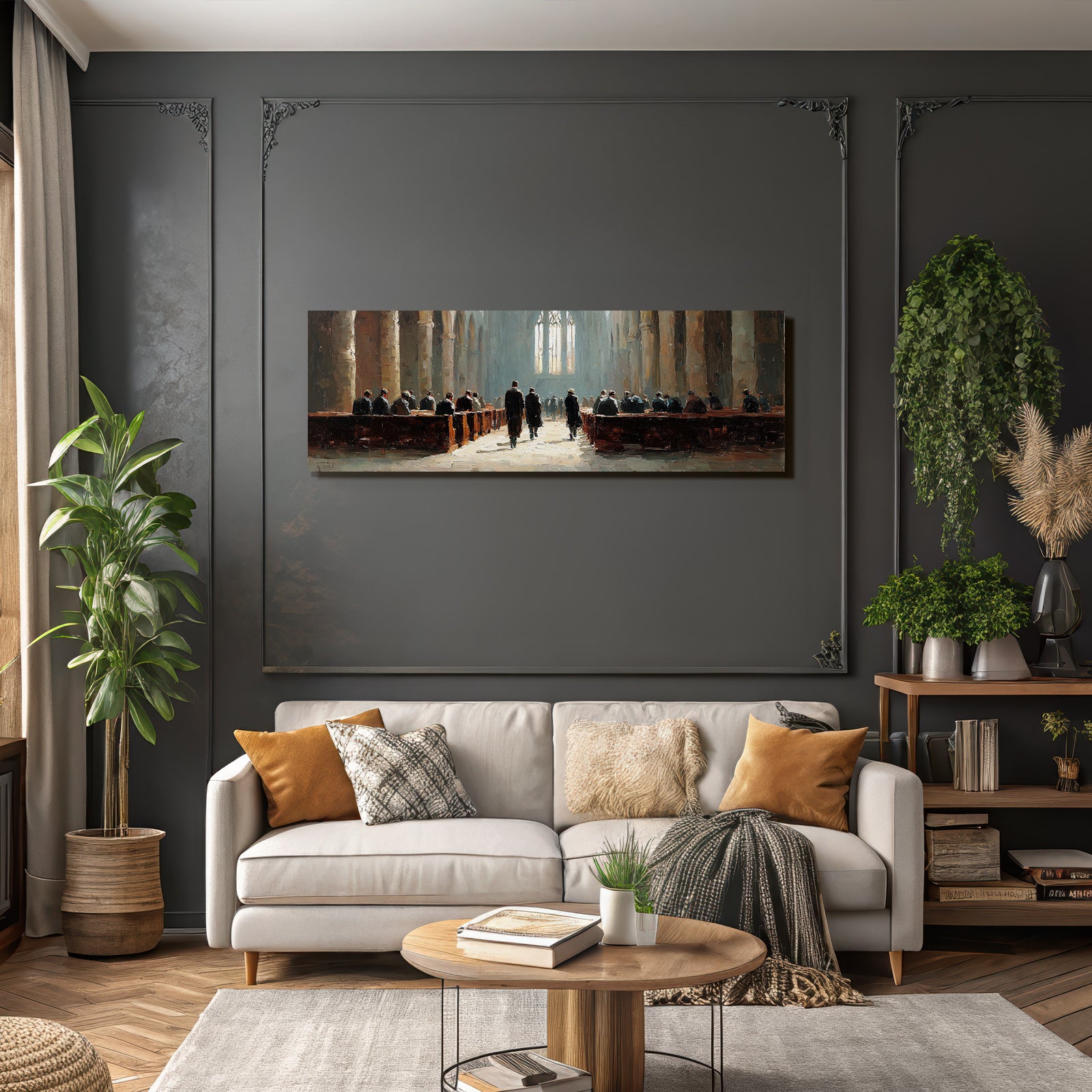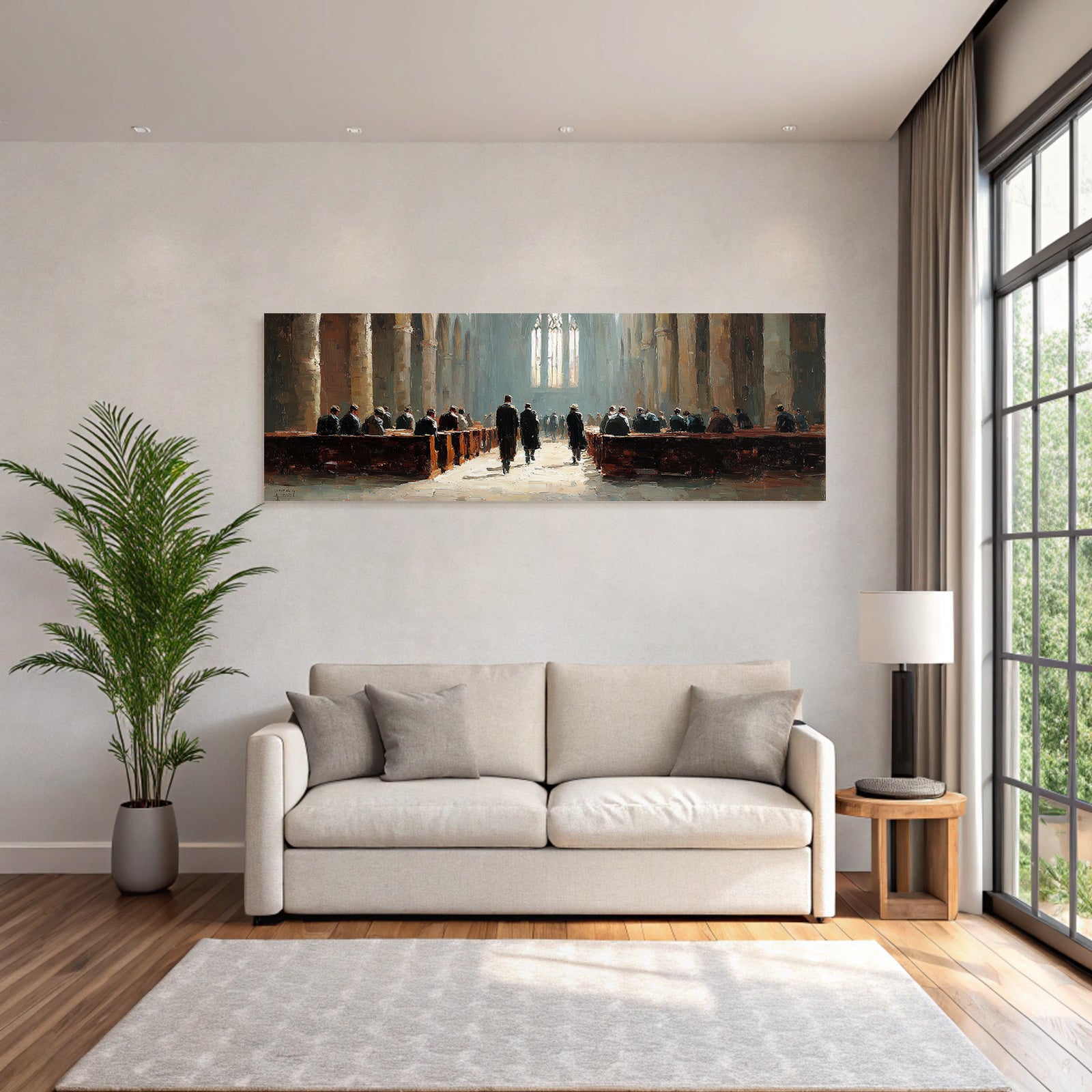 Perfekt für Ihr Wohnzimmer oder einen stilvollen Empfangsbereich: Das Werk „Kirche Innenraum Mit Gläubigen“ im Stil Nebel und Wetter wird im FameFrame zum Mittelpunkt des Raumes.