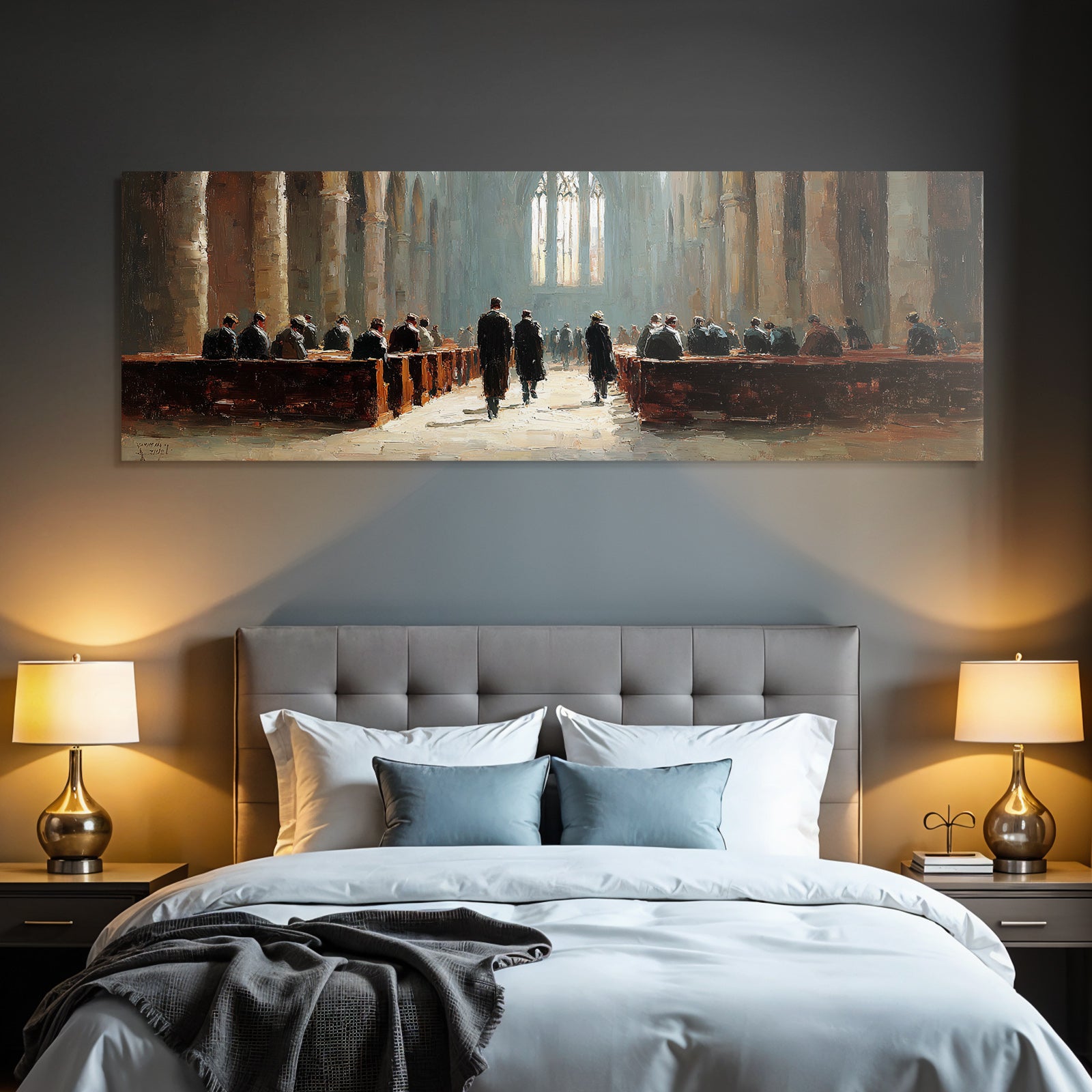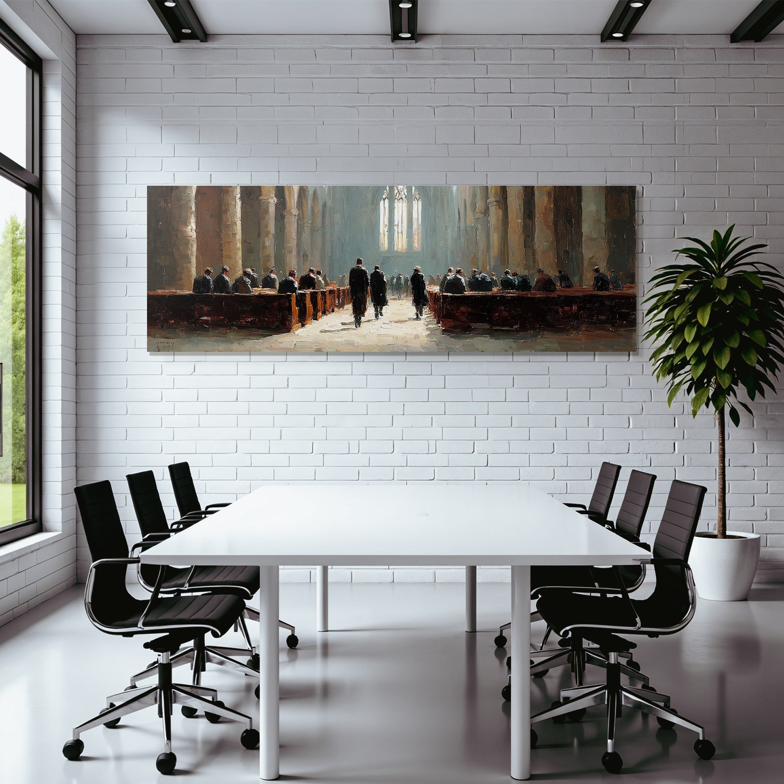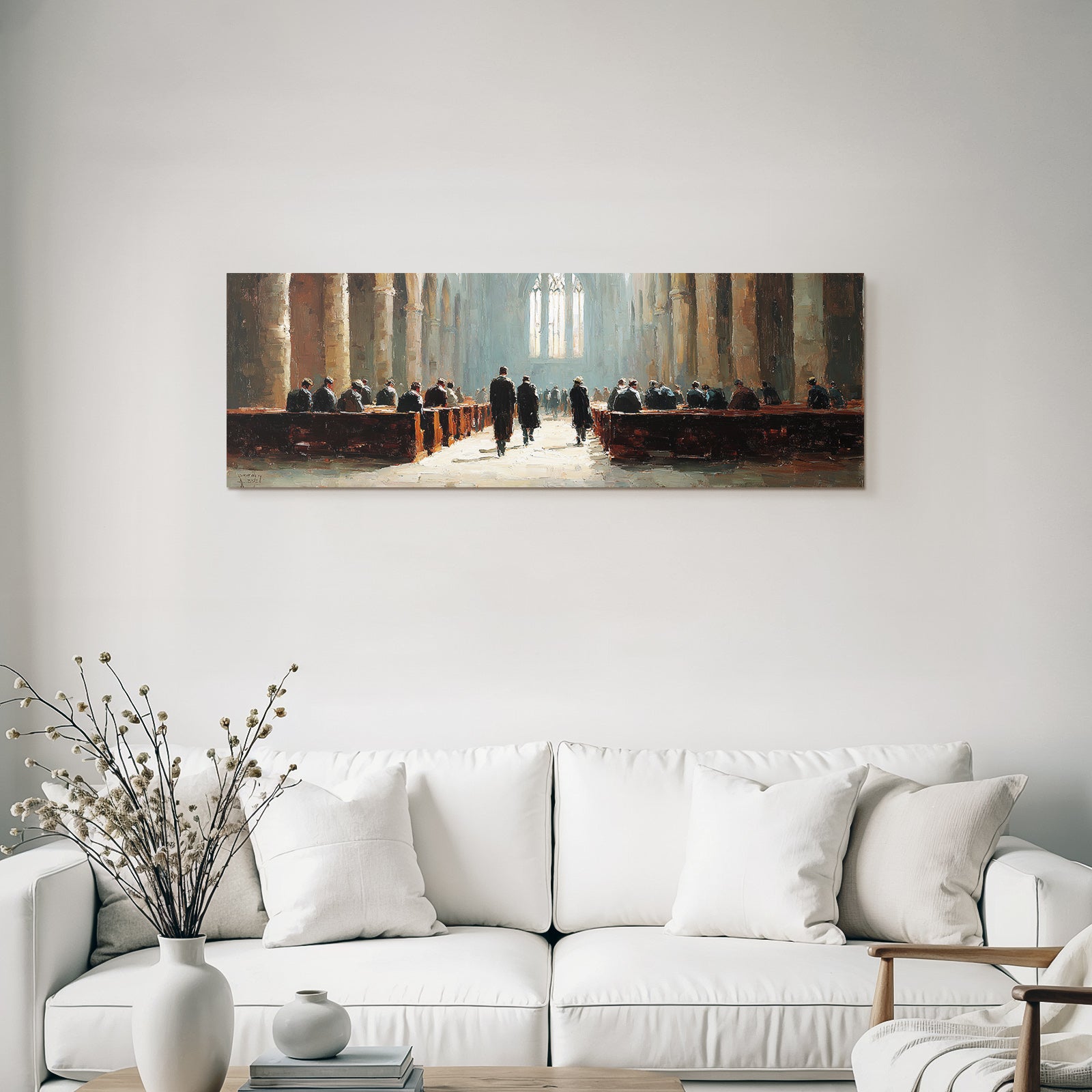 Perfekt für Ihr Wohnzimmer oder einen stilvollen Empfangsbereich: Das Werk „Kirche Innenraum Mit Gläubigen“ im Stil Nebel und Wetter wird im FameFrame zum Mittelpunkt des Raumes.