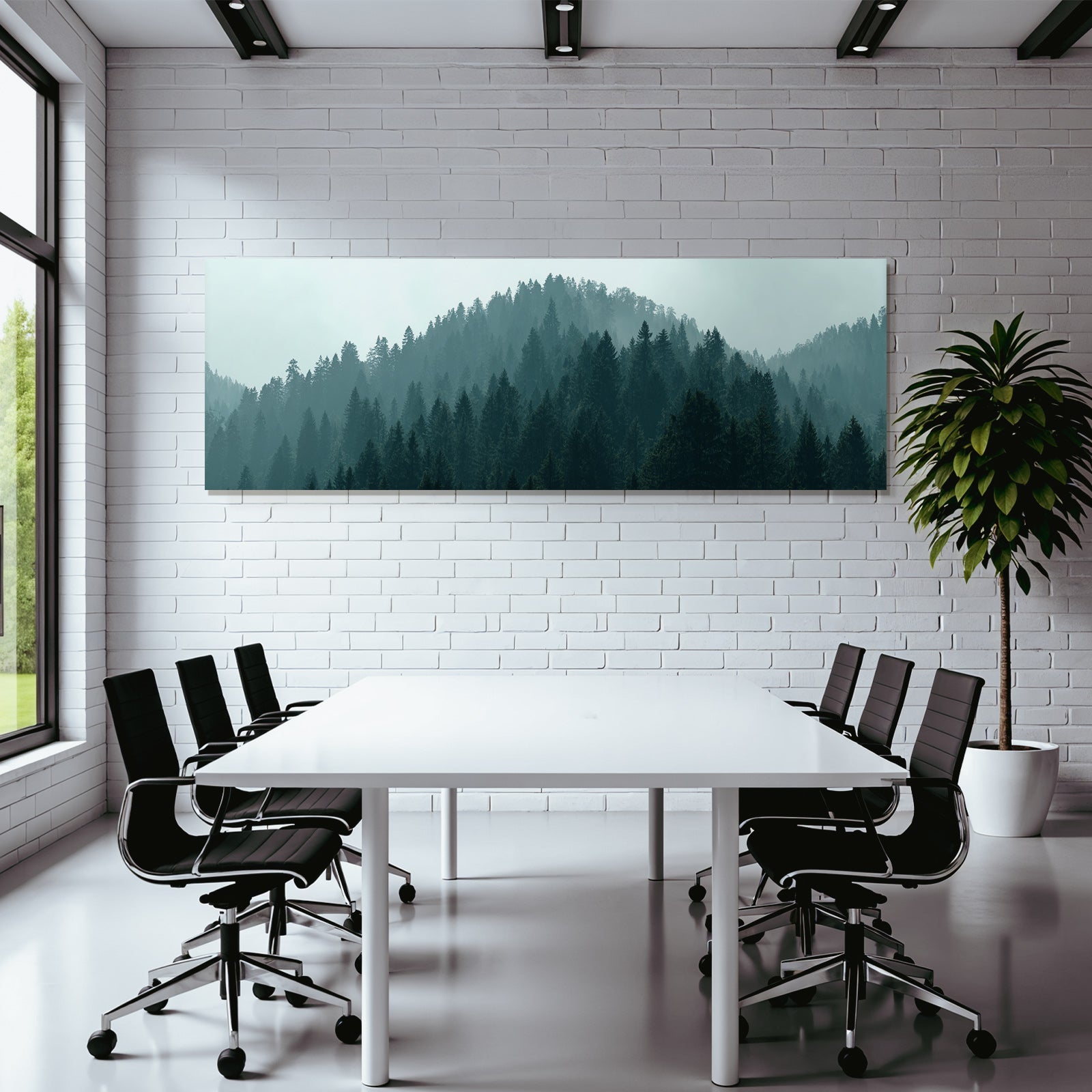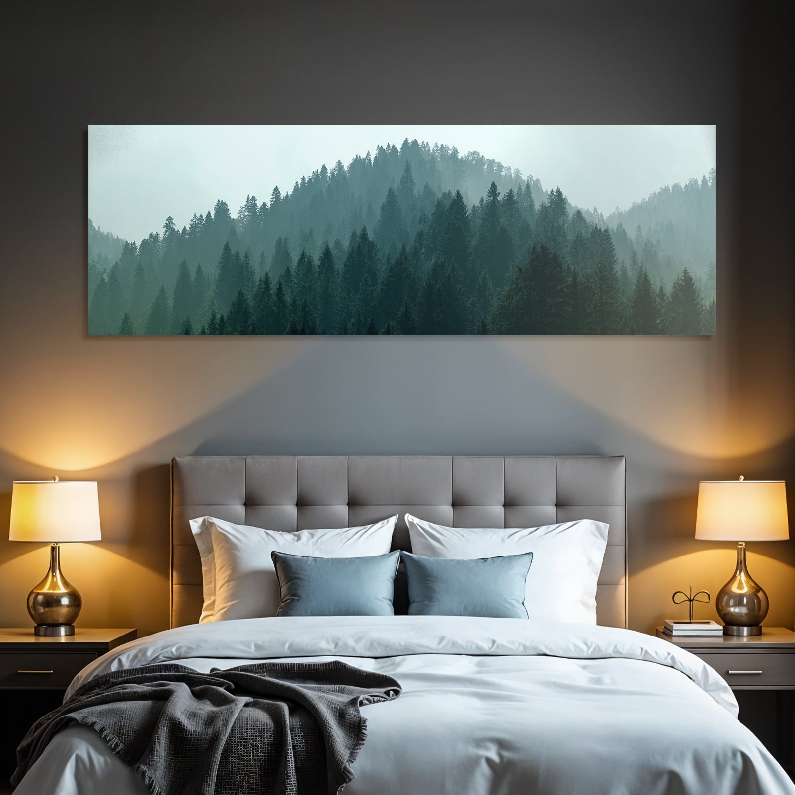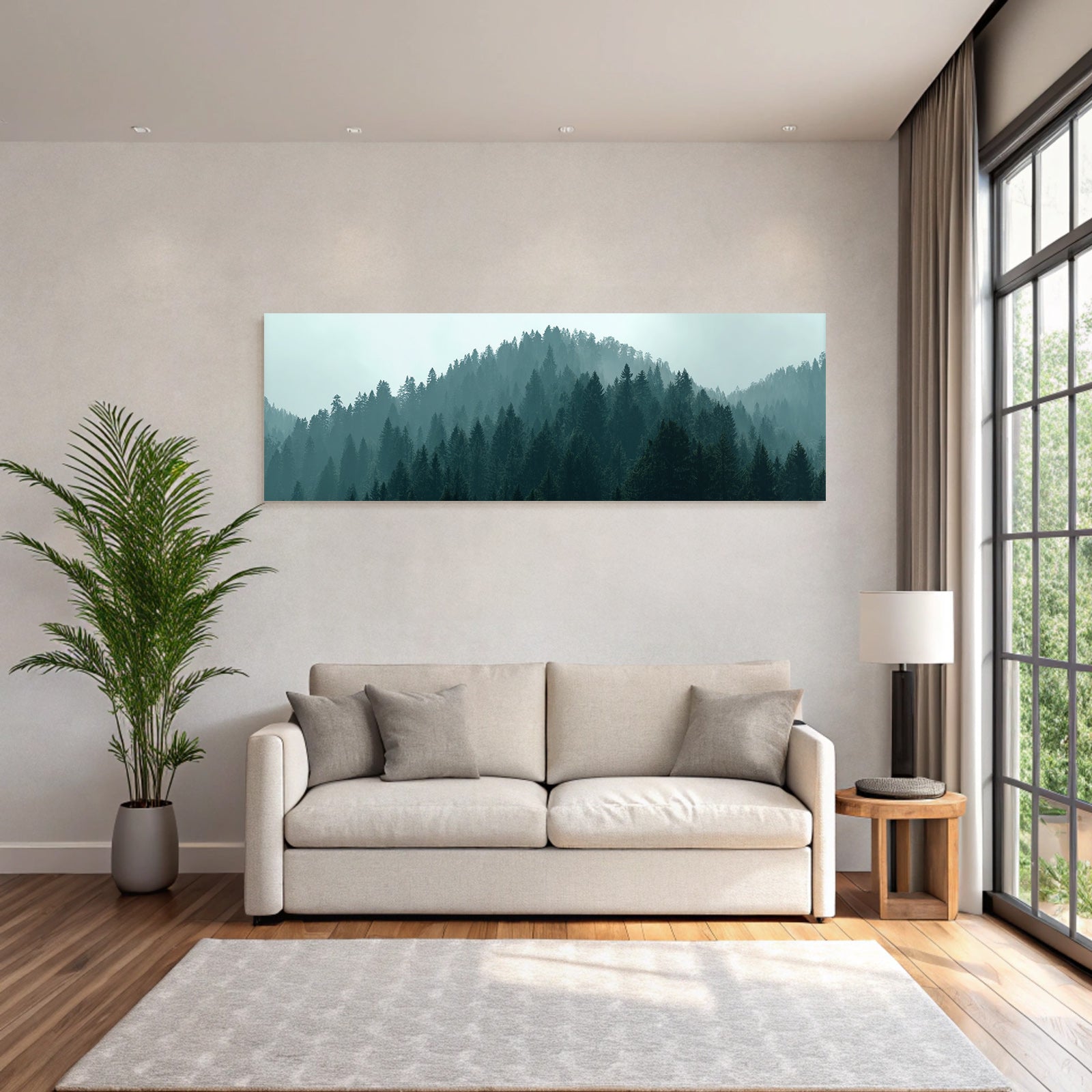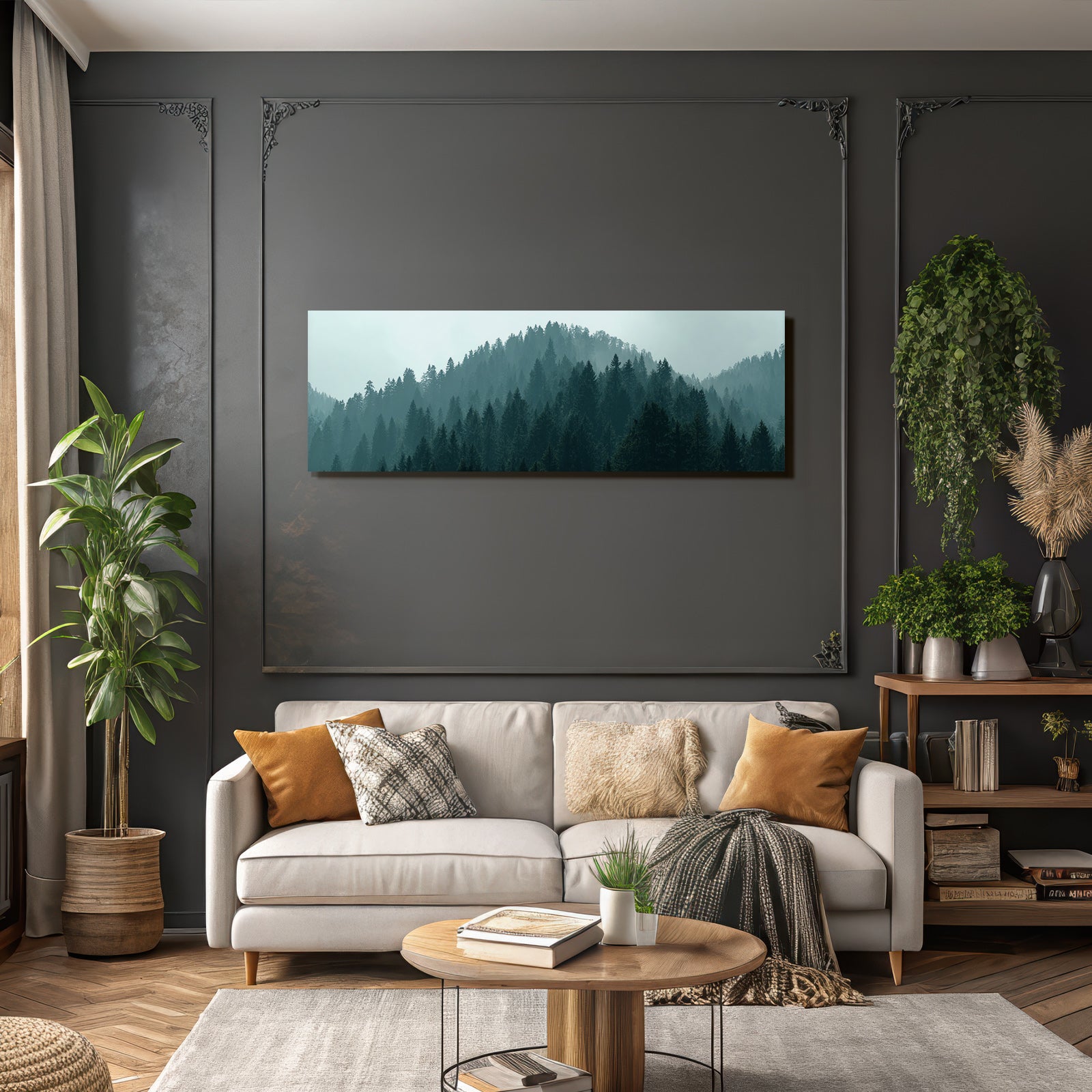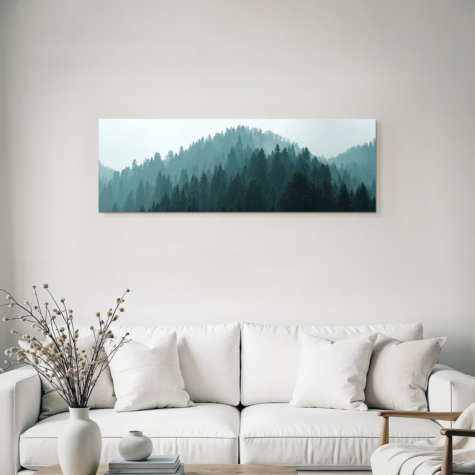 Für Liebhaber des Nebel und Wetter-Looks: Das Kunstwerk „Nebliger Wald Am Hang“ bringt die charakteristischen Merkmale dieses Stils brillant auf Stoff – perfektioniert durch den FameFrame.