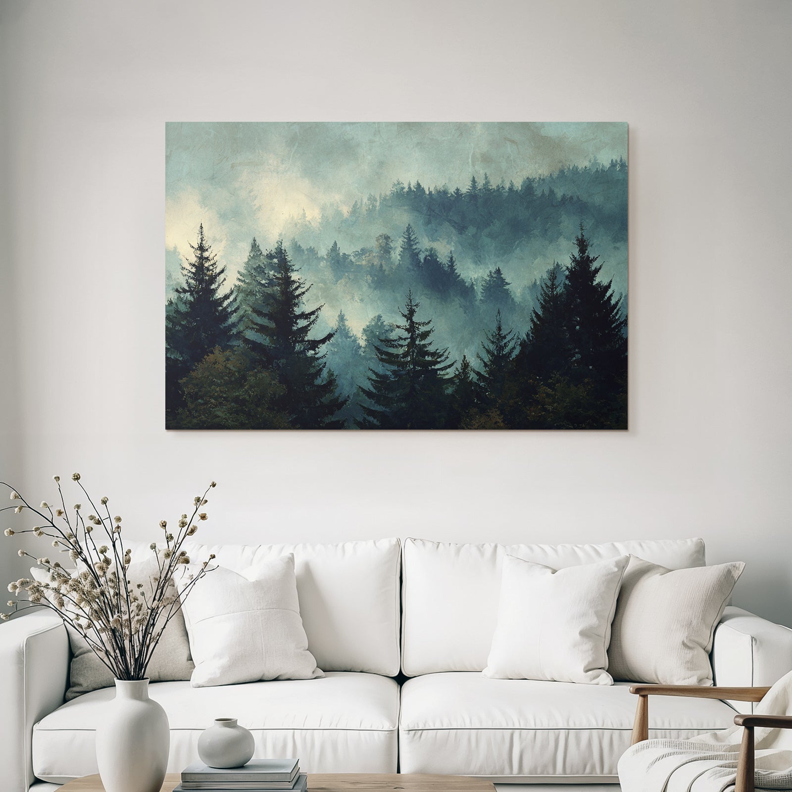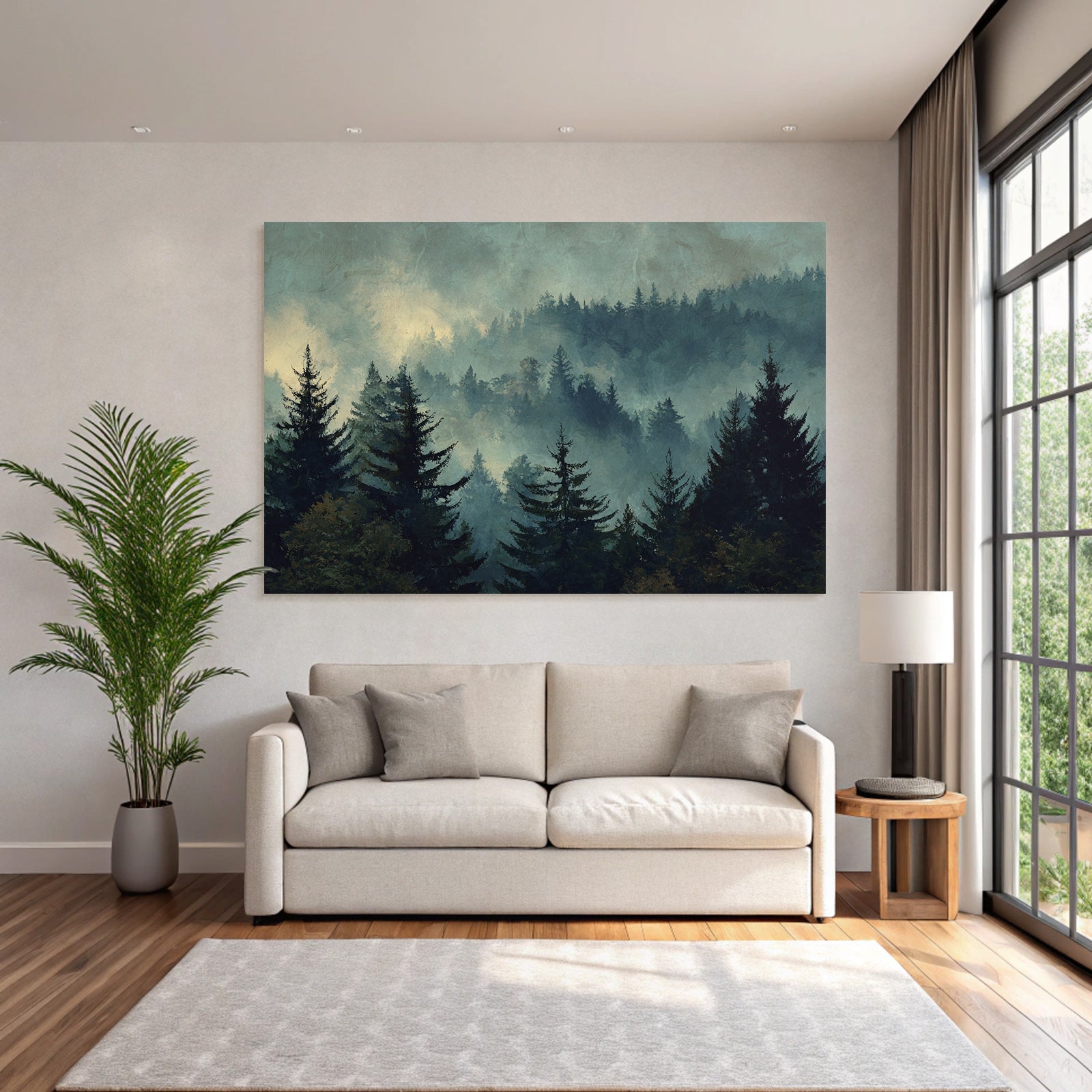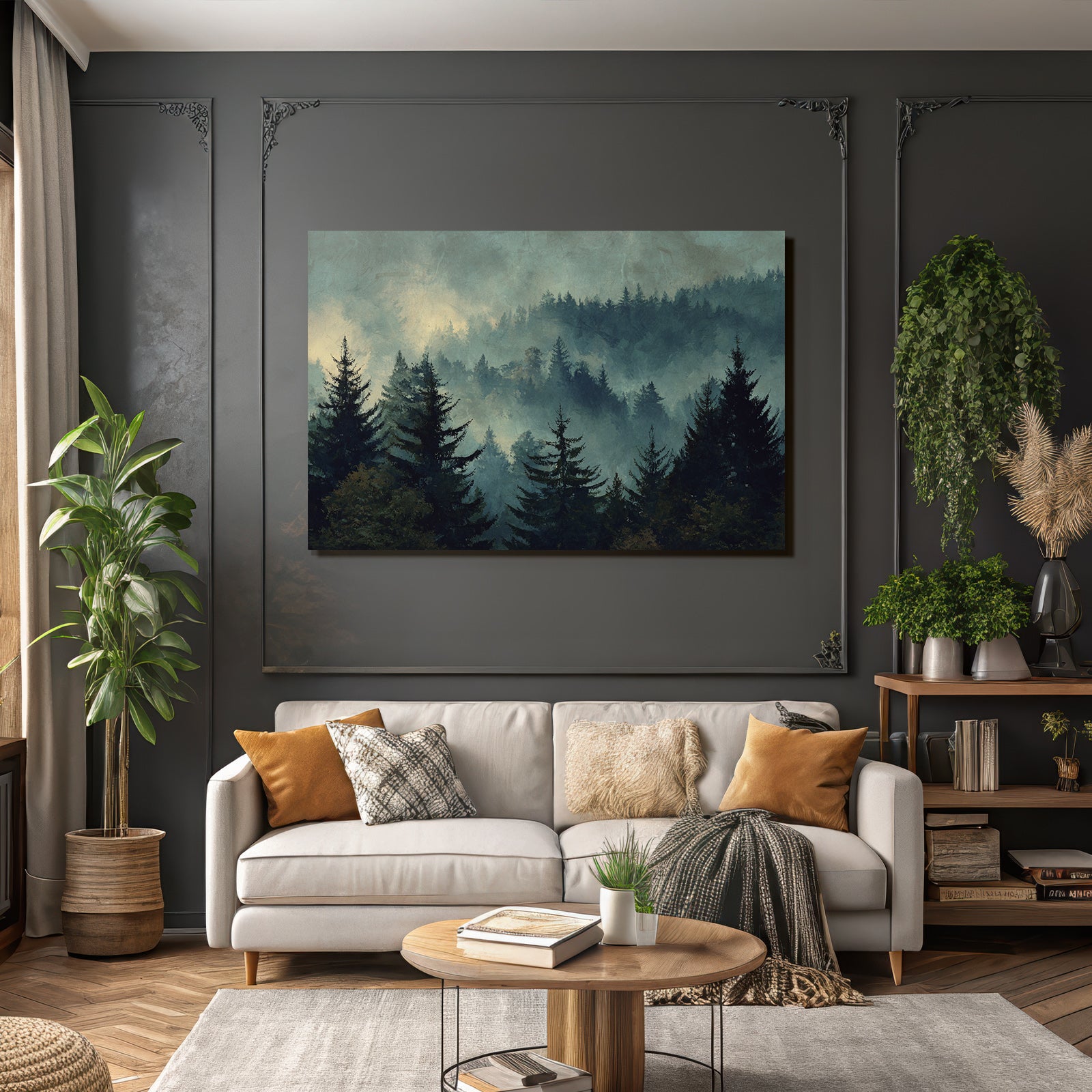 Verleihe Lobby, Wartezimmer oder Studio eine besondere Atmosphäre mit „Nebliger Wald Im Dämmerungslicht“ im Stil Nebel und Wetter – eindrucksvoll im FameFrame präsentiert.