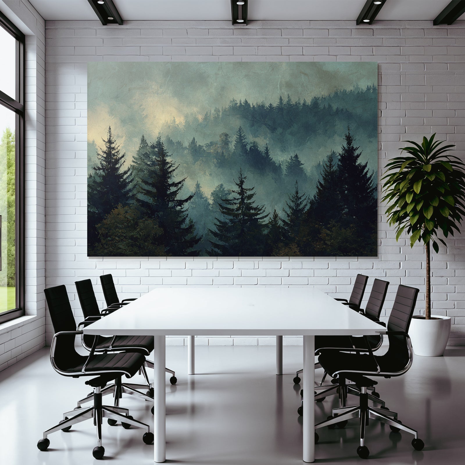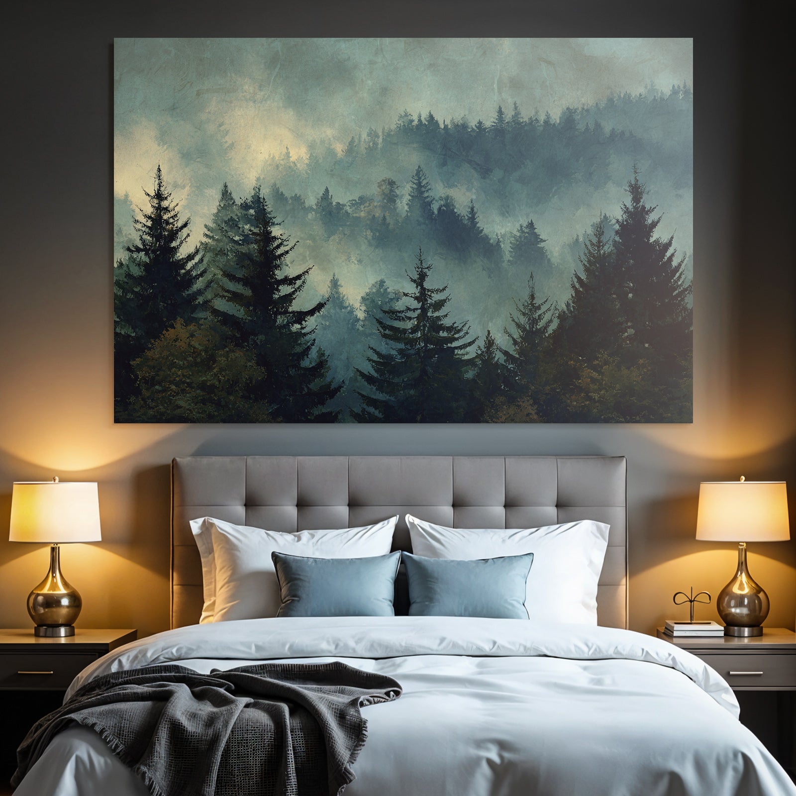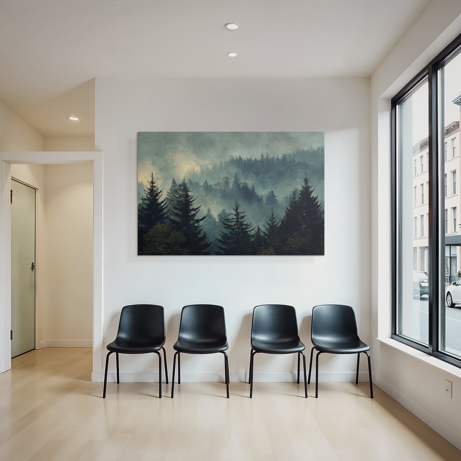 Verleihe Lobby, Wartezimmer oder Studio eine besondere Atmosphäre mit „Nebliger Wald Im Dämmerungslicht“ im Stil Nebel und Wetter – eindrucksvoll im FameFrame präsentiert.