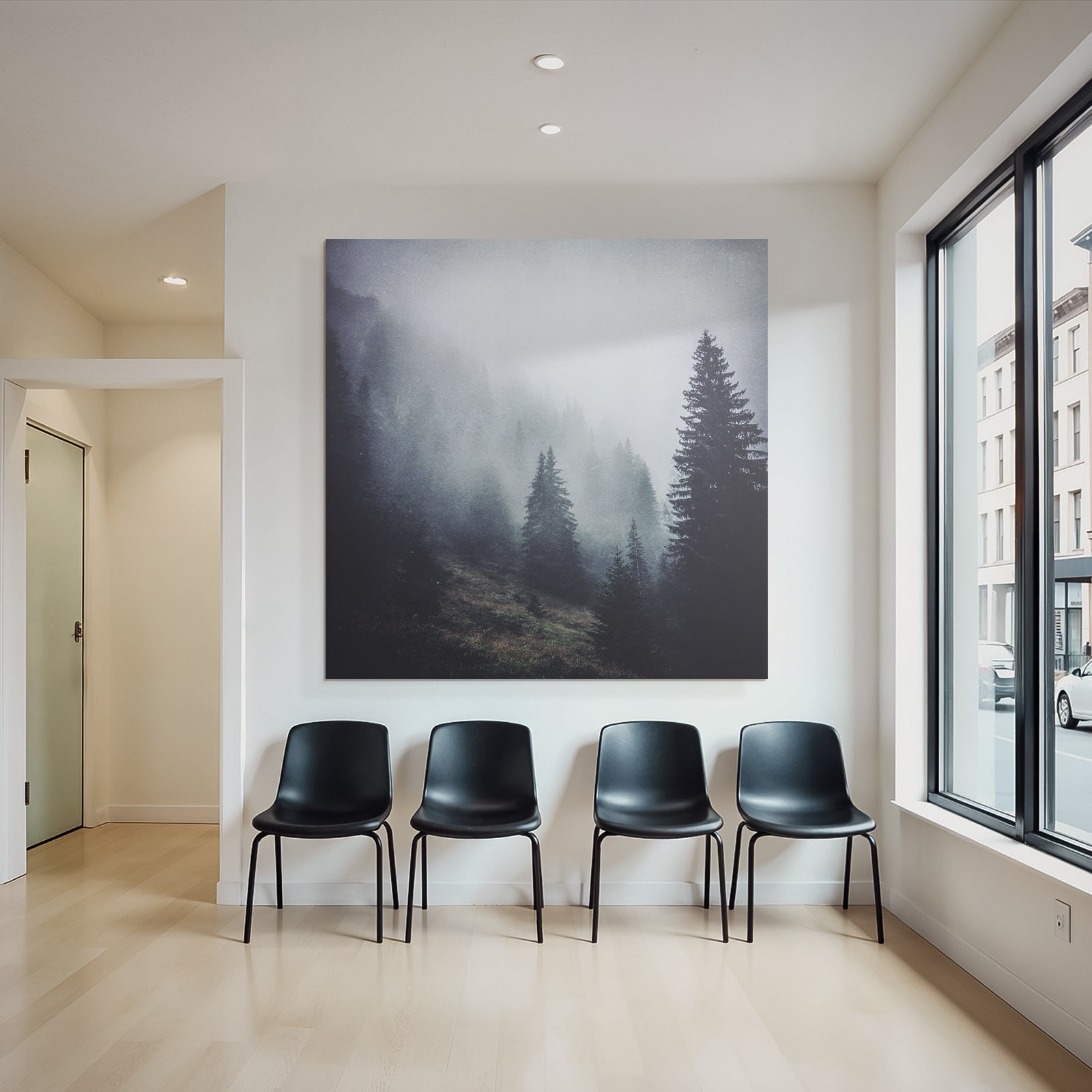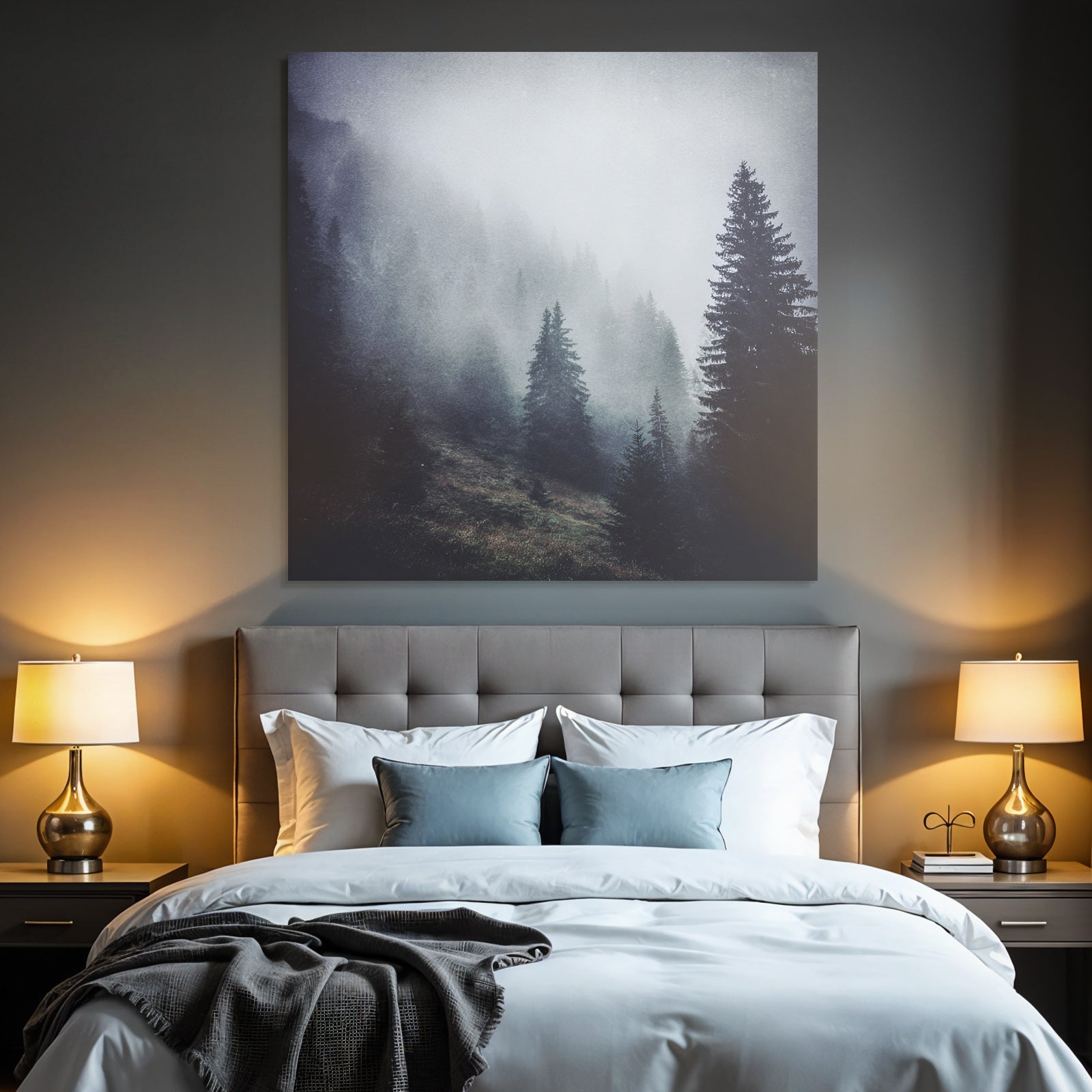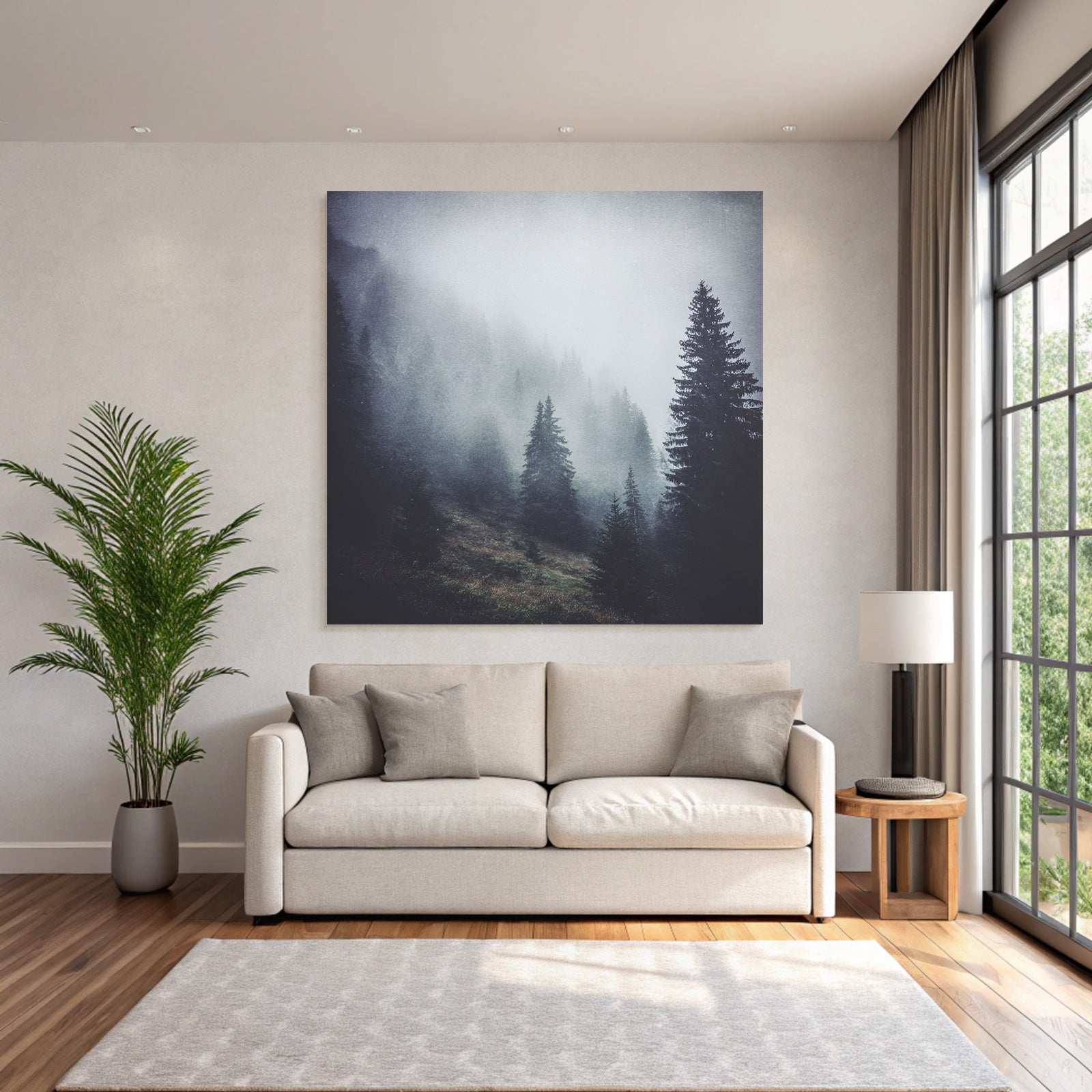Verleihe Lobby, Wartezimmer oder Studio eine besondere Atmosphäre mit „Nebliger Wald Mit Immergrünen Bäumen“ im Stil Nebel und Wetter – eindrucksvoll im FameFrame präsentiert.