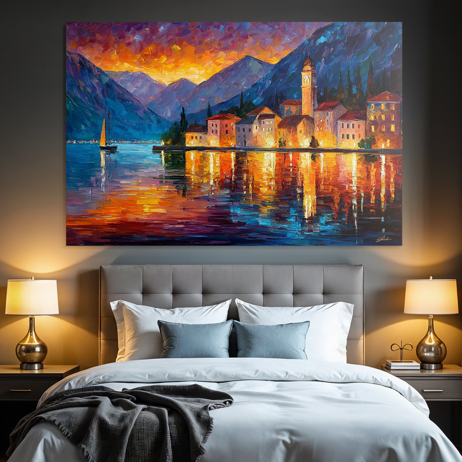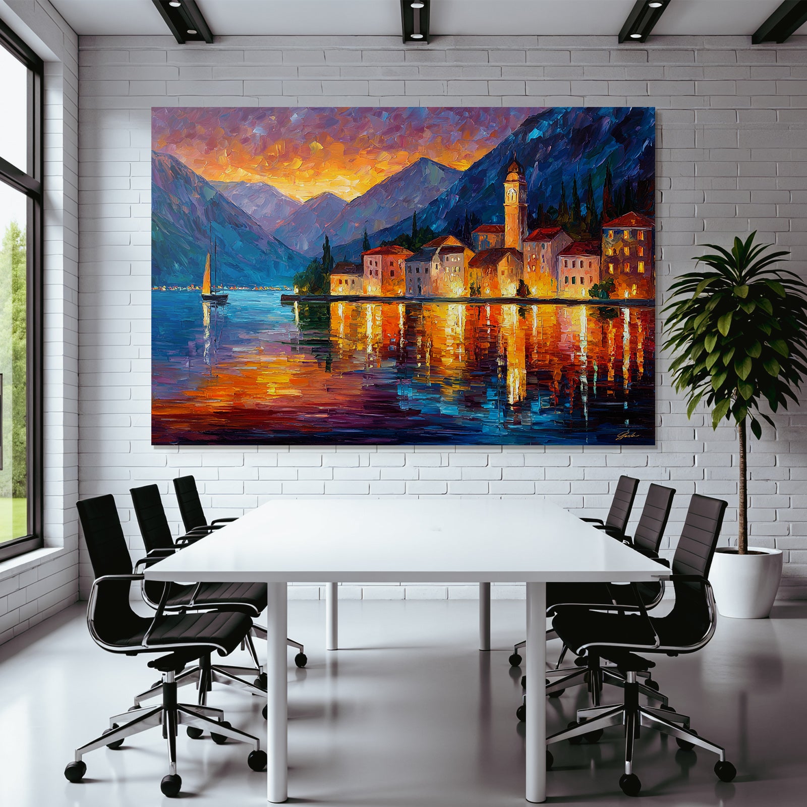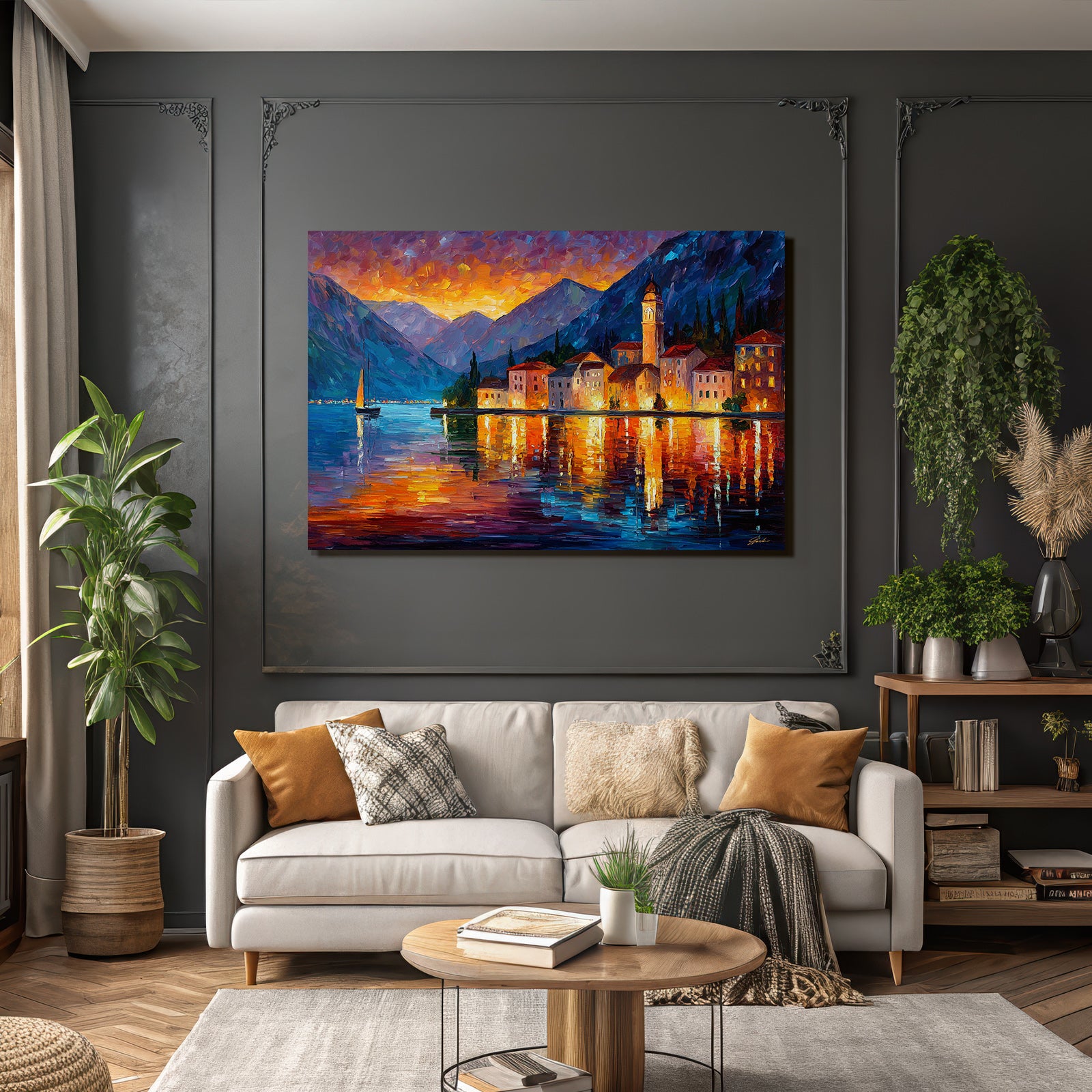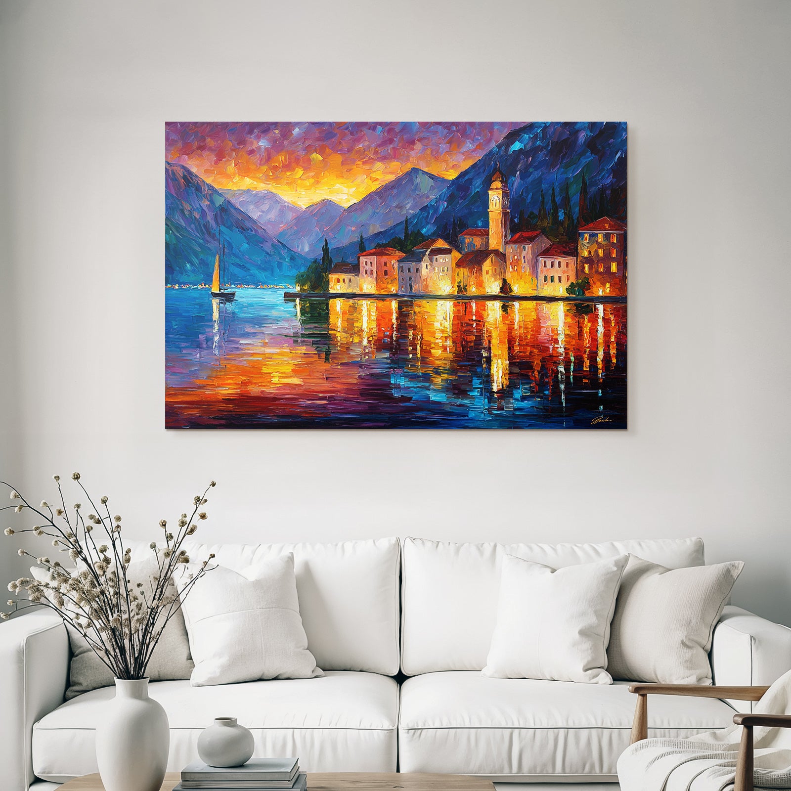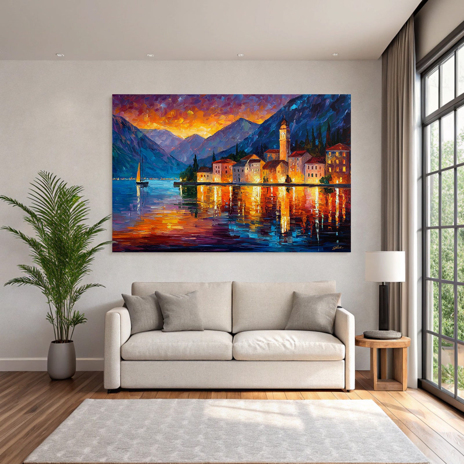 Bringen Sie frischen Wind in Ihr Studio oder Ihren Kreativraum. „Seeuferdorf Beim Sonnenuntergang“ als Textildruck im Stil Nebel und Wetter inspiriert im FameFrame zu neuen Ideen.