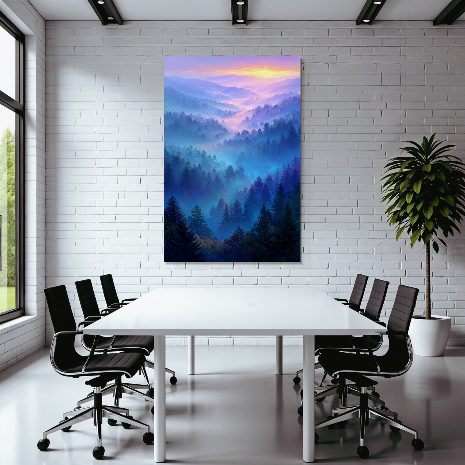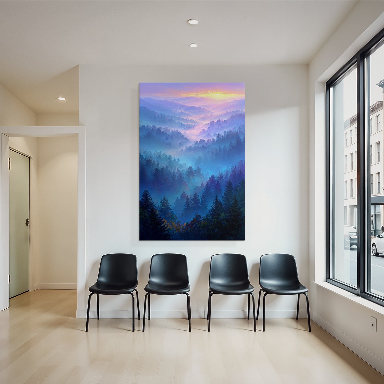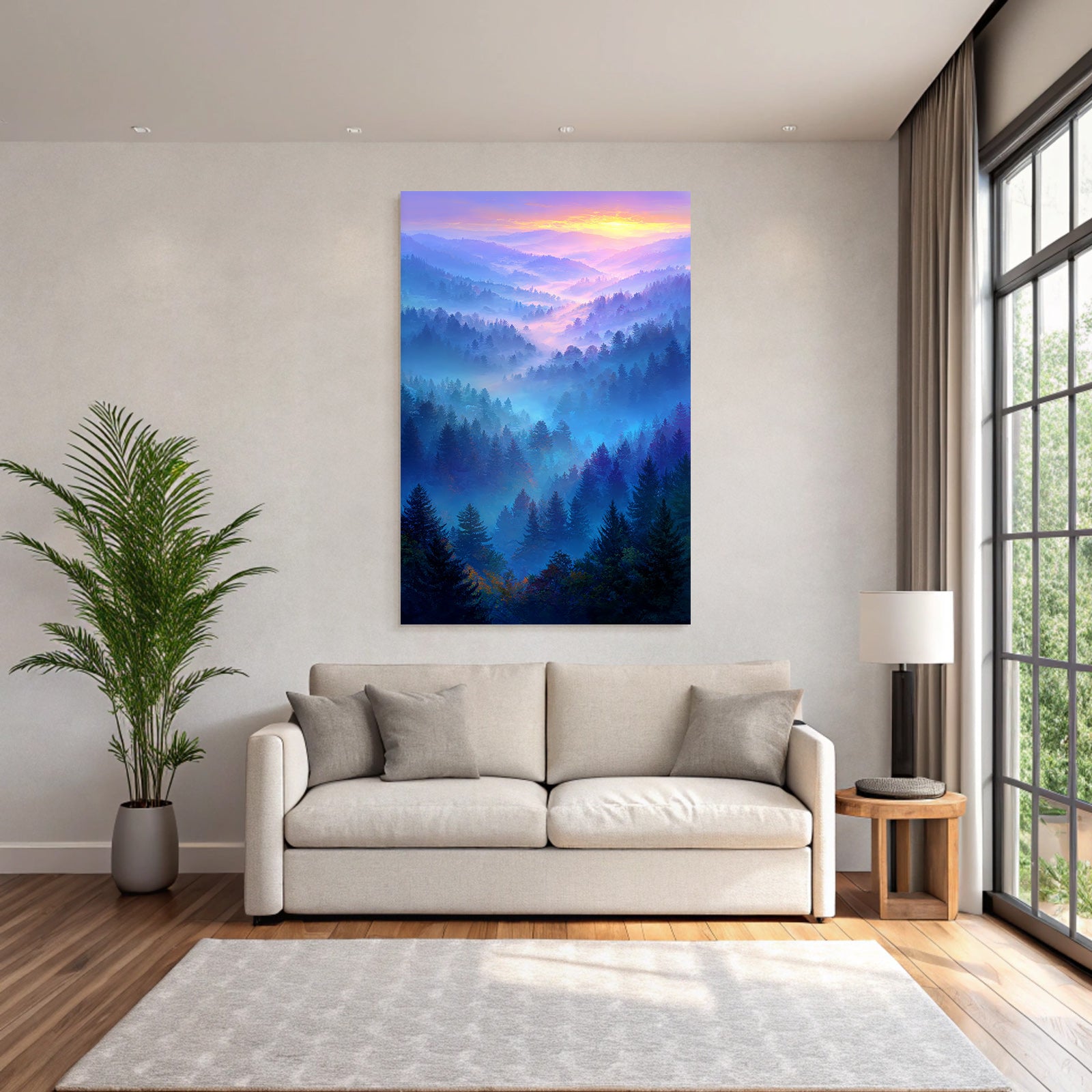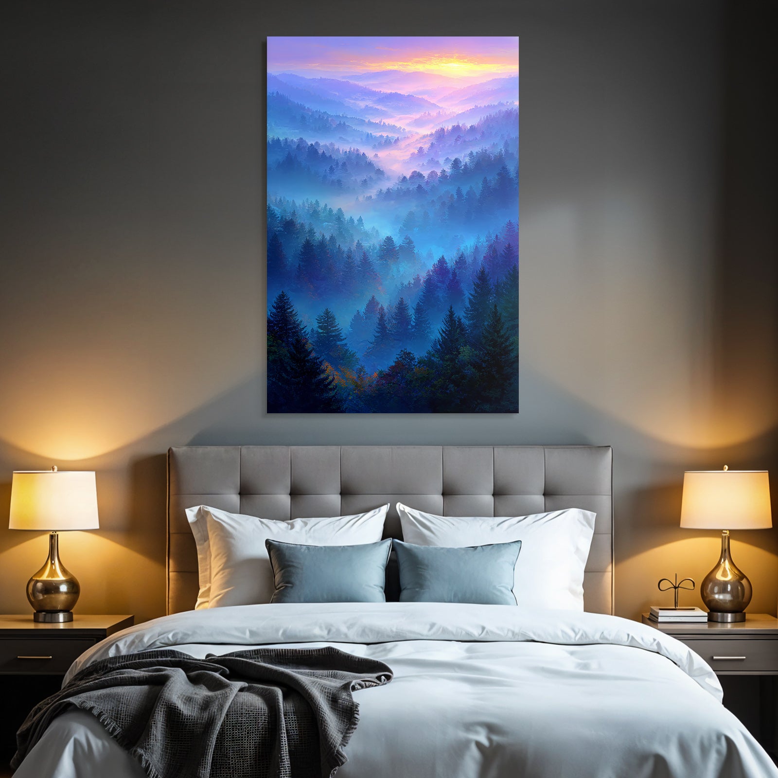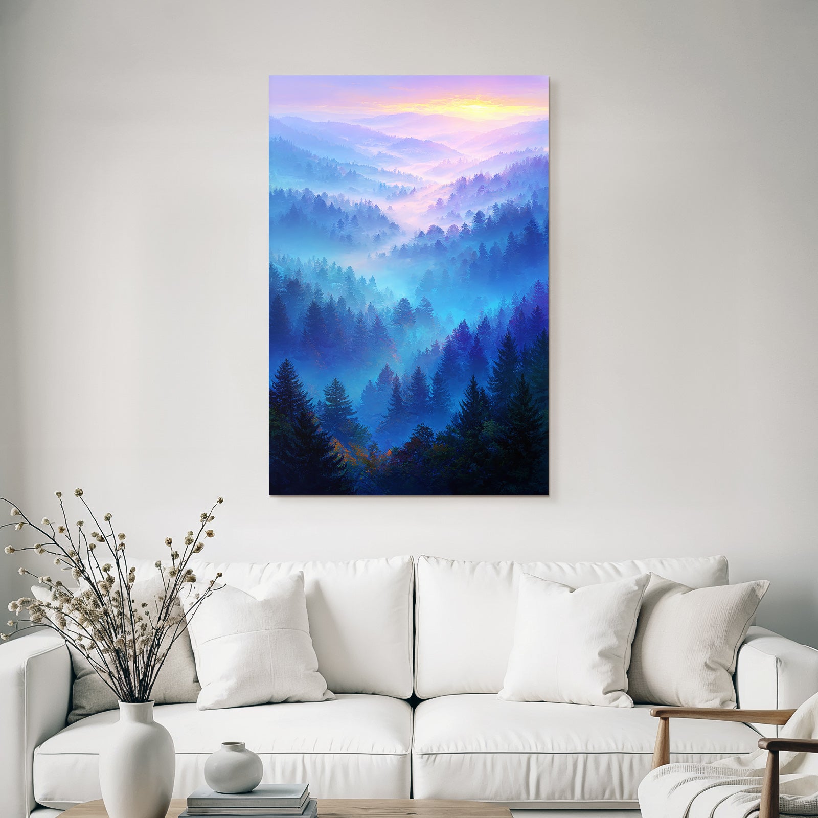 Das Kunstwerk „Nebelverhangene Bergwaldlandschaft Im Sonnenaufgang“ ist eine Hommage an den Stil Nebel und Wetter. Im FameFrame kommt die Farbbrillanz und Detailtiefe des Motivs perfekt zur Geltung.