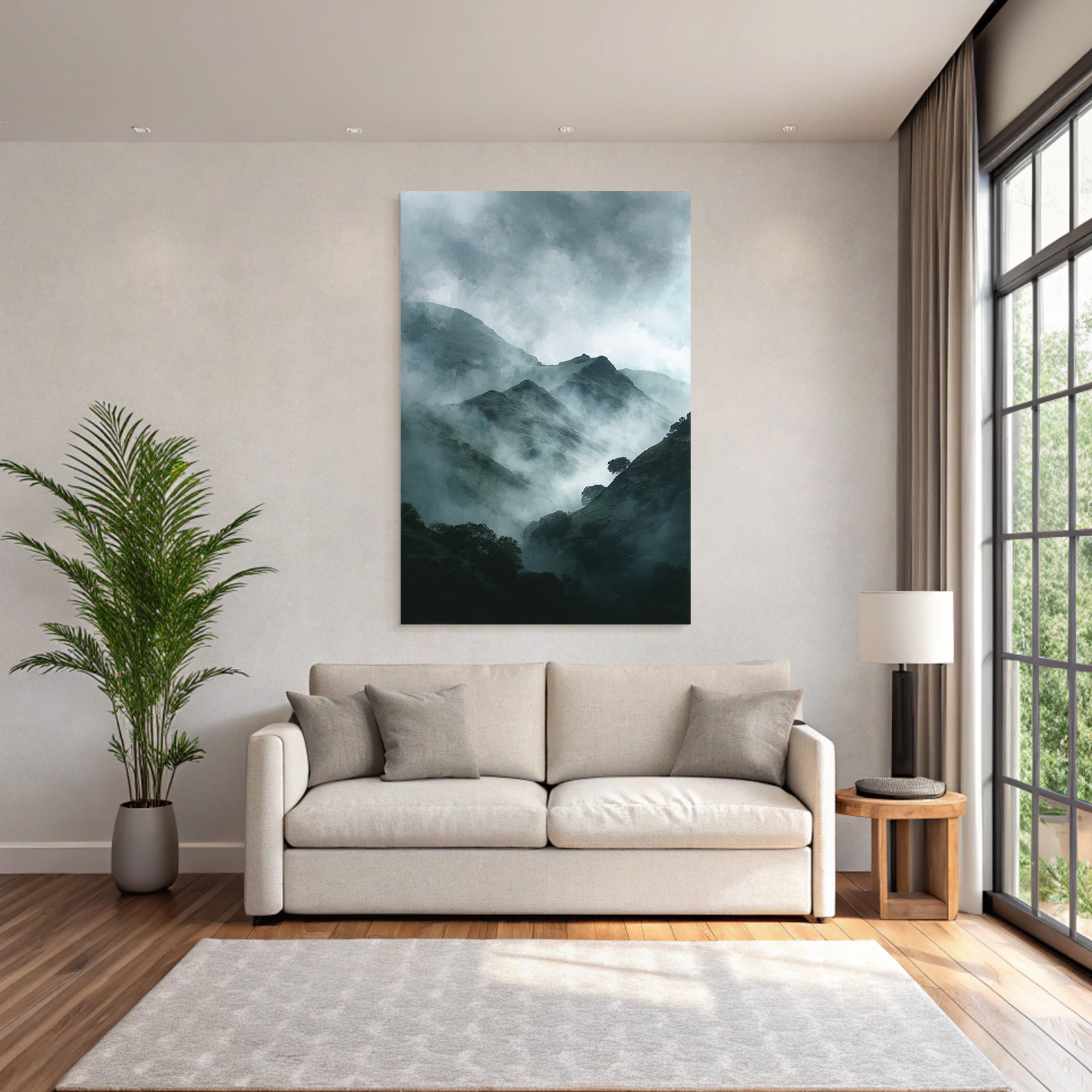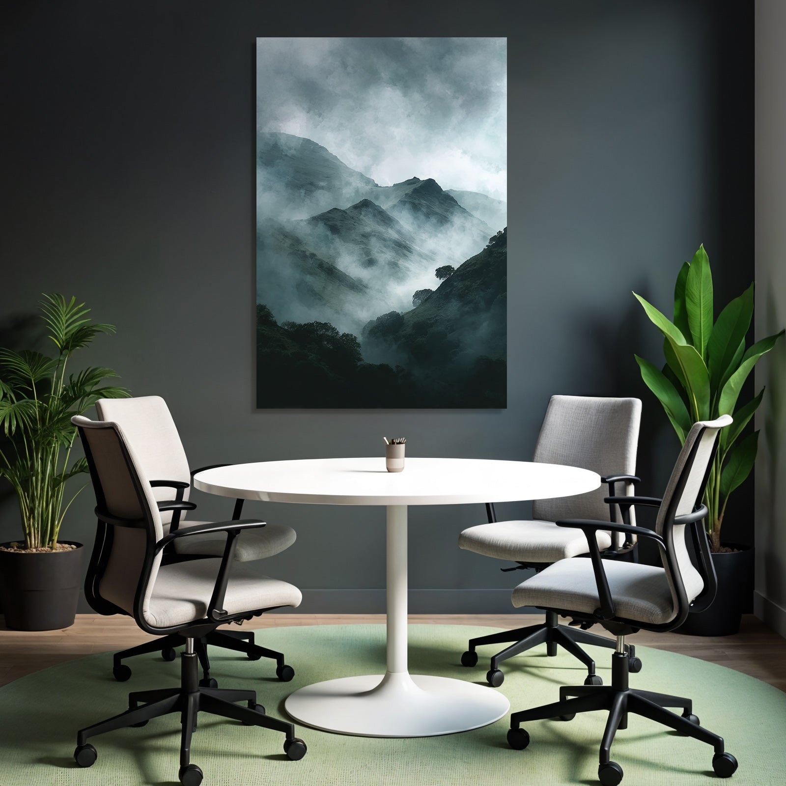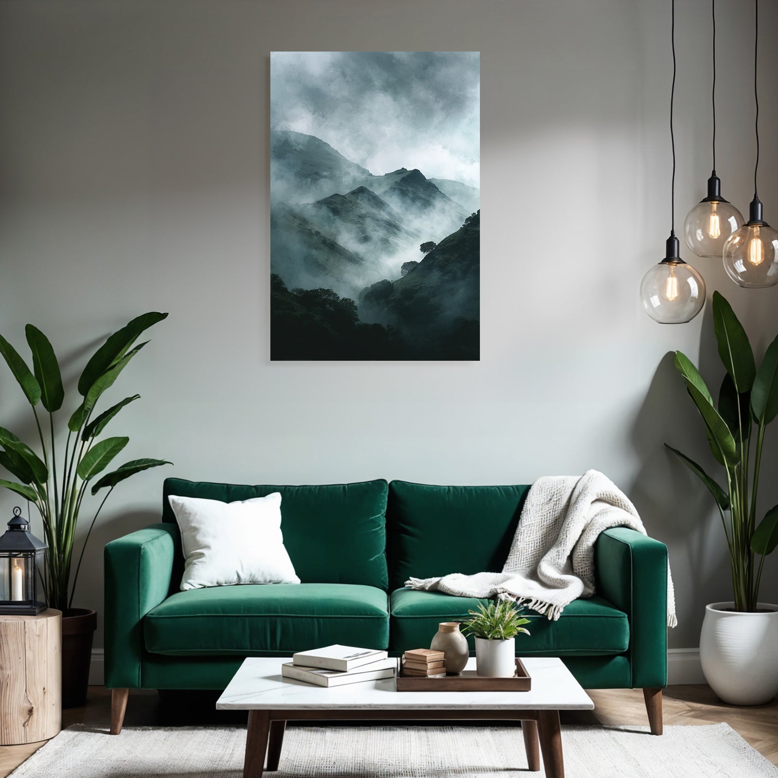 Ob Flur, Wohnraum oder Wartebereich – das Motiv „Nebelverhangene Dunkelgrüne Berglandschaft“ im Stil Nebel und Wetter wirkt durch den hochwertigen FameFrame besonders modern.