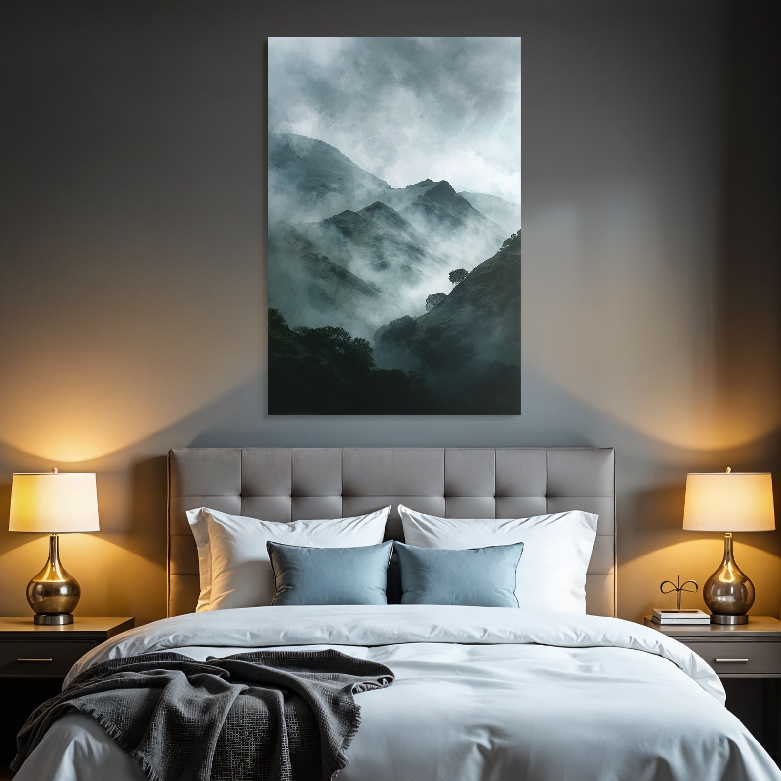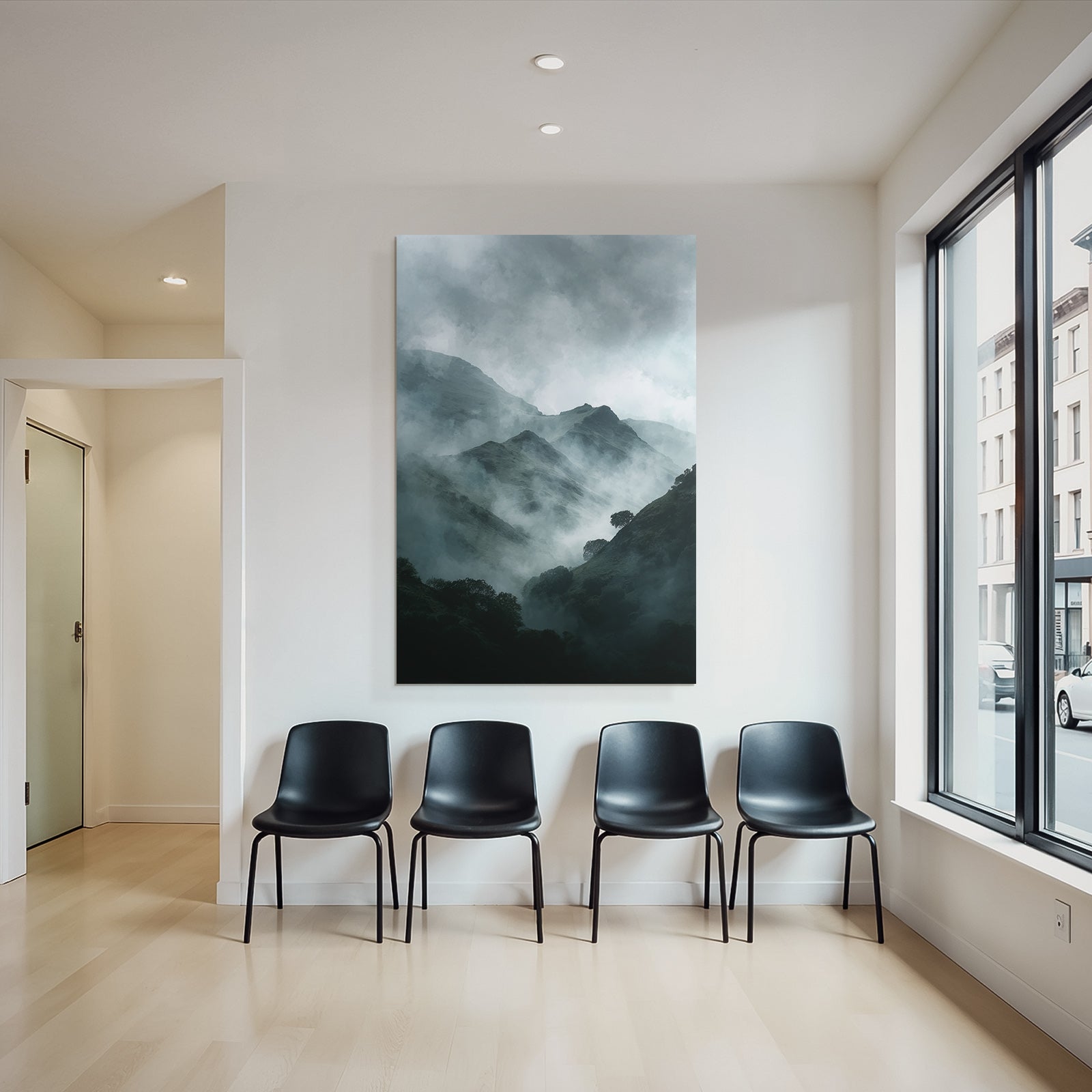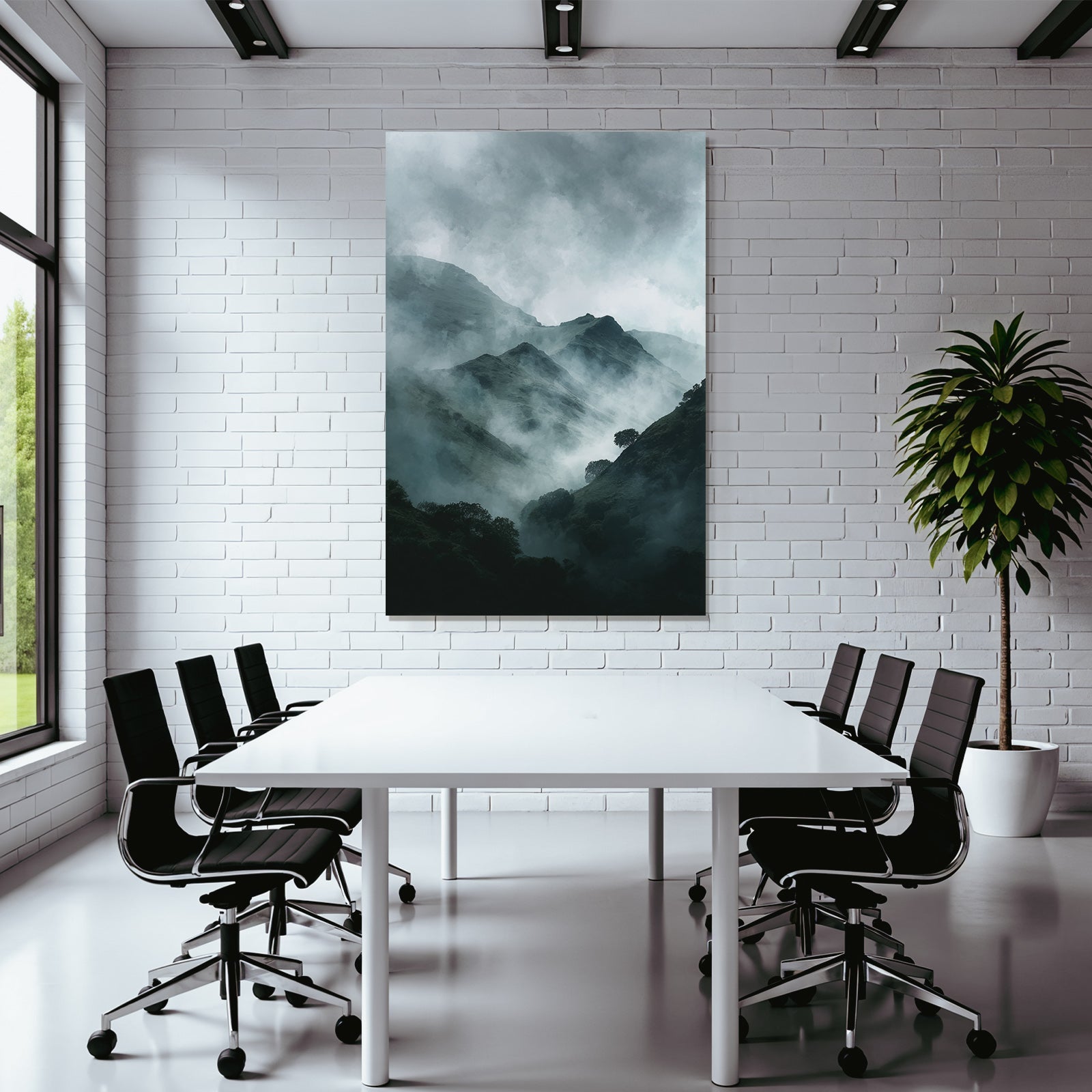 Ob Flur, Wohnraum oder Wartebereich – das Motiv „Nebelverhangene Dunkelgrüne Berglandschaft“ im Stil Nebel und Wetter wirkt durch den hochwertigen FameFrame besonders modern.