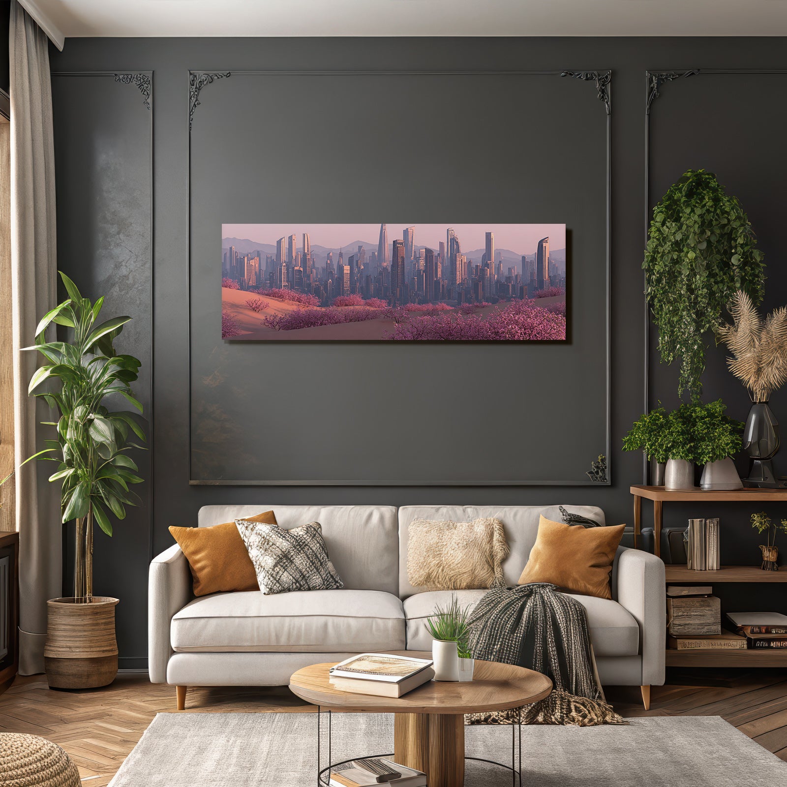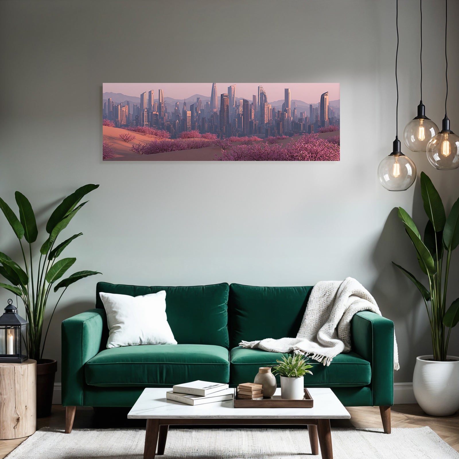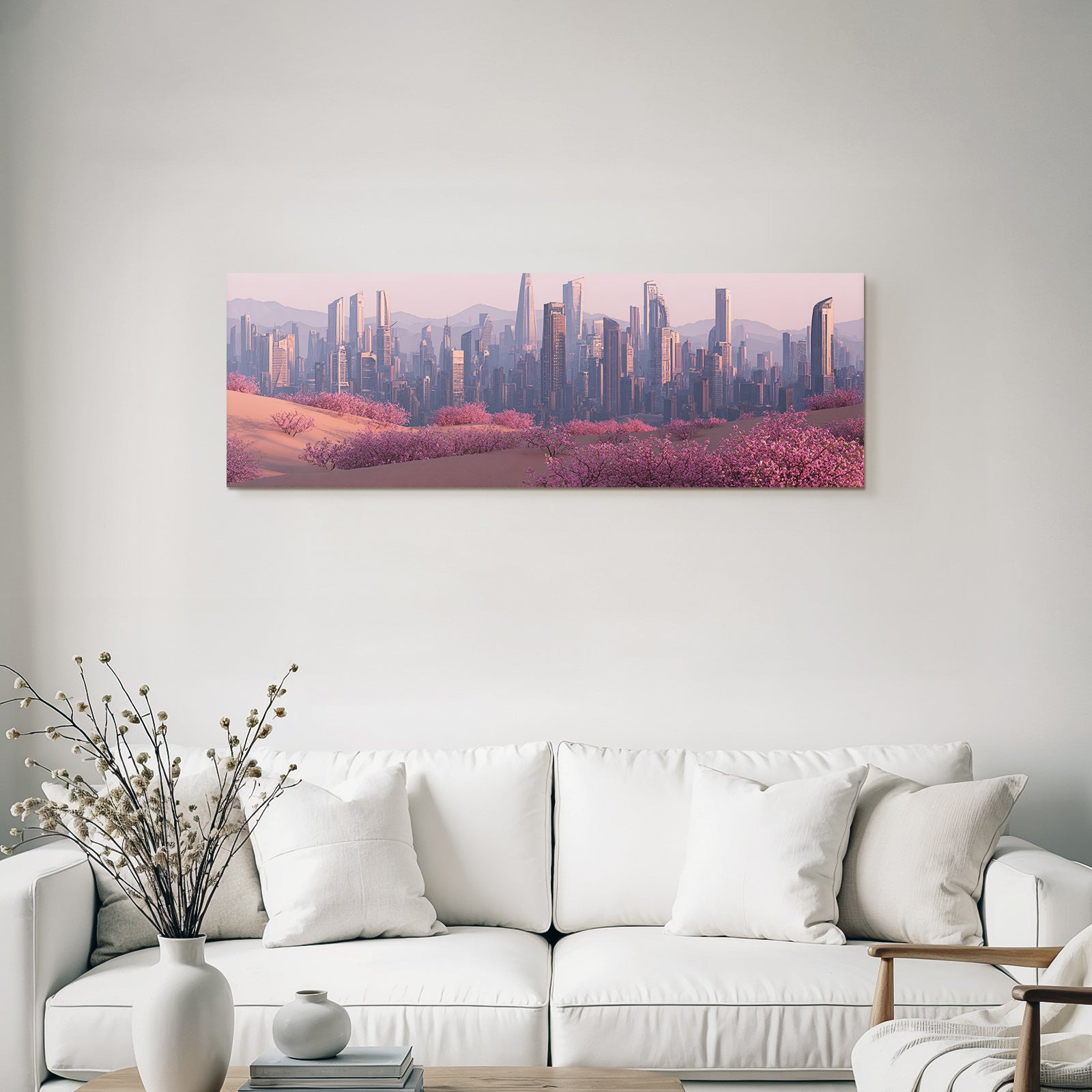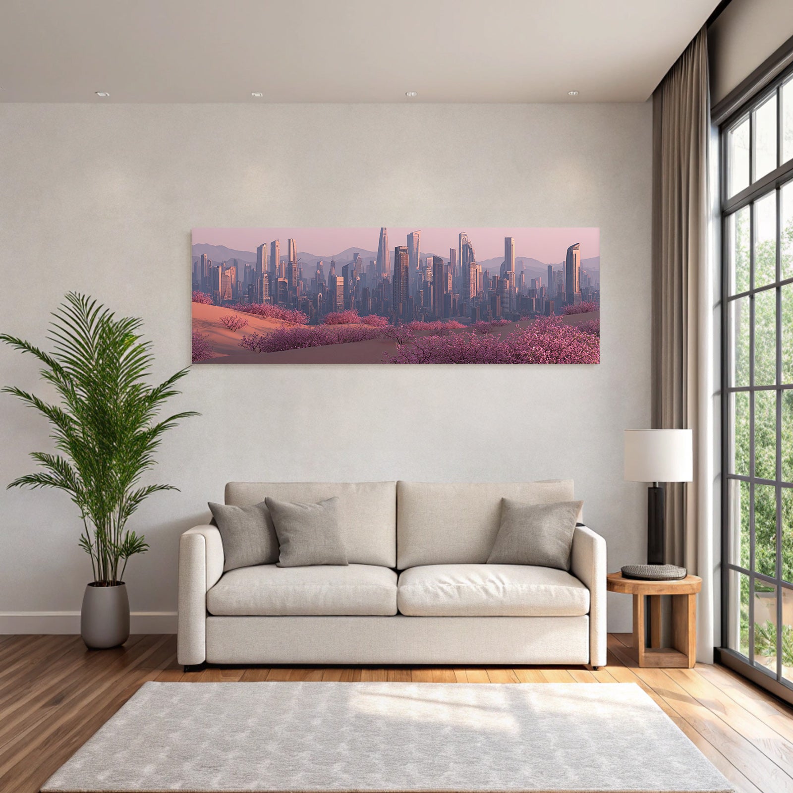 Setz ein Statement: „Futuristische Stadtlandschaft Mit Blumenbaum Und Bergen“ im Stil Dünen und Heide wird im FameFrame™ zum echten Kunstobjekt an Deiner Wand.