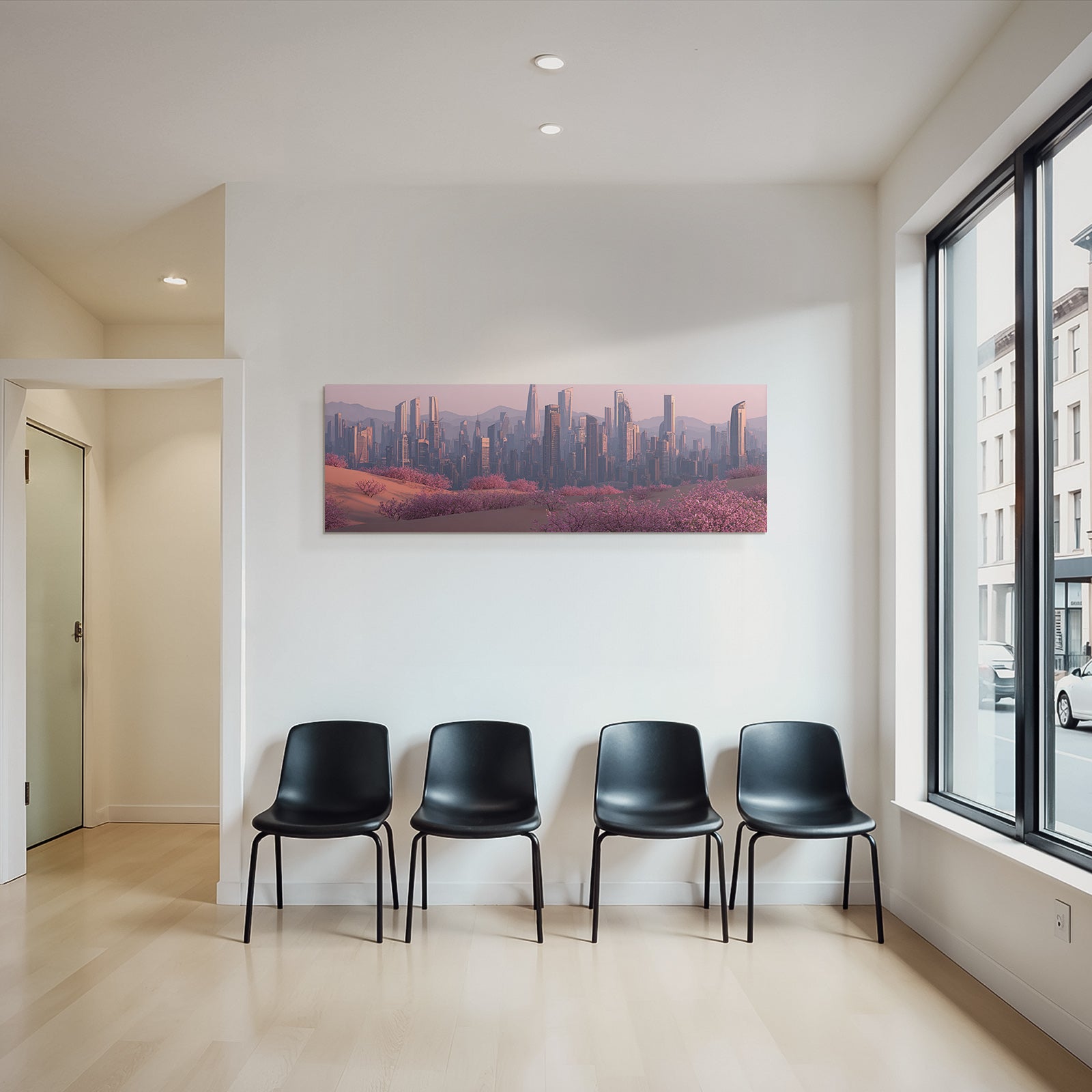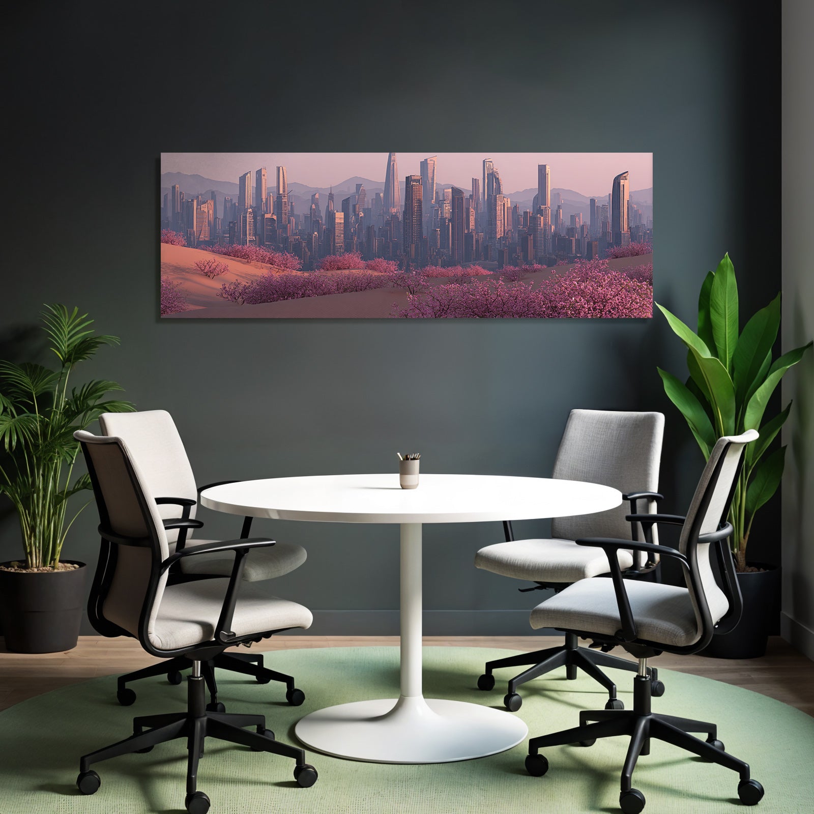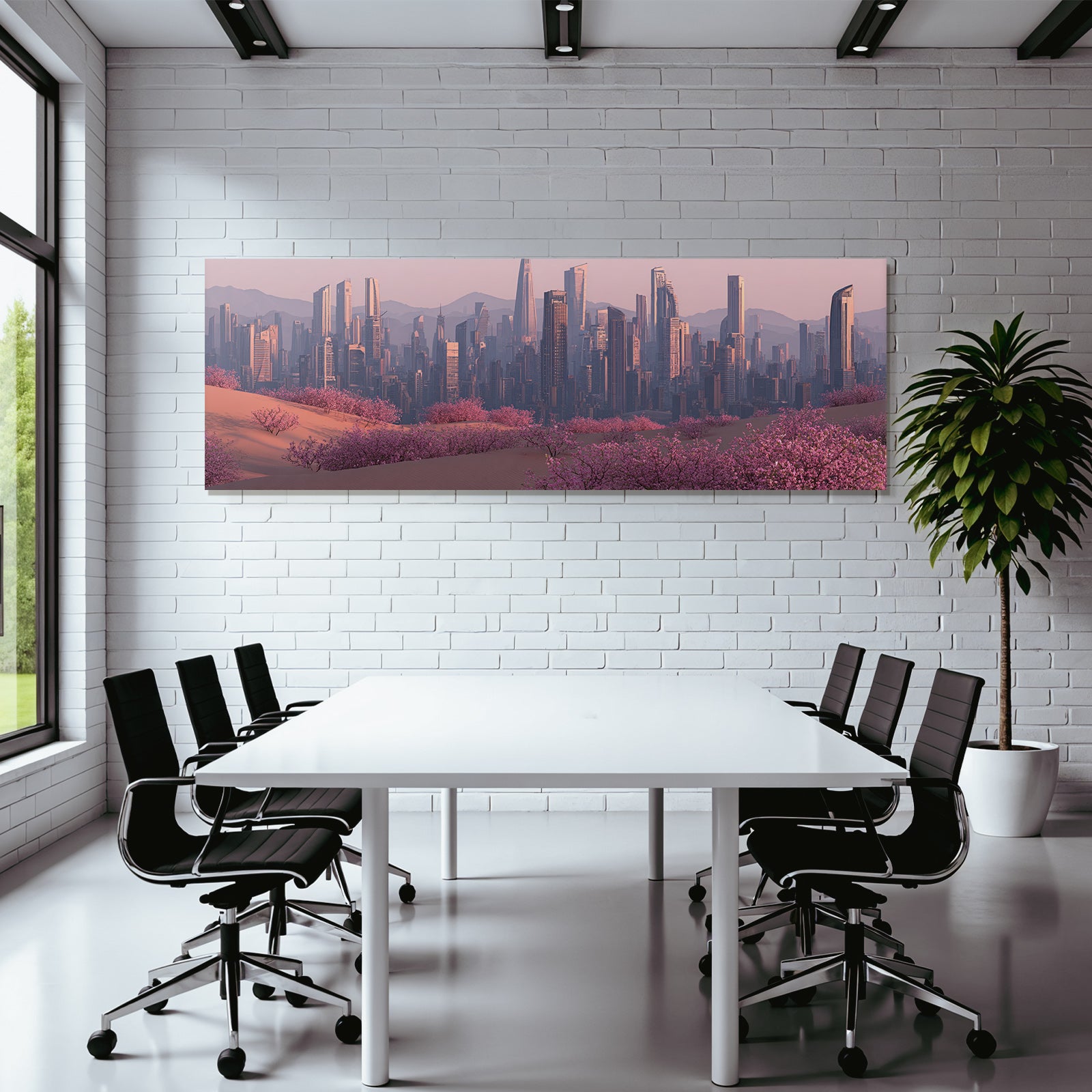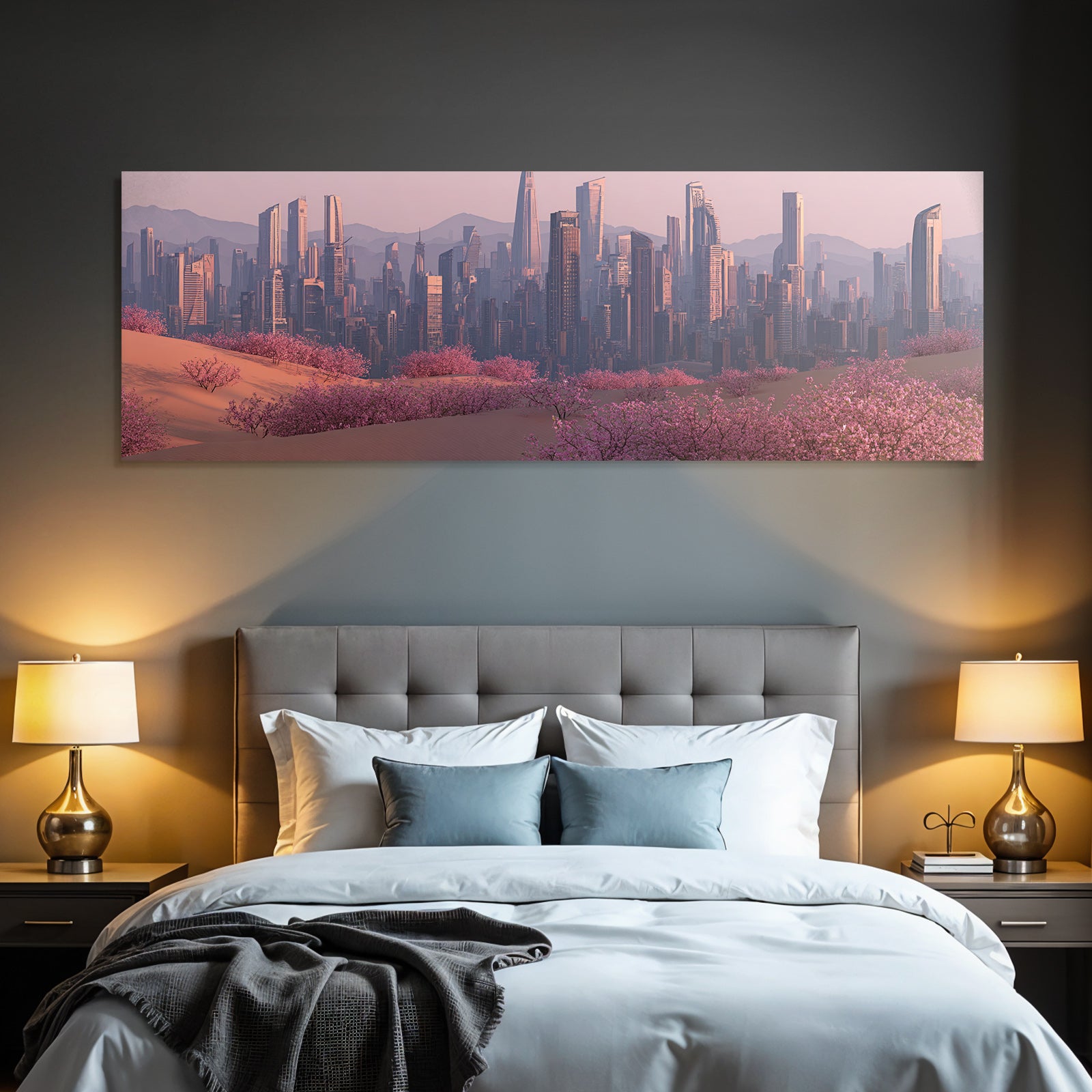 Setz ein Statement: „Futuristische Stadtlandschaft Mit Blumenbaum Und Bergen“ im Stil Dünen und Heide wird im FameFrame™ zum echten Kunstobjekt an Deiner Wand.