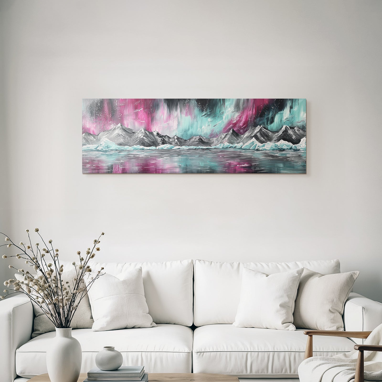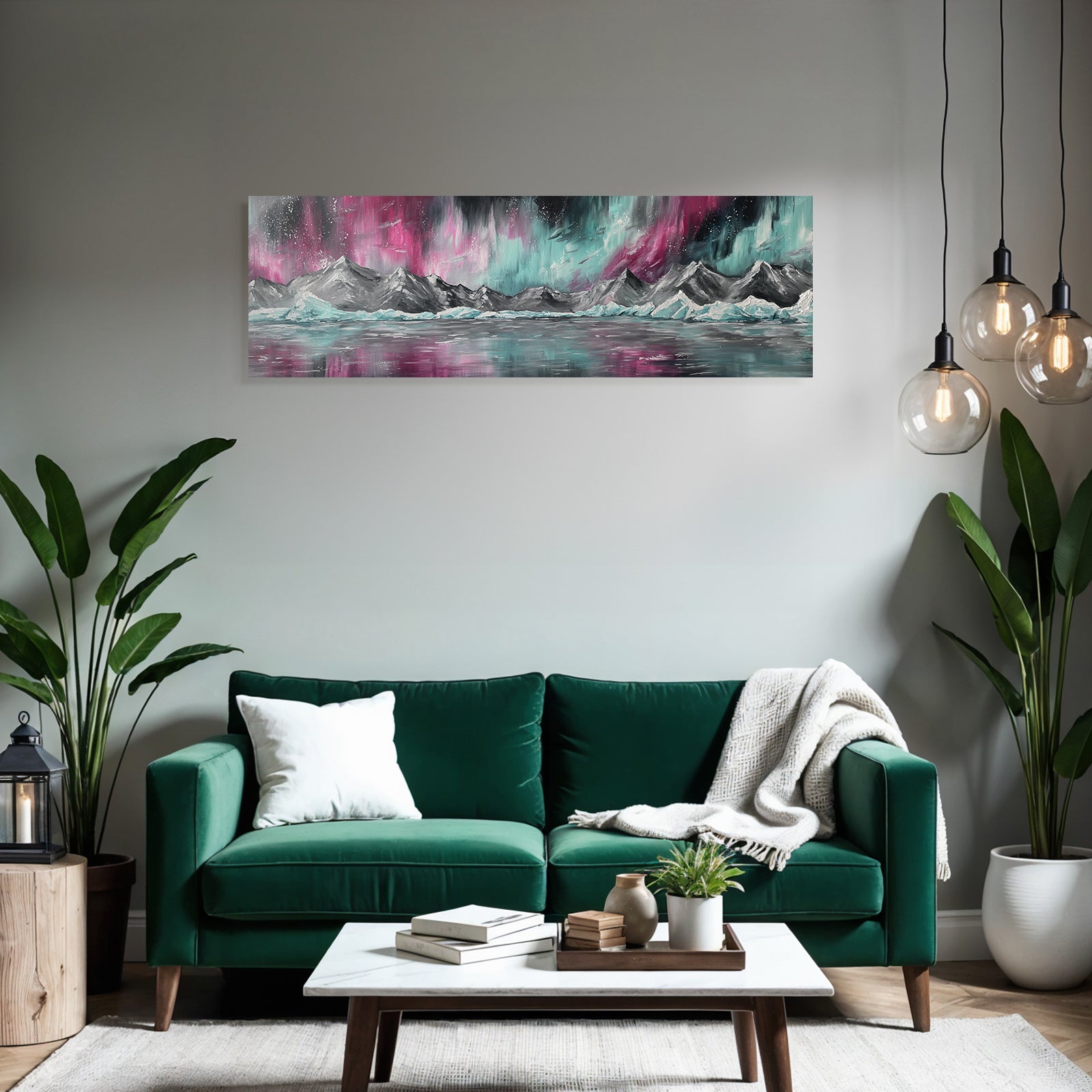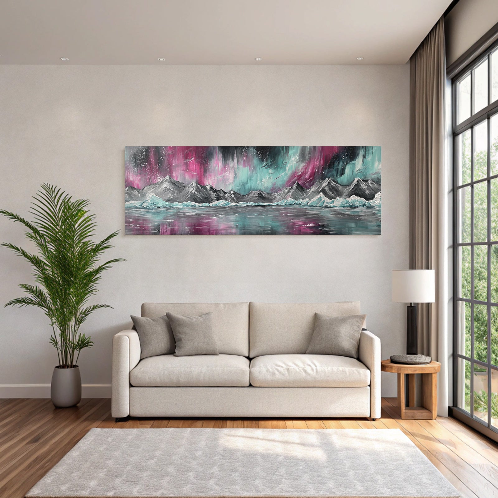 Ob im Wohnzimmer oder Essbereich – das Werk „Polarlicht Abstraktes Landschaftsgemälde Mit Bergen Eis Und Vibrantem Himmel“ im Stil Fjorde und Gletscher wird im FameFrame™ zum stilvollen Blickfang.