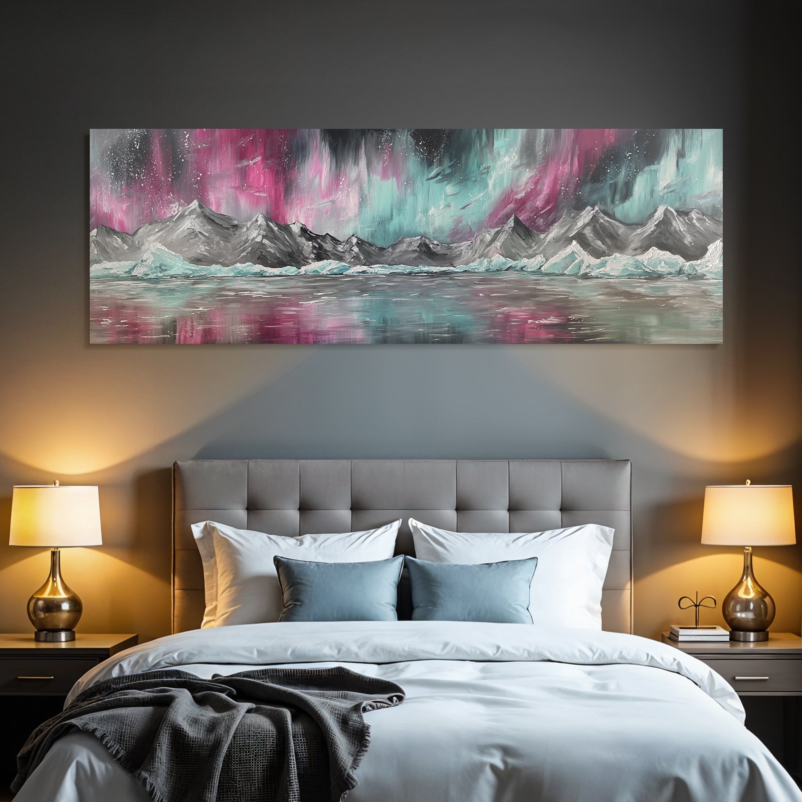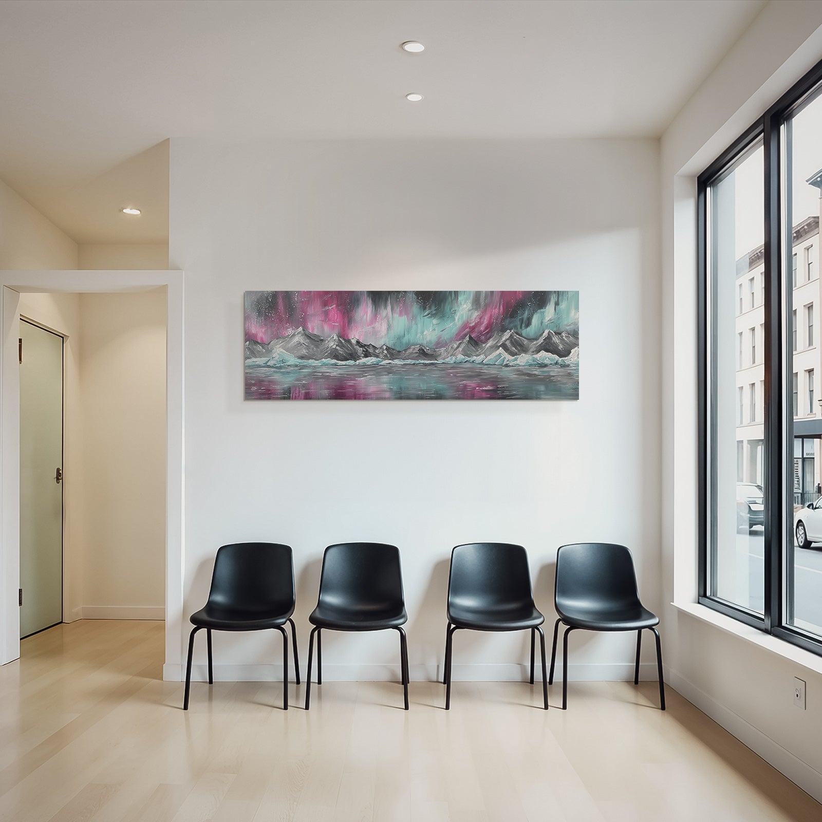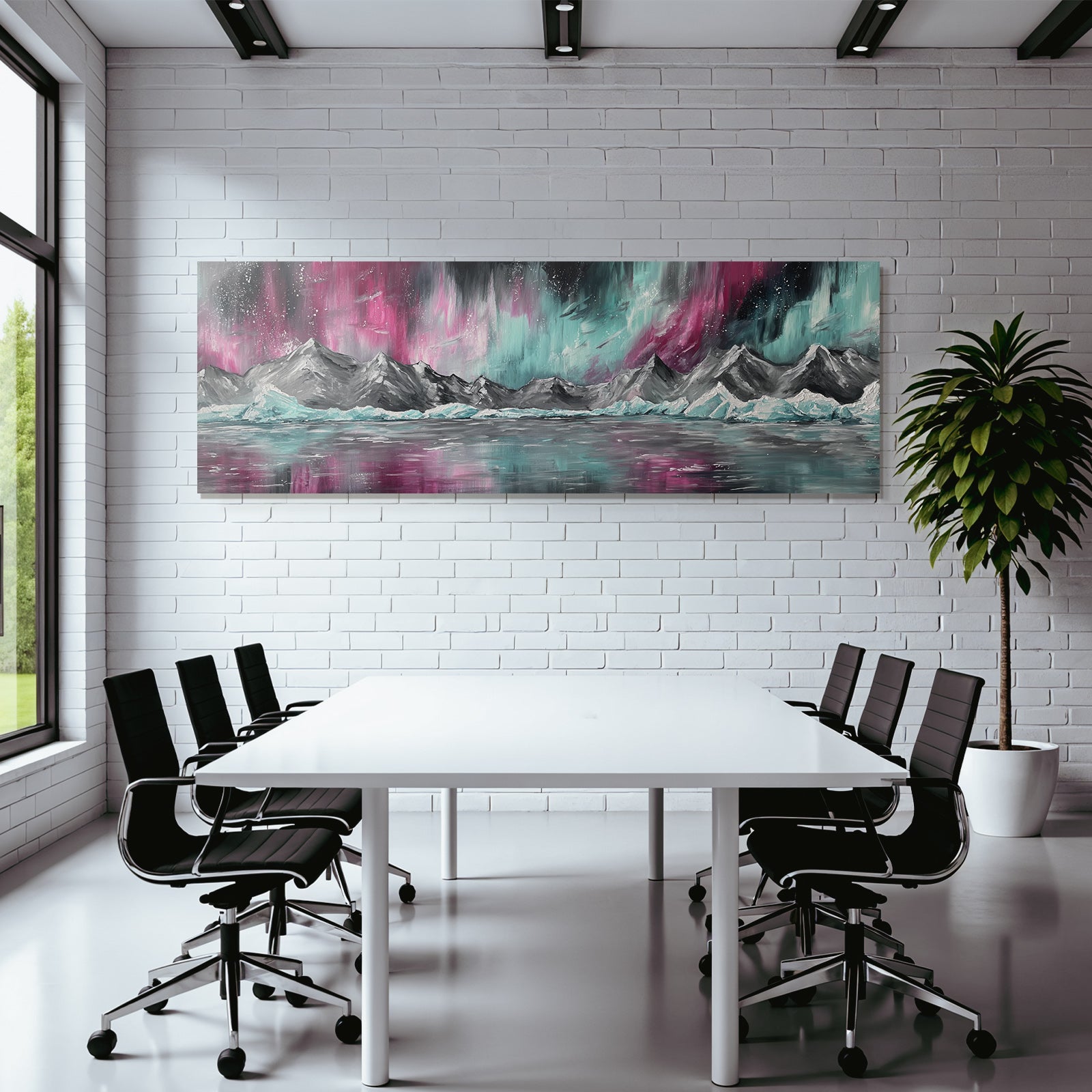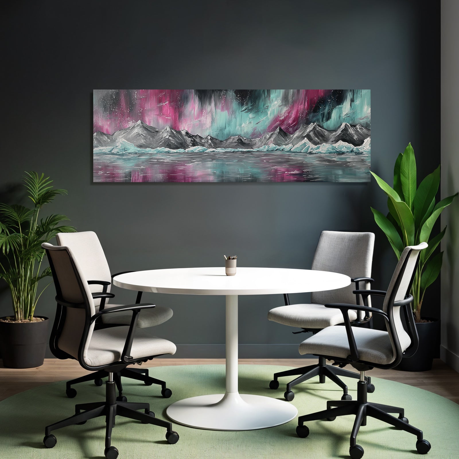 Ob im Wohnzimmer oder Essbereich – das Werk „Polarlicht Abstraktes Landschaftsgemälde Mit Bergen Eis Und Vibrantem Himmel“ im Stil Fjorde und Gletscher wird im FameFrame™ zum stilvollen Blickfang.