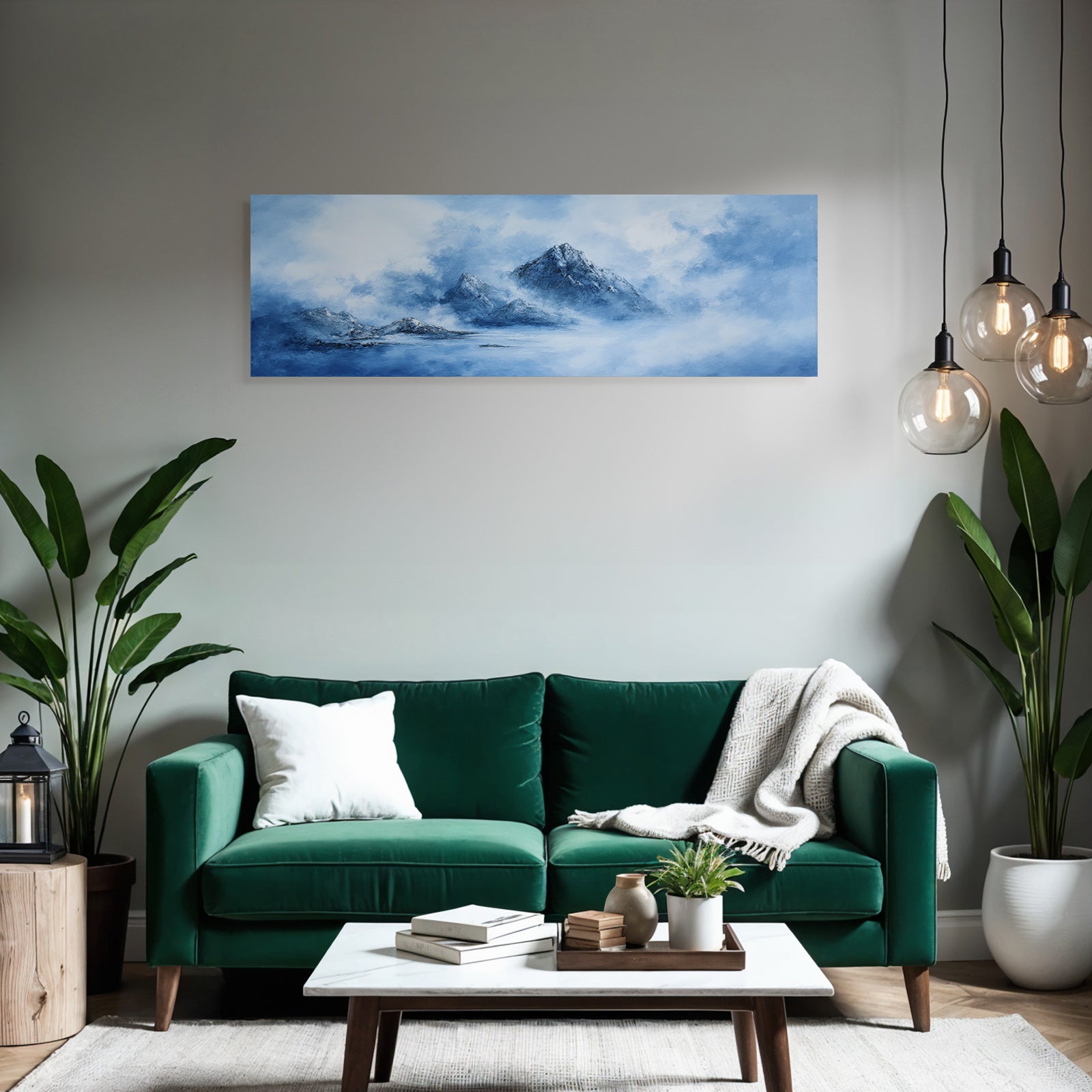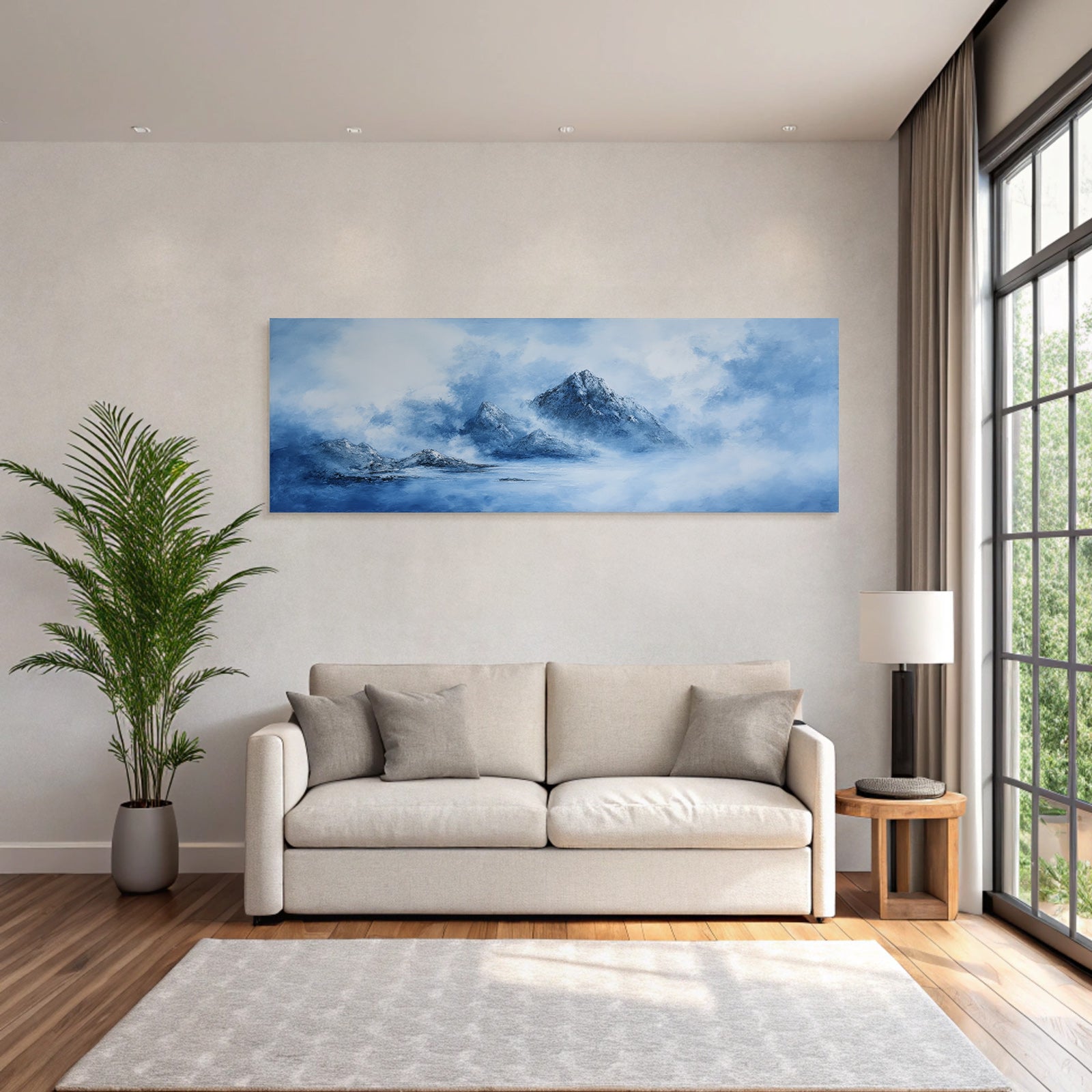 Tauchen Sie ein in die Welt von Fjorde und Gletscher. Das Motiv „Polarlicht Ruhige Landschaft Mit Blaün Bergen Mit Nebel“ ist ein herausragendes Beispiel dieses Stils, das im FameFrame™ eine besondere Tiefe erhält.