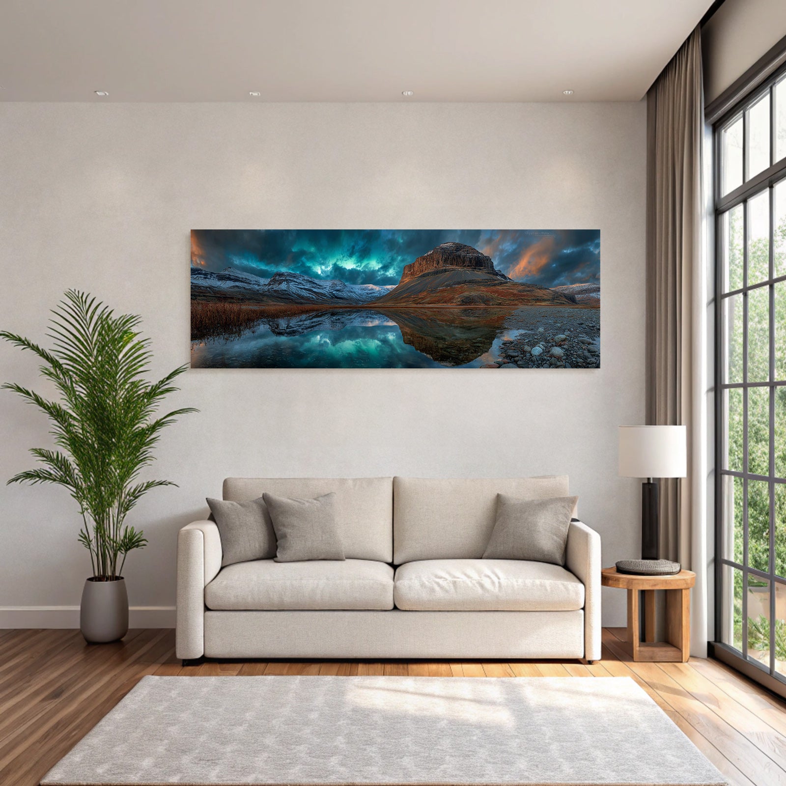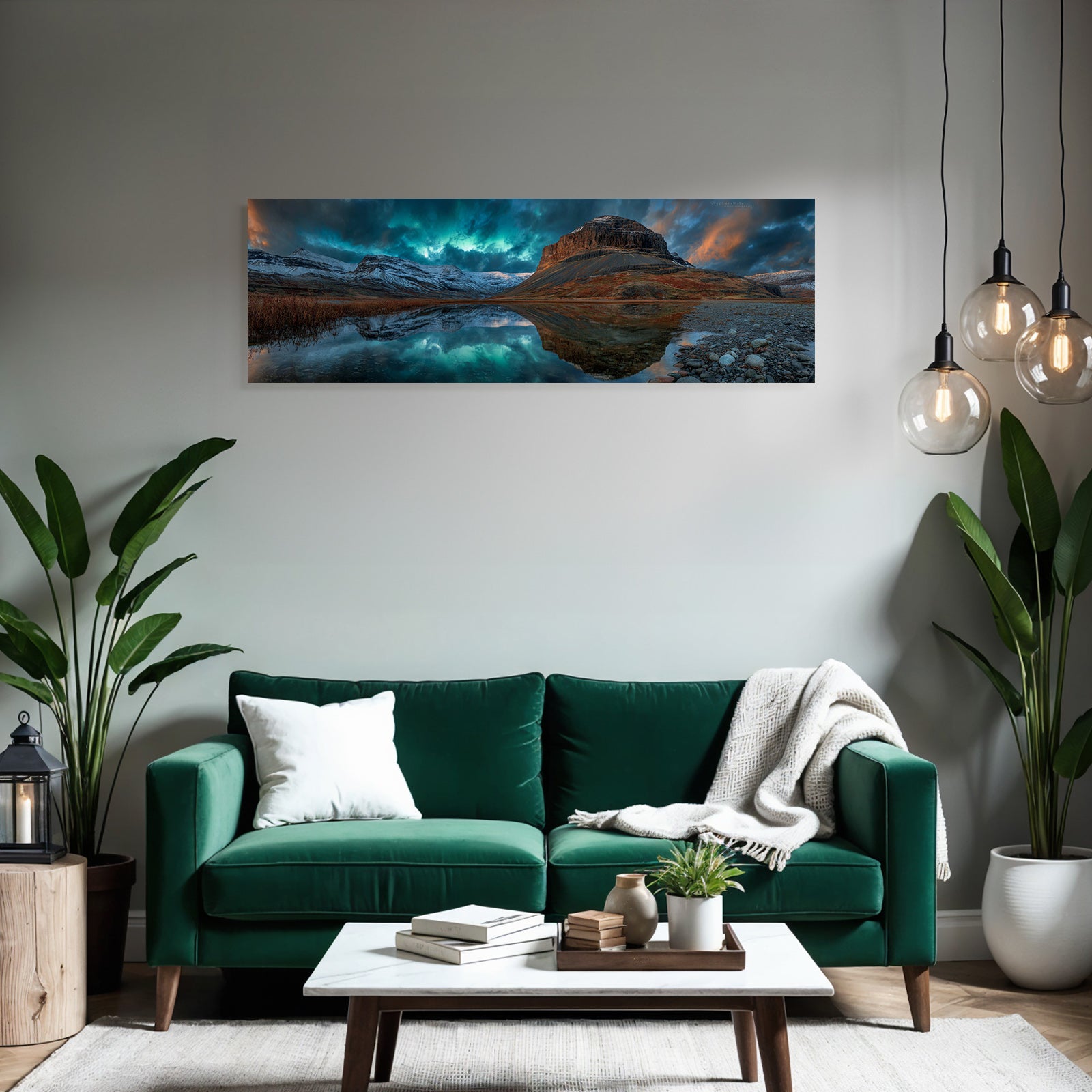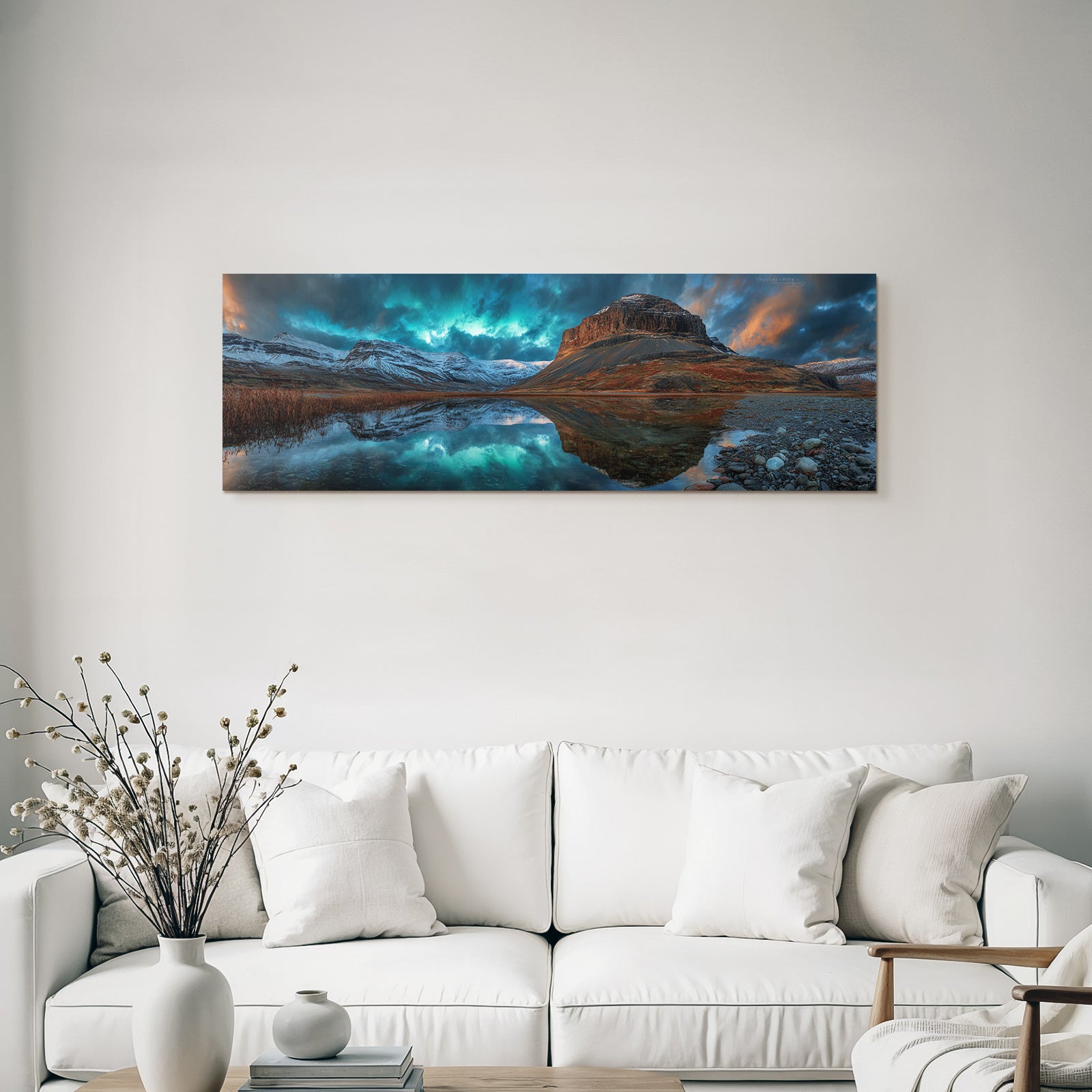 Bring die Atmosphäre von Fjorde und Gletscher in Dein Zuhause – mit „Polarlicht Stimmungsvolle Landscape Foto Mountains Schnee Und Reflexion“ auf Stoff im austauschbaren FameFrame™.