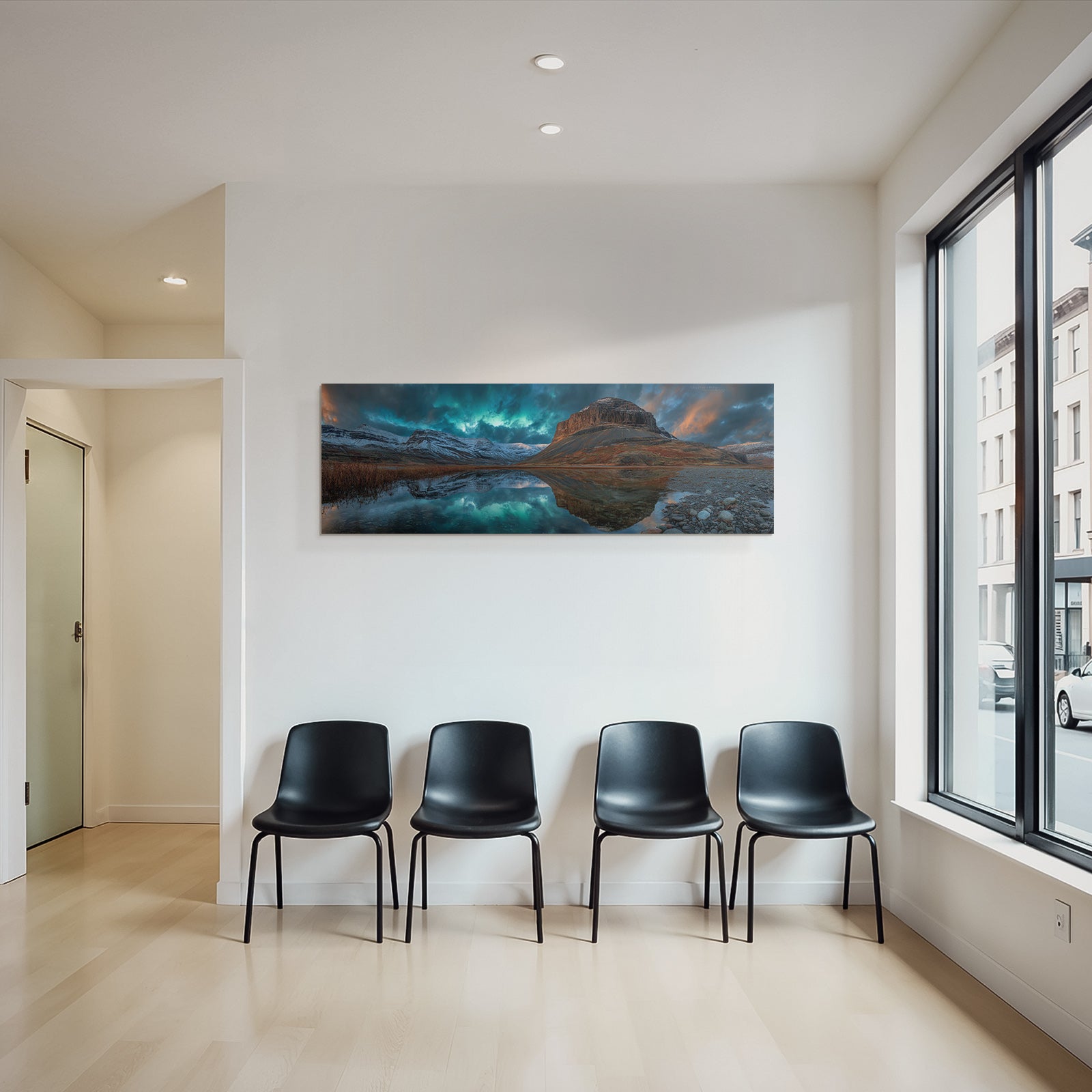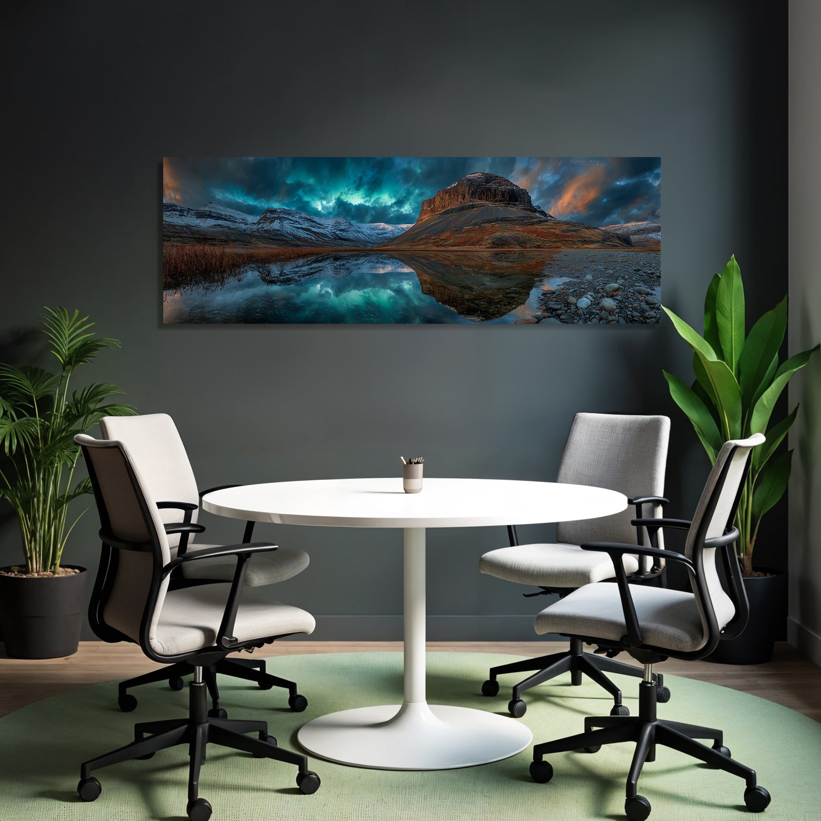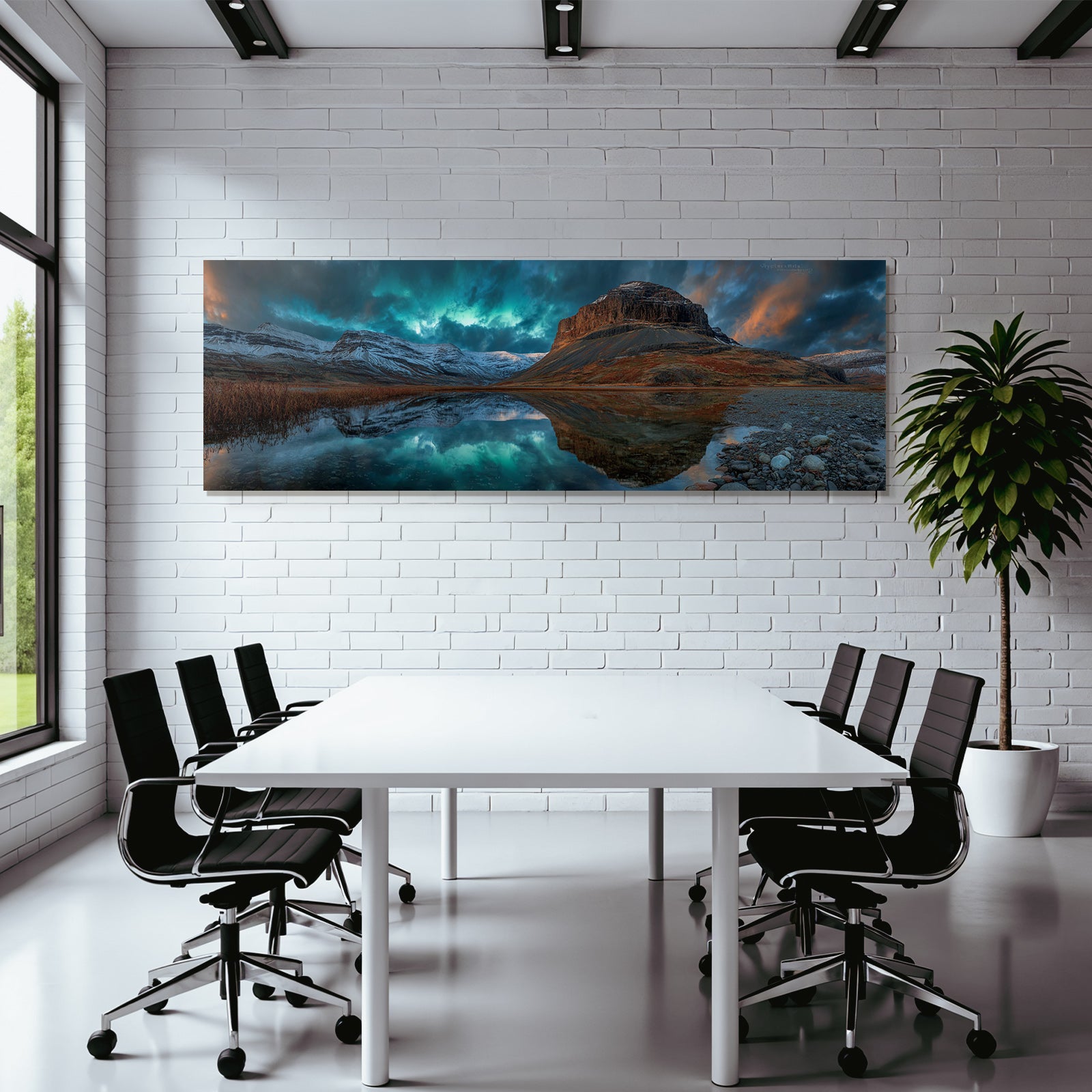 Bring die Atmosphäre von Fjorde und Gletscher in Dein Zuhause – mit „Polarlicht Stimmungsvolle Landscape Foto Mountains Schnee Und Reflexion“ auf Stoff im austauschbaren FameFrame™.